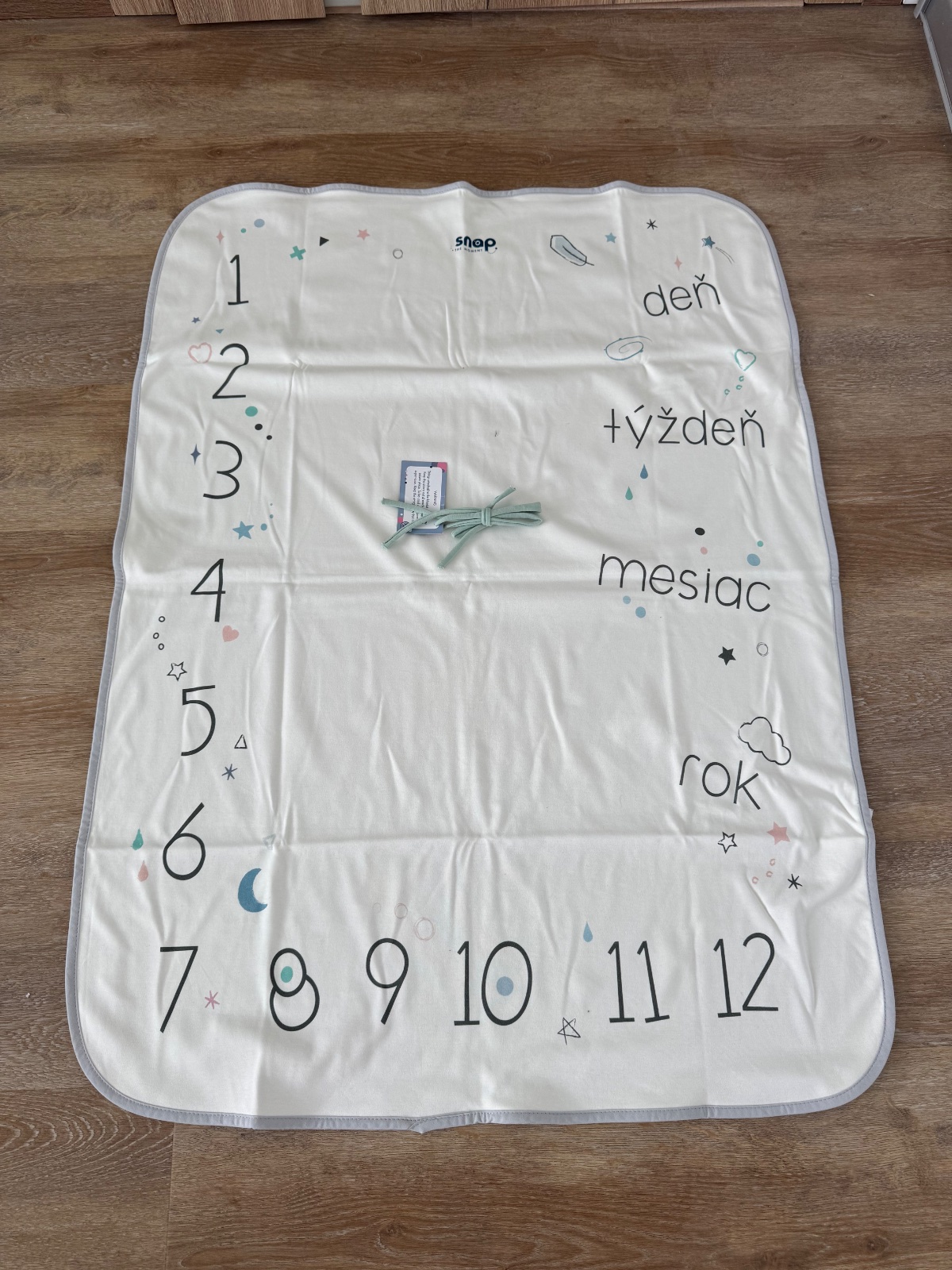 Obojstranná fotografická deka rastie s vašim bábätkom. Perfektne poslúži na dokumentovanie jeho veku - stačí zakrúžkovať deň, mesiac alebo rok pomocou bavlnených pásikov, položiť drobčeka na deku a cvaknúť. Pastelové farby s jemnými vzormi pôsobia príjemne a sú ideálnym podkladom na fotenie. Deka je vyrobená z mäkkej bavlny, má antibakteriálny povrch a dieťaťu tak prináša maximálne pohodlie. S obľubou ju bude používať až do predškolského veku.Materiály, z ktorých je deka vyrobená, majú certifikát kvality a bezpečnosti Oeko-Tex 100. Spĺňajú prísne medzinárodné kritériá pre kvalitu a zdravotnú nezávadnosť, sú bezpečné a neobsahujú žiadne zdraviu a životnému prostrediu škodlivé alebo nebezpečné látky. Originálny dar do výbavy čerstvých rodičov! Balenie obsahuje: + Obojstrannú deku + Dva pásky na vyznačenie veku dieťaťa. Tá najmilšia deka pre vaše bábätko Rozmer: 100 x 88 mm Materiál: bavlna