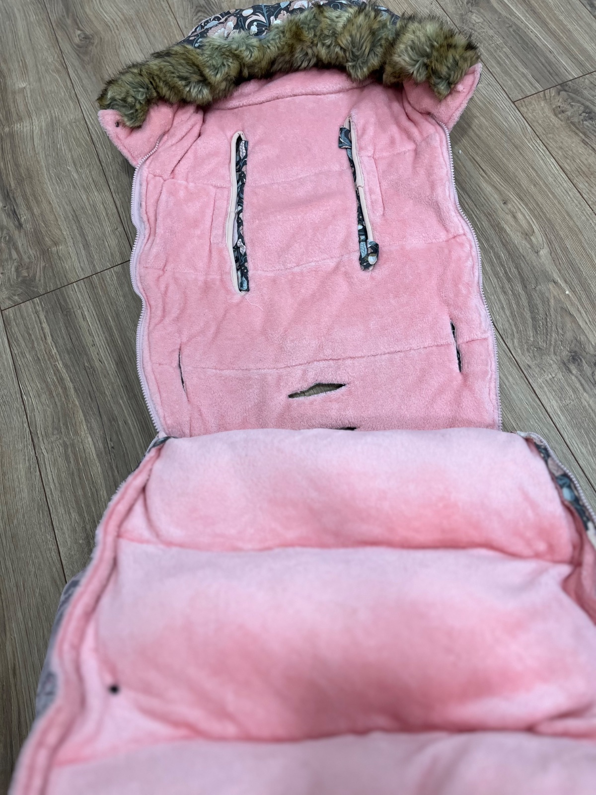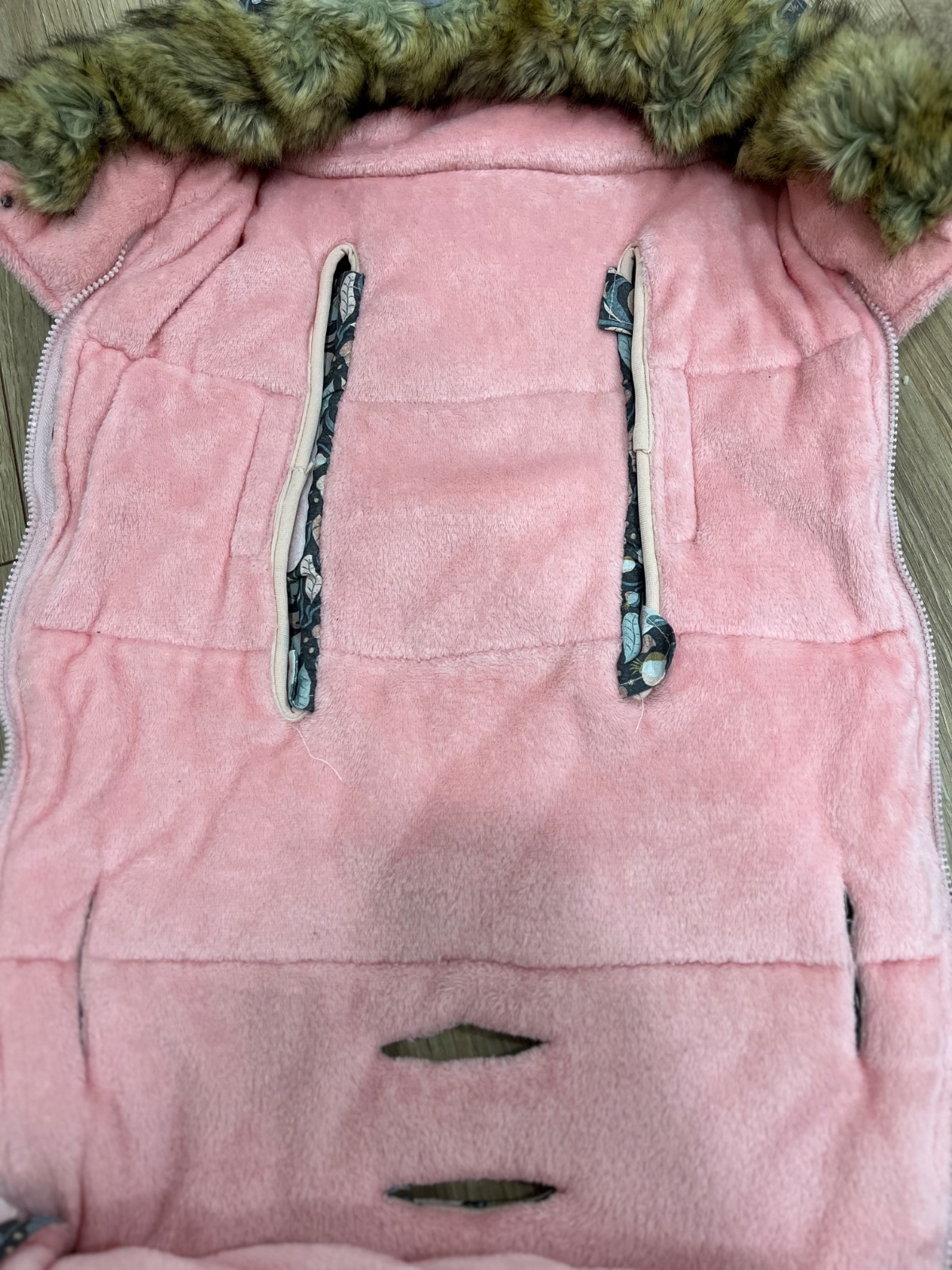 Predam zimný fusak v bledo ružovej farbe,používaný jednu zimu, kožušinka sa nedá odopnut, vhodný do kočíka ale aj autosedačky,vzadu sú otvory na popruhy. Cena plus poštovné