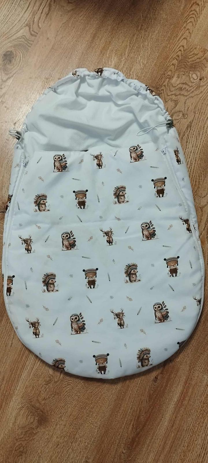 Predám krásny handmade fusak v top stave, málo používaný ako nový, veľmi teplý, na vrchu sa dá uchytiť o sedadlo kočíka, vnútri je krásna smaragdová farba, cena spolu s rukavnikmi