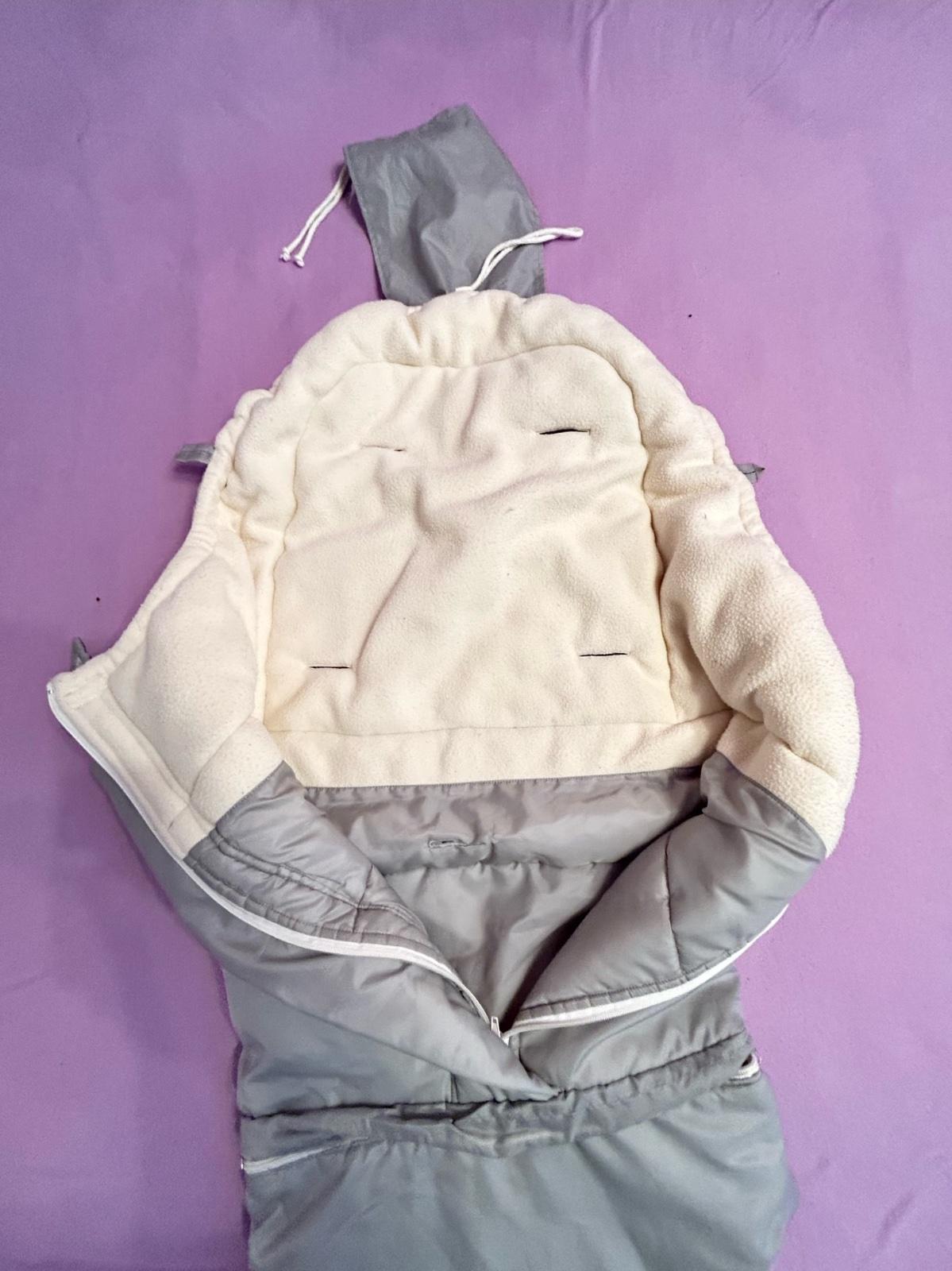 Predám zimný fusak do kočíka alebo do autosedačky. Spodnú časť je možné odzipsovať. Celková dĺžka je 99 cm, šírka navrchu v najširšom bode je 50 cm.