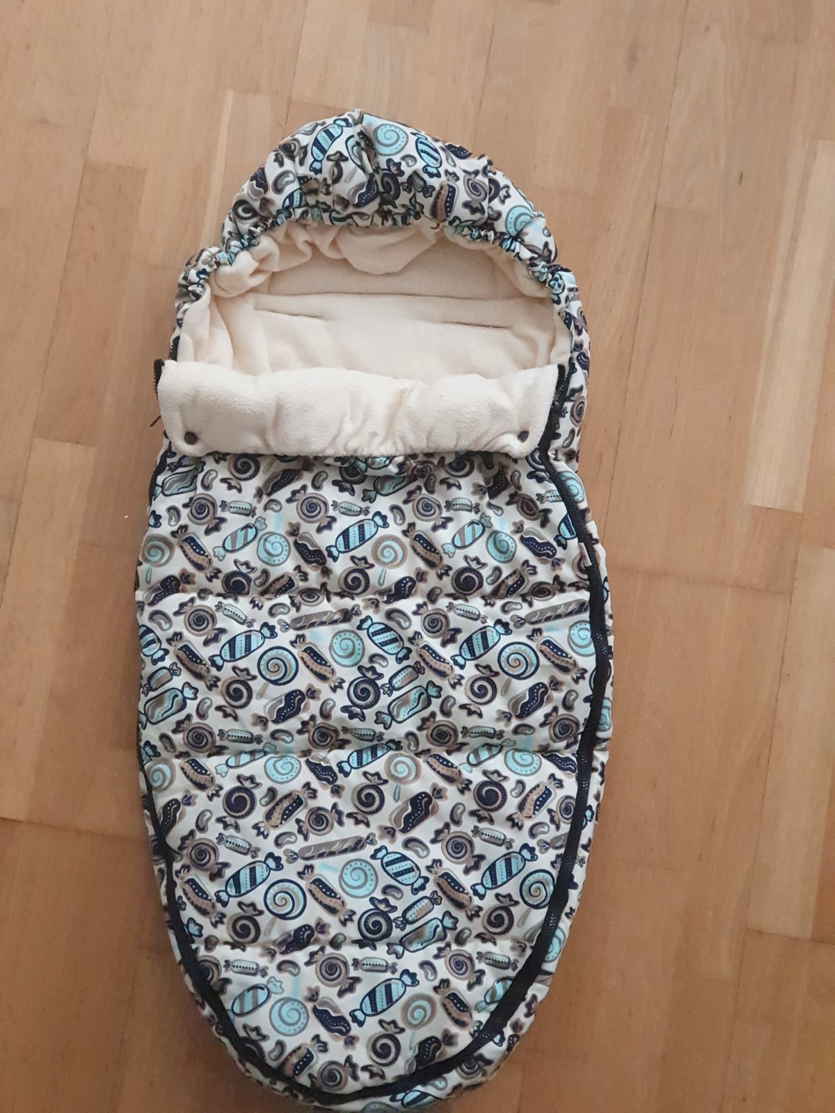 Hrubý fusak, z vonka nepremokavá kočiarkovina, z vnútra teplé fleece, da sa celý odomknúť, upevniť na rôzne druhy pásov, vhodny do hlbokeho kočiku aj do športoveho.je dosť veľký Vhodny pre chlapca aj dievča.