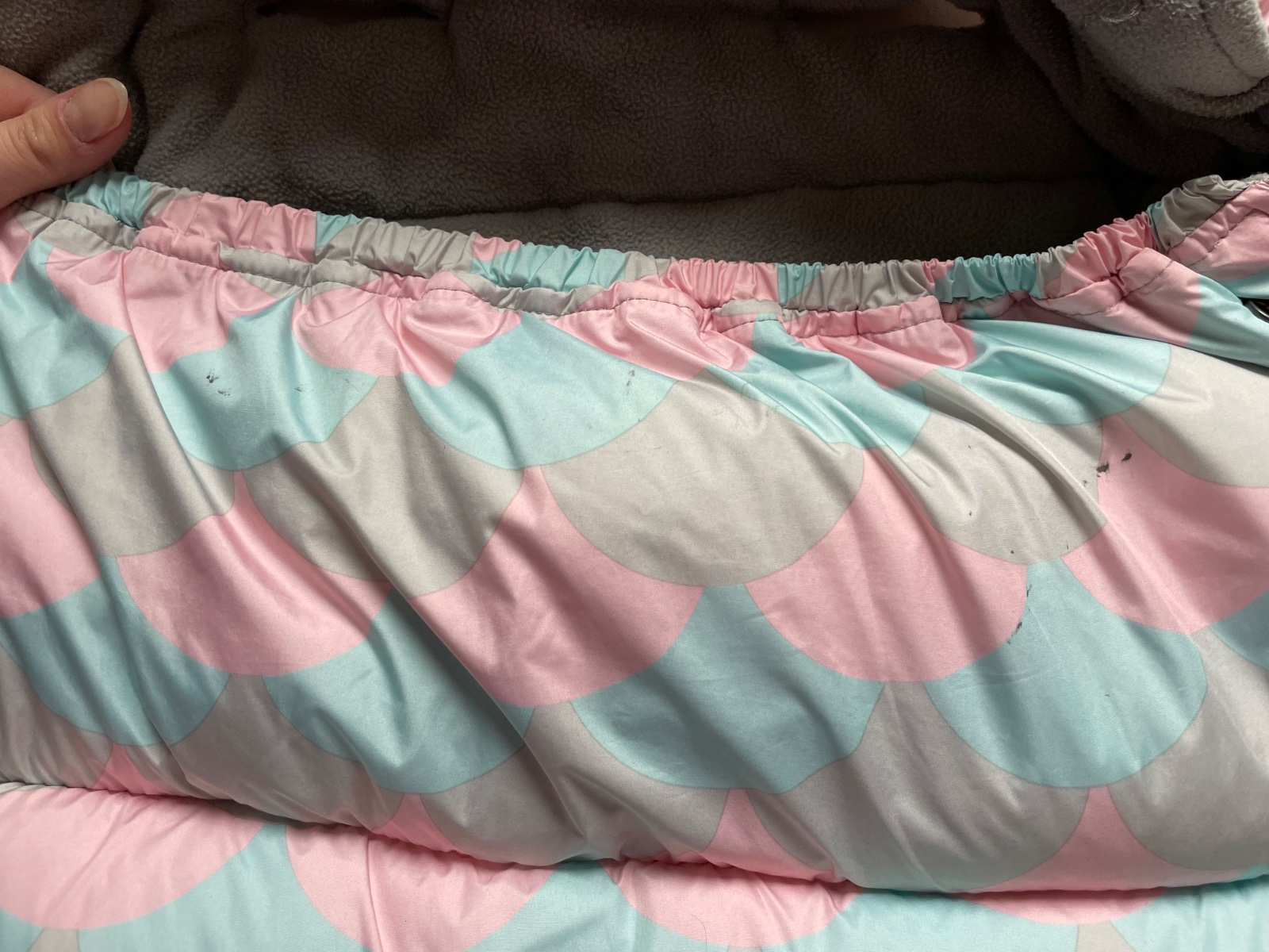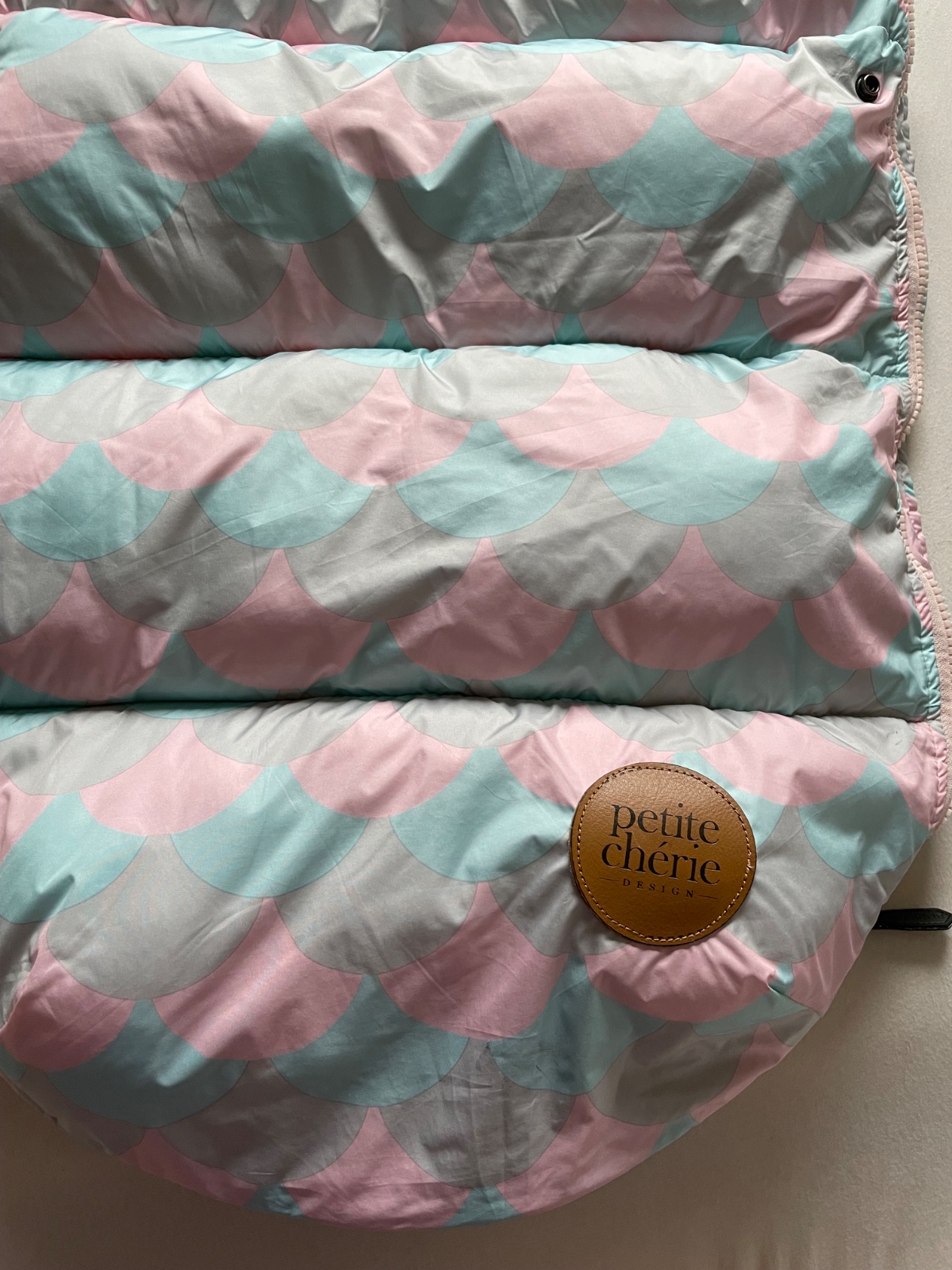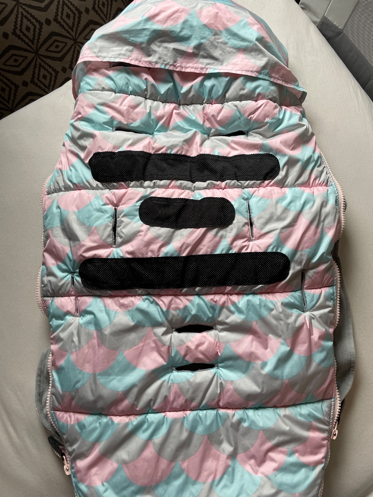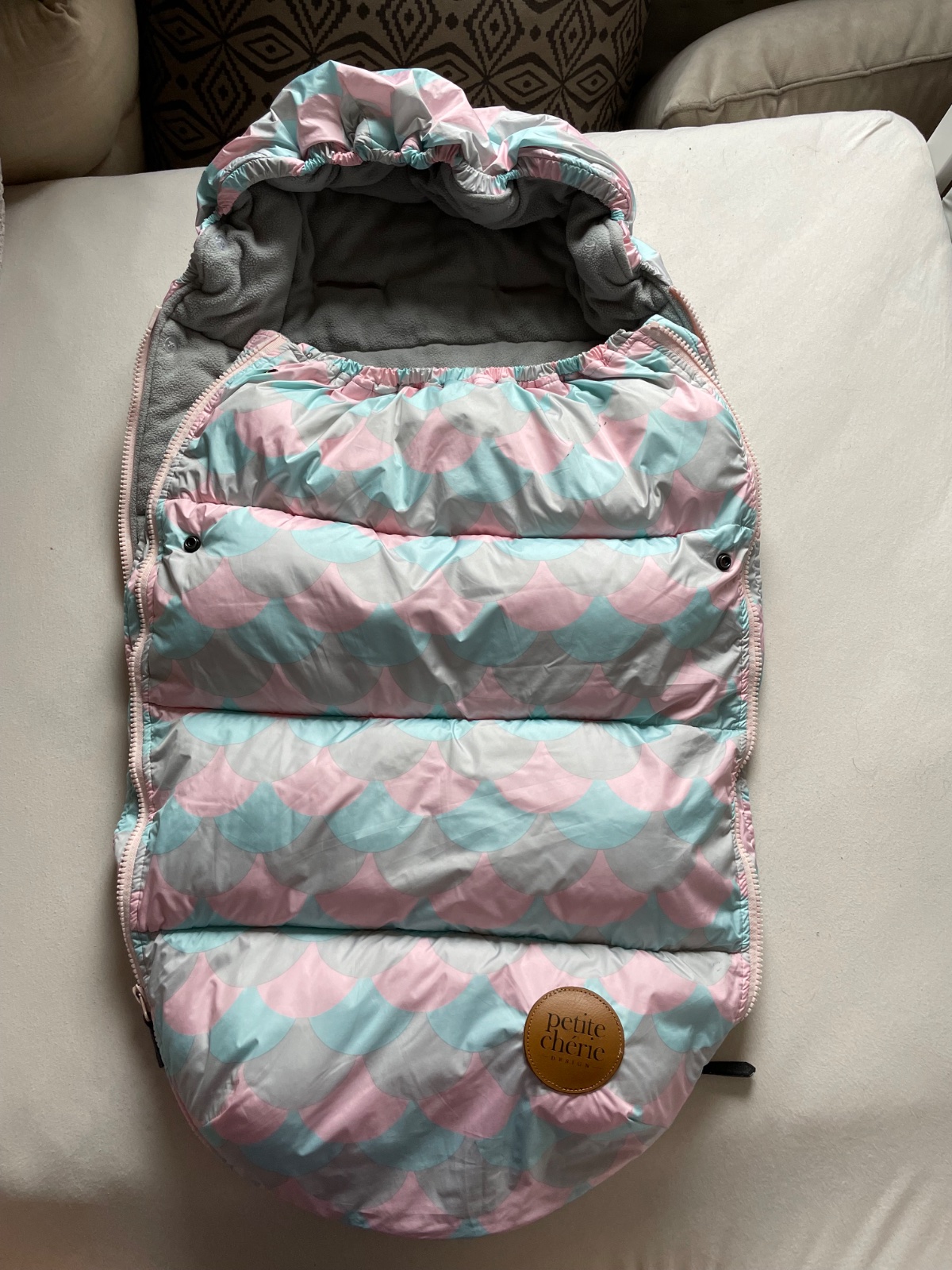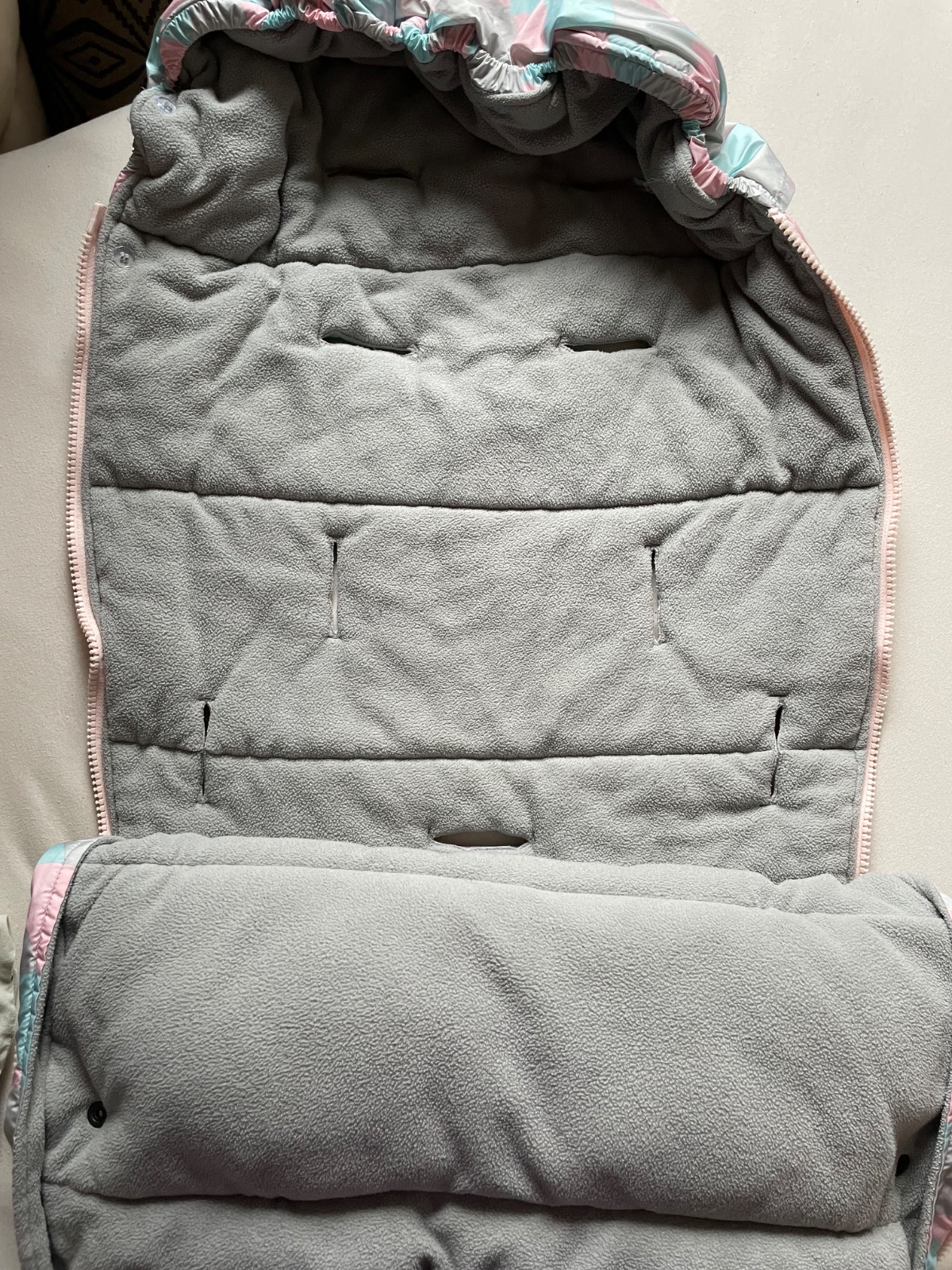 Fusak je švédskej značky Petite Chérie. Je teplý a vhodný na zimu. Farebná kombinácia bledoružová a bledomodrá sú univerzálne, vhodné pre dievča alebo chlapca. Zapínanie na zips po celom obvode a cez zad sú otvory na bezpeč.pásy kočiara. Hore a trochu dole (viď.posledné 2foto) sú čierne fliačiky od kočiara, preto je aj nízka cena.