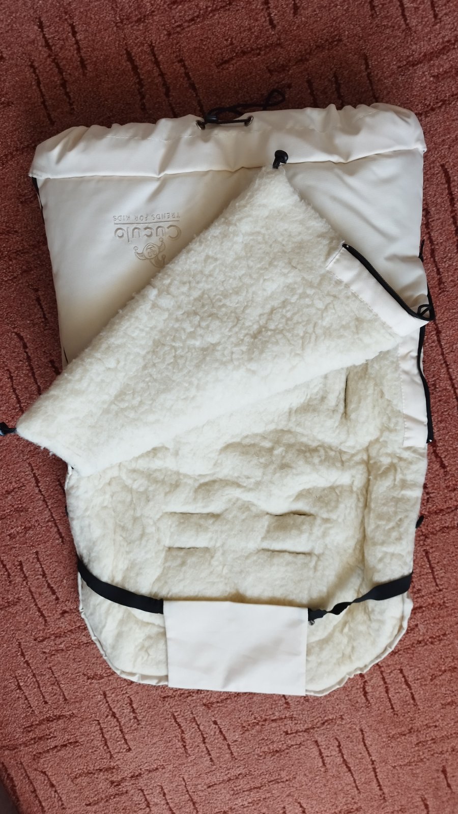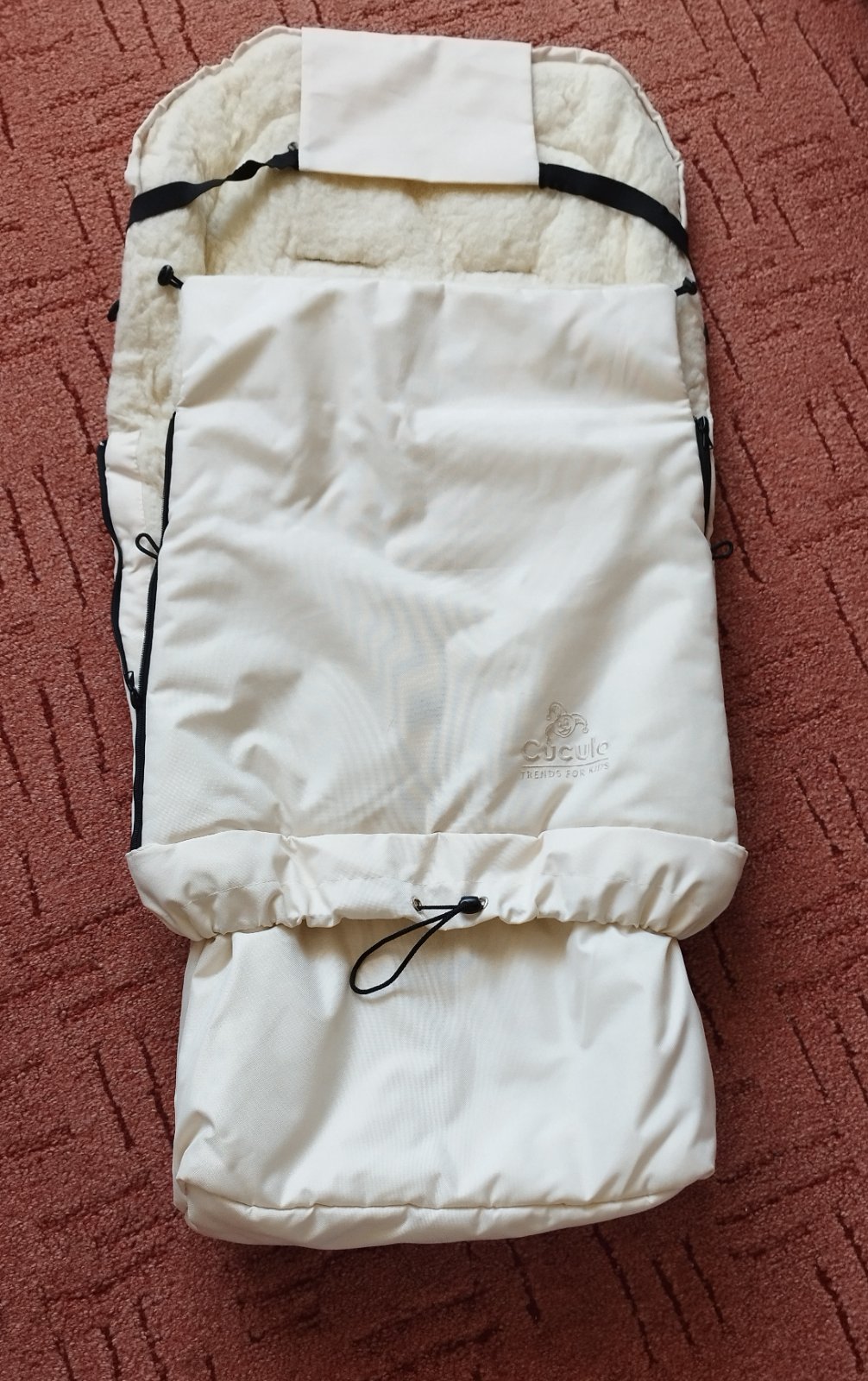 Nádherný, teplucky vak do kočíka. Vo vnútri je ovcia vlna. Je bez známok používania. Celková dĺžka 105cm.