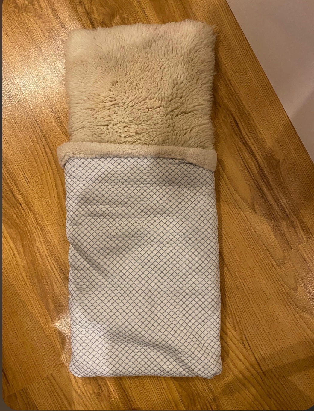 Predám fusak bielo-mentolovej farby. Ako nový. Z vnútra teplý, minky látka. Šírka 42cm a dĺžka od záhybu 54cm.