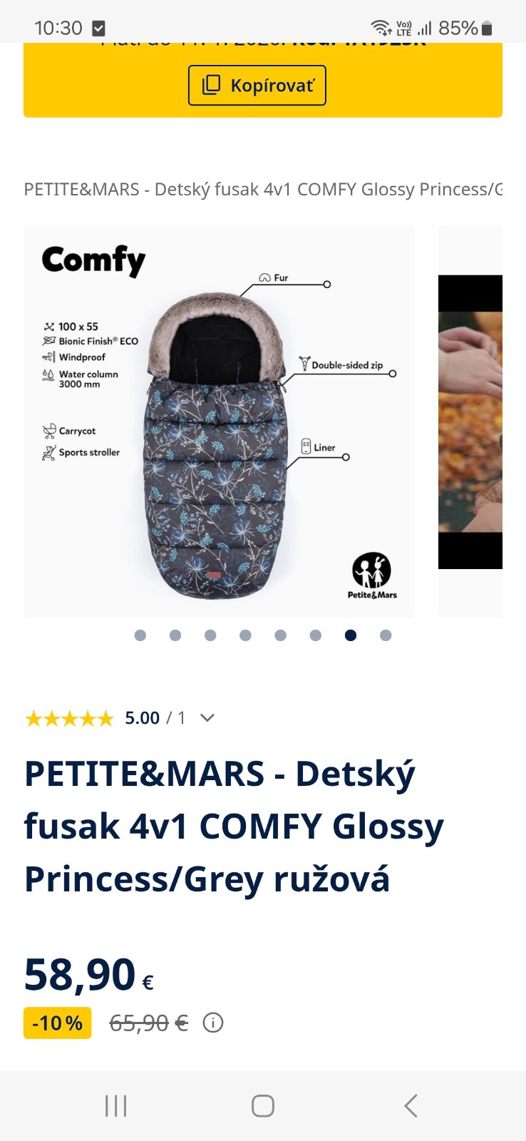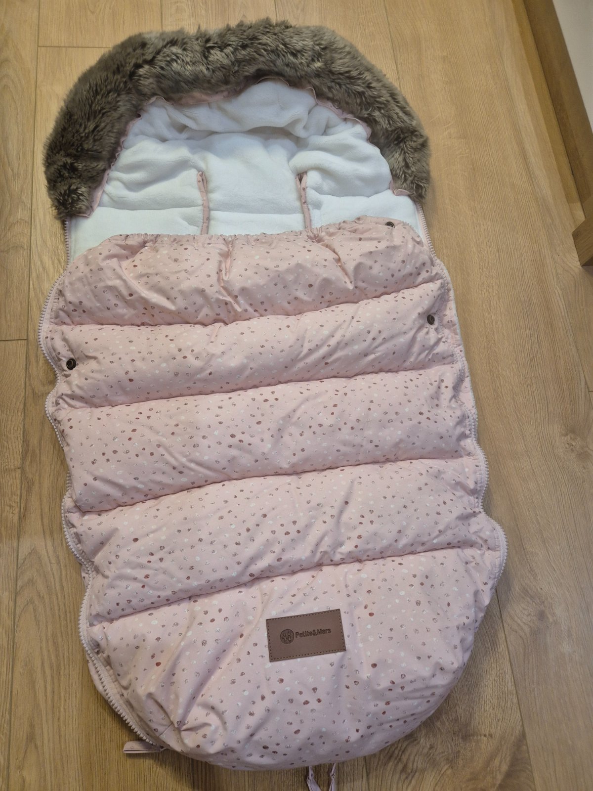 Fusak Petite& Mars. Kombinácia, odnímateľná kožušina. Vhodný do hlbokého aj športového kočíka. Nánožnik odnímateľný pre pohodlie v topánkach. Z nánožníka môže byť taška. Osobný odber.