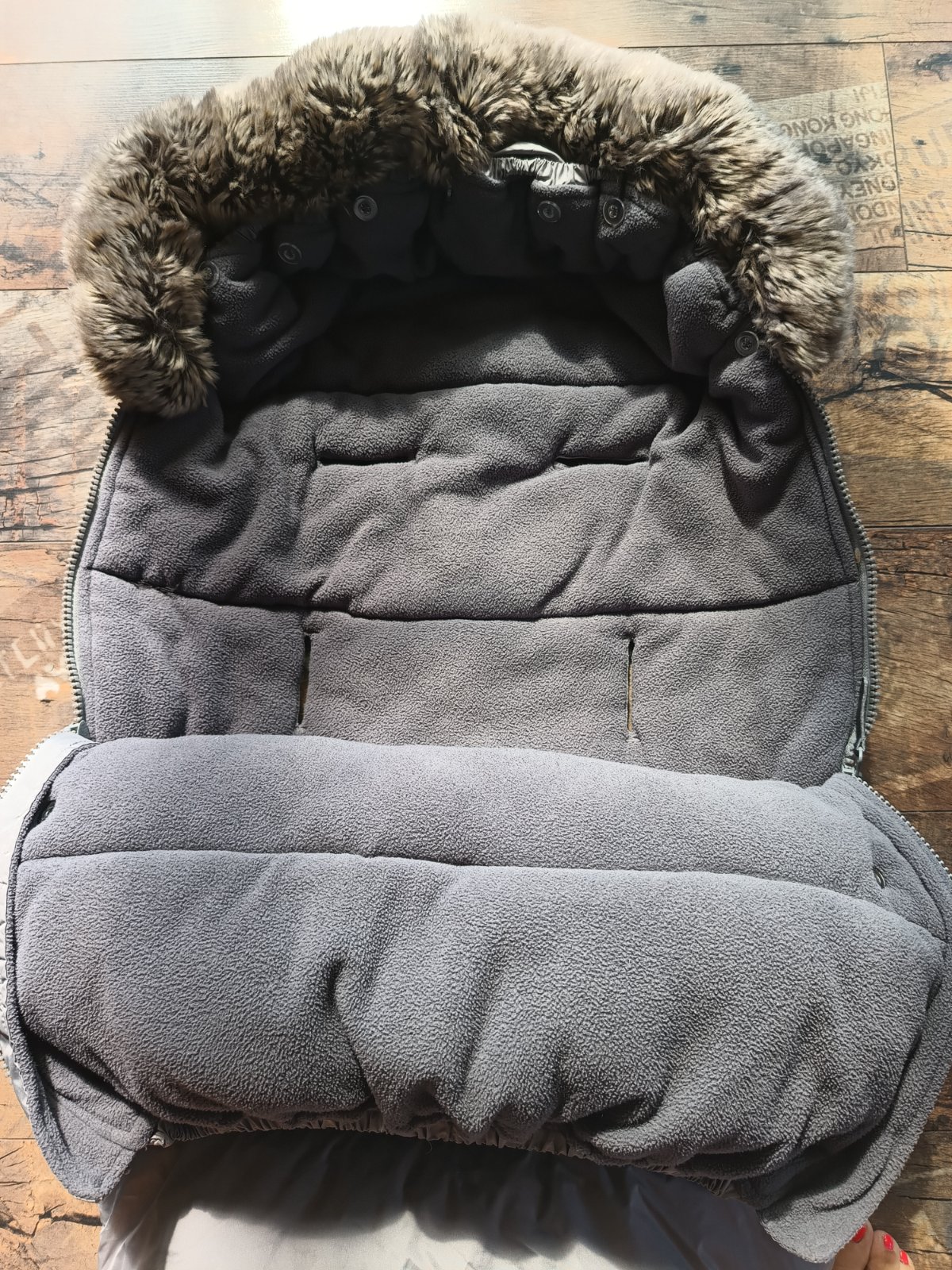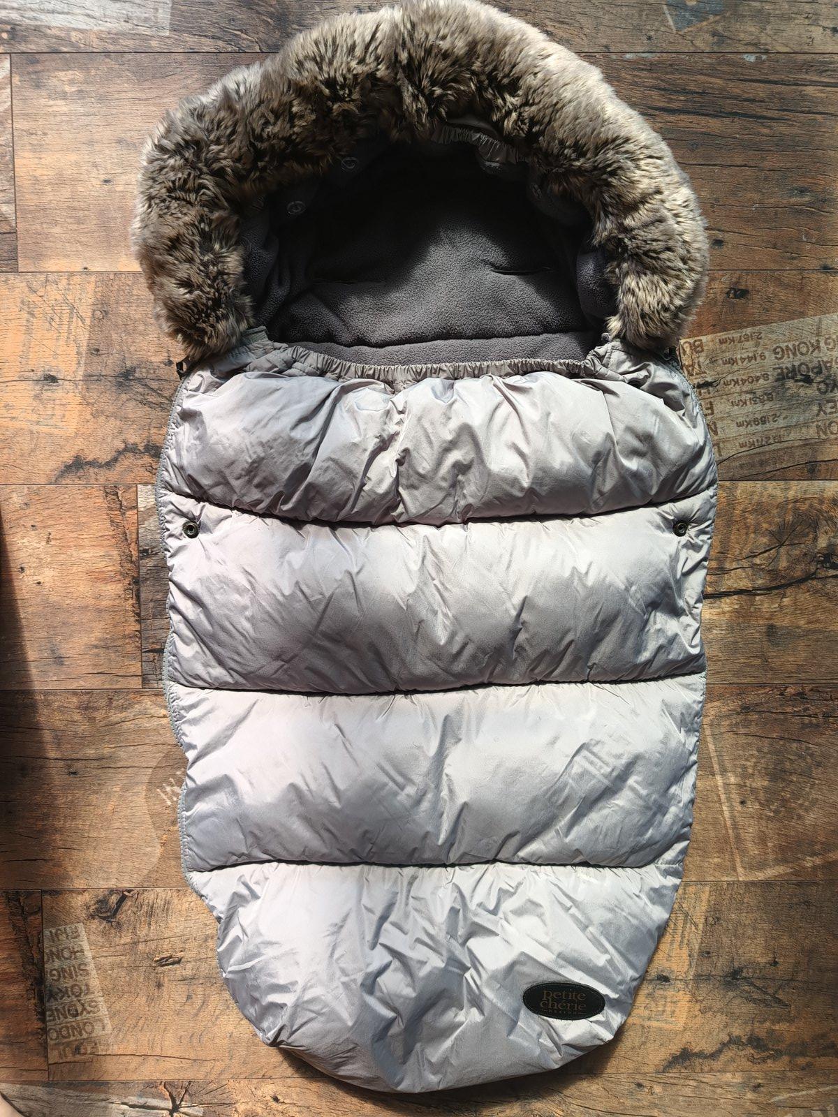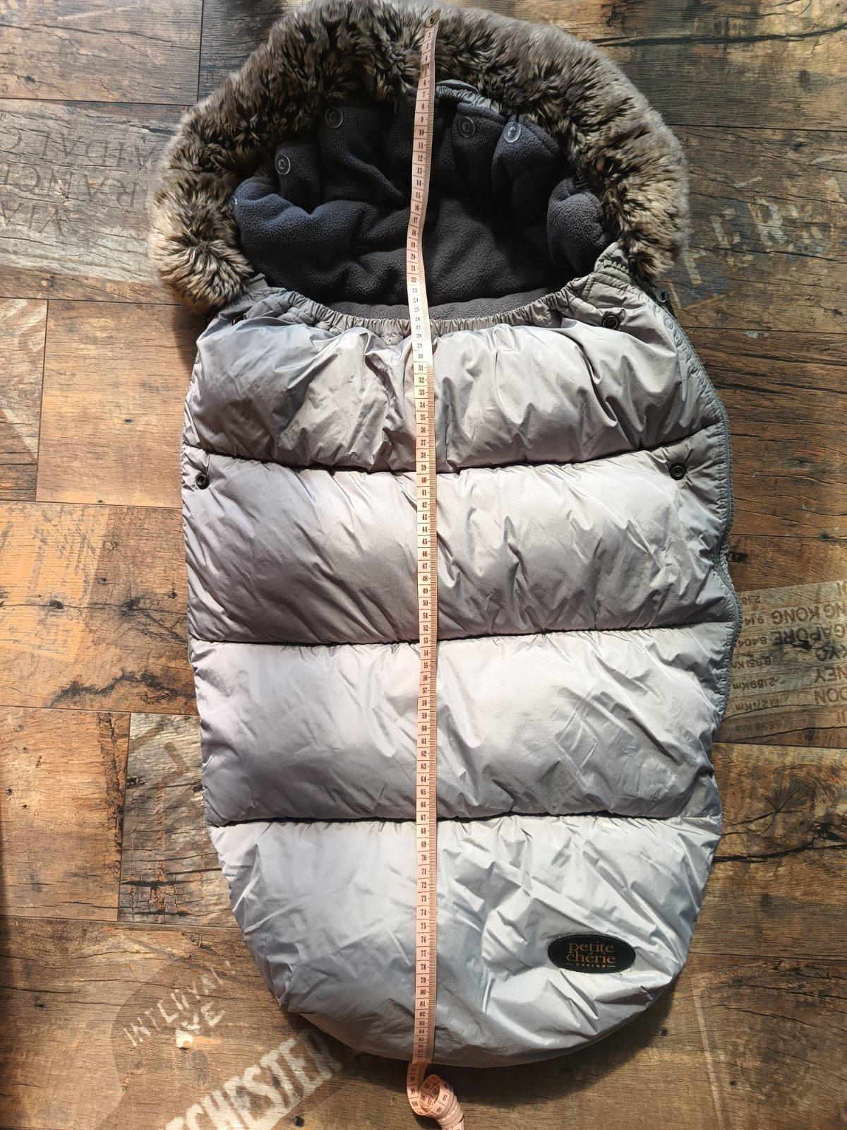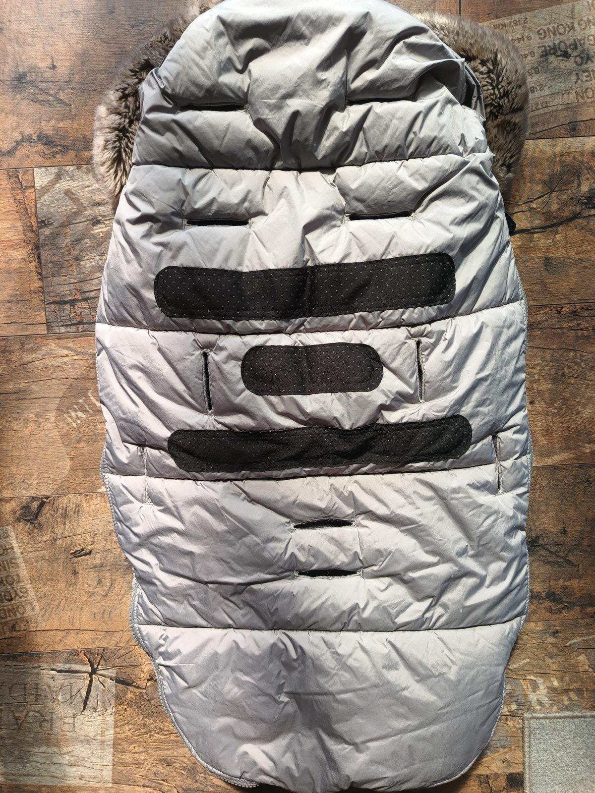 Krásny teplučký fusak známej značky. Top stav, jedine čo sa natiahli gumičky čo držia kožušinku, ale čo mám info tak to u všetkých. Pridávam k tomu grátis rukávniky na kočík.