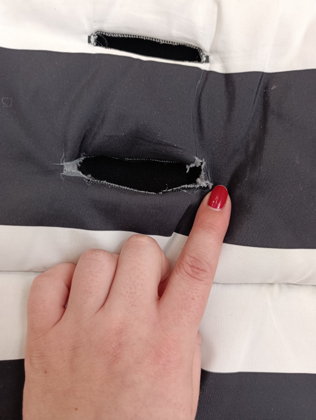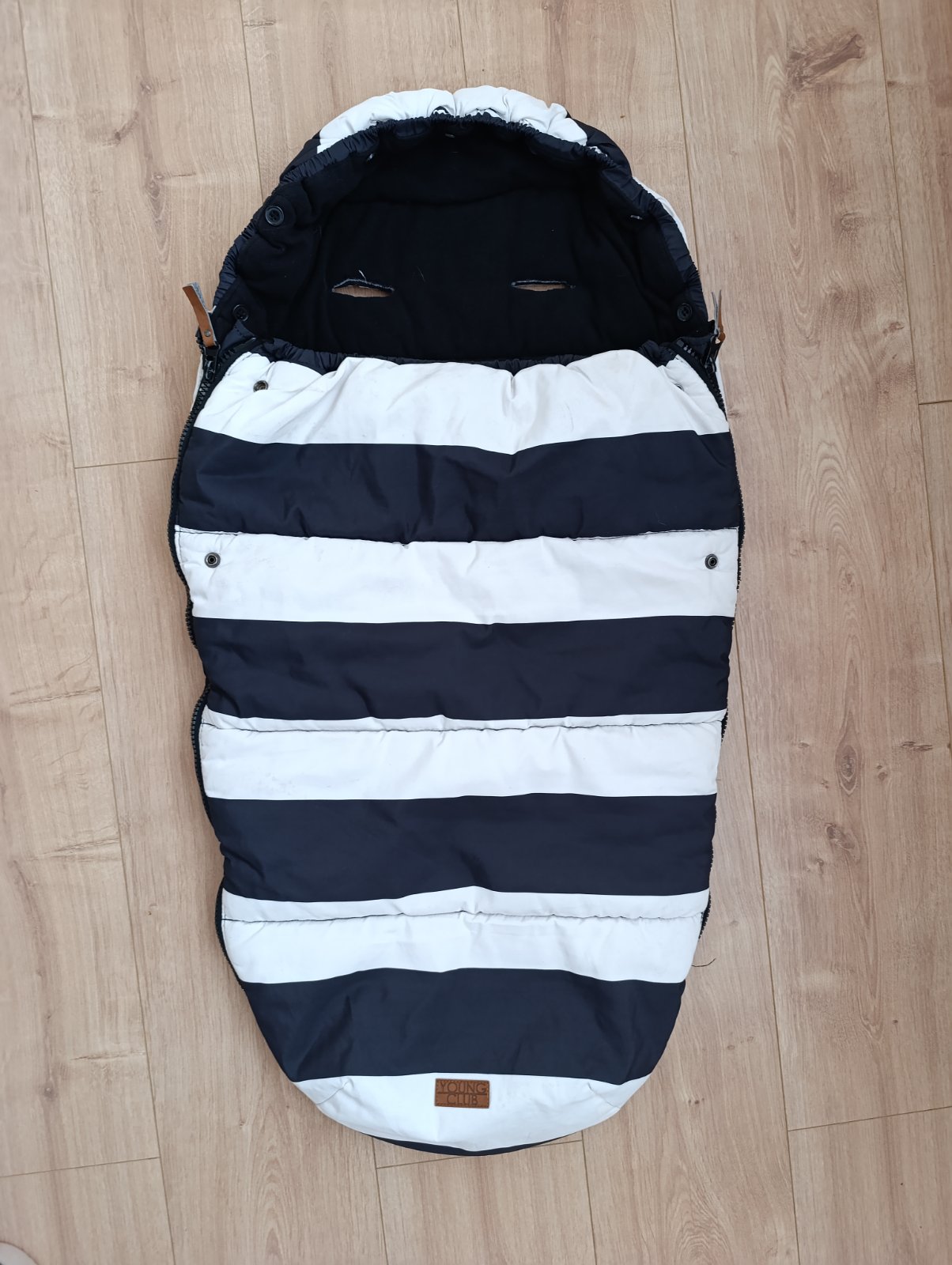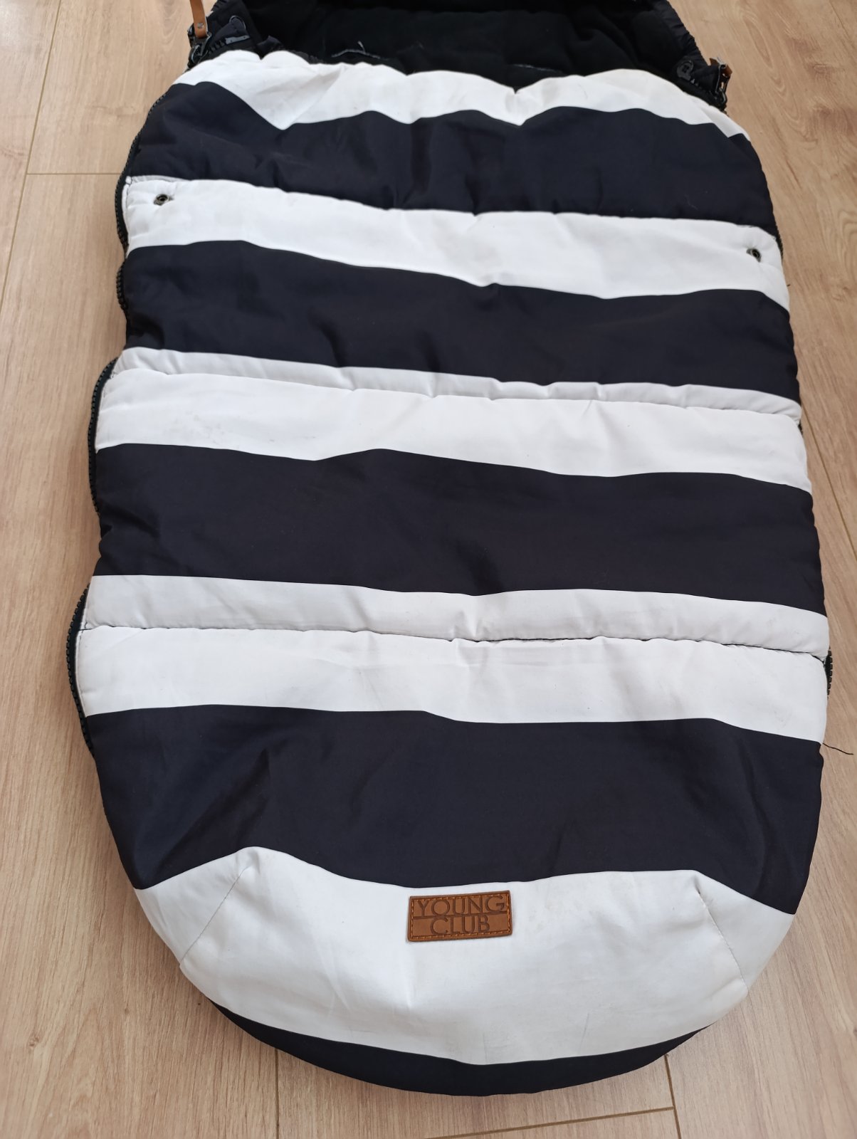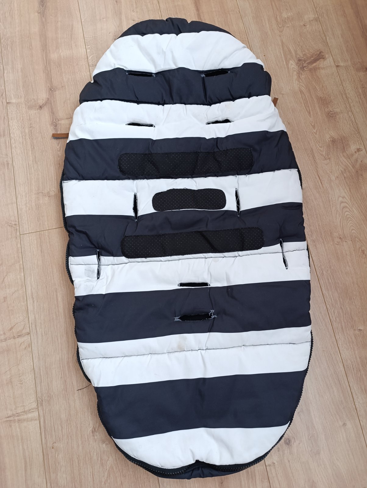 Je používaný, jedna malá chybička , vzadu jedna dierka trochu natrhnuté, neni to vidno pri používaní lebo je to zadu, kde je fusak pritlaceny ku kočíku z tej strany.