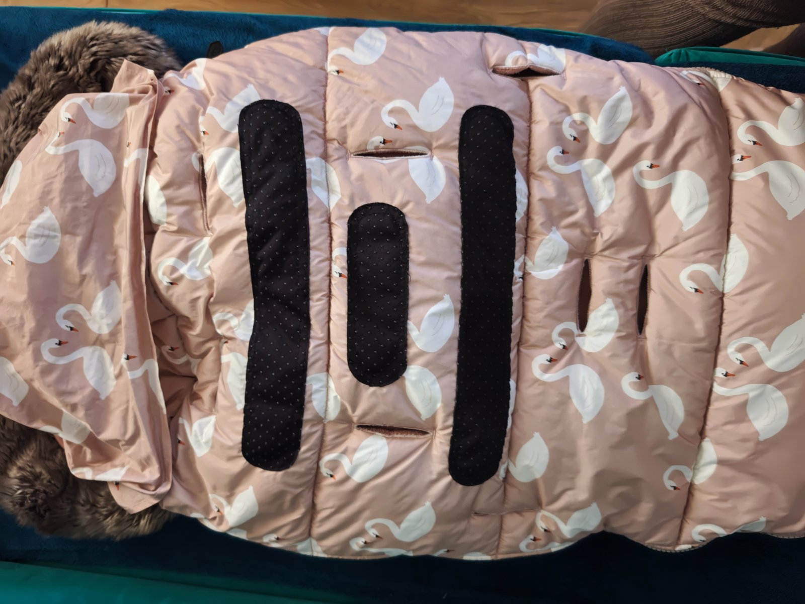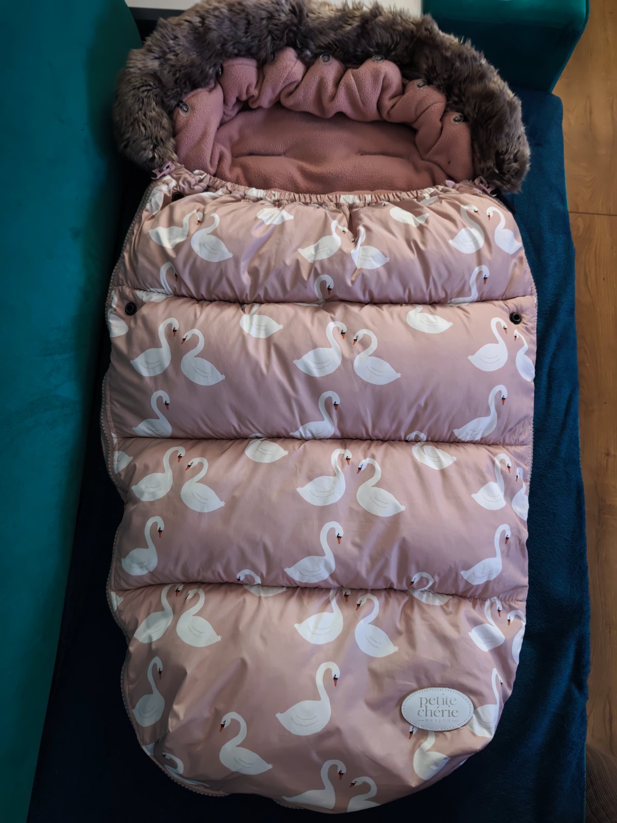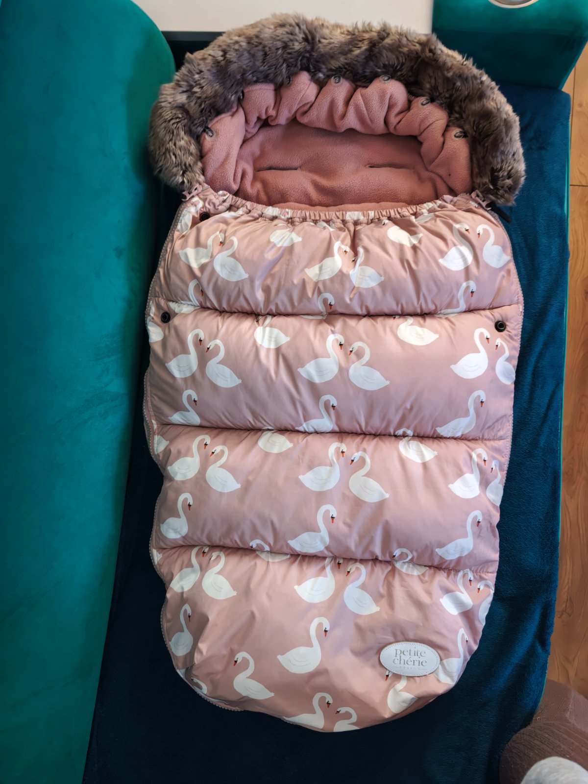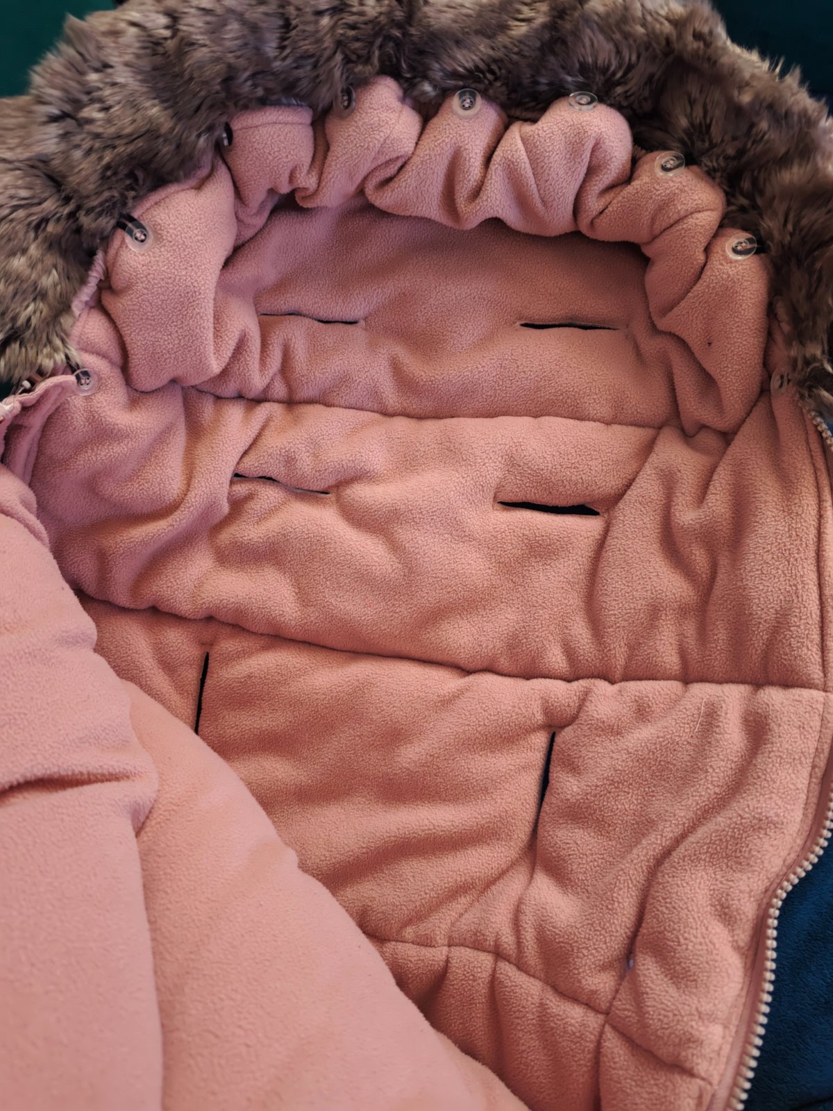 Krásny teplučký fusak známej značky. Top stav, jedine čo sa natiahli gumičky čo držia kožušinku, ale čo mám info tak to u všetkých. Pridávam k tomu grátis rukávniky na kočík.
