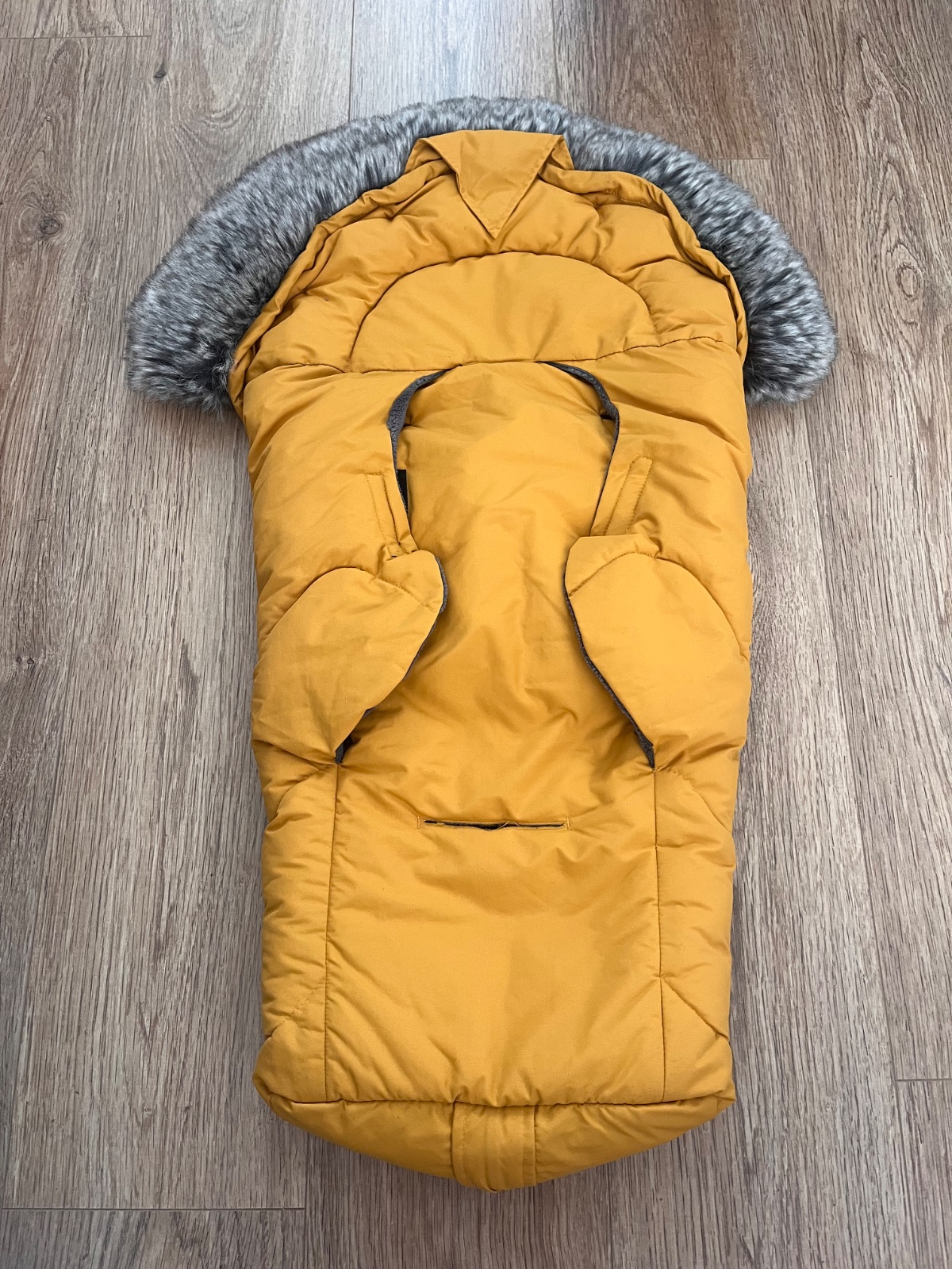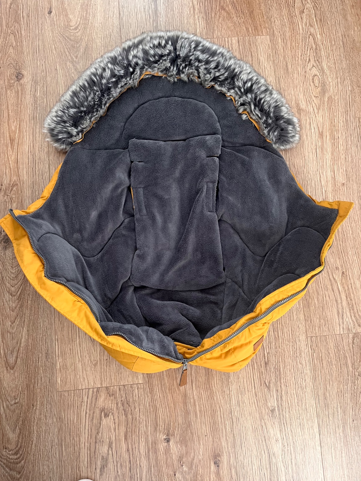 Detský fusak do autosedačky, horčicová farba, vo vnútri teply flís, veľmi pekný.
