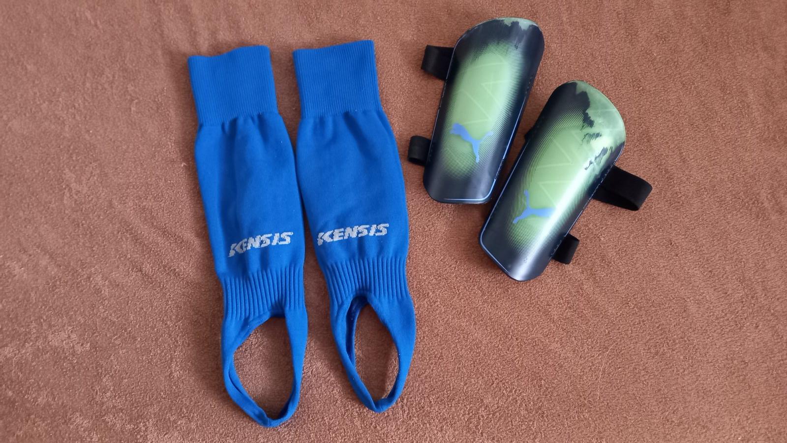 Chrániče značky Puma, chlapčenské/veľkosť L/ a štulpne Kensis. Nám sú už malé. Chrániče majú ošúchanú farbu, inak bez poškodenia.