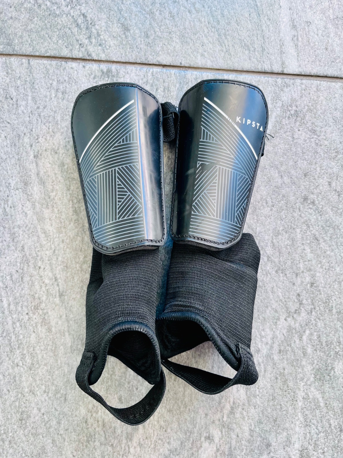 Detské futbalové chrániče píšťaly essential 100 čierne Decathlon neposkodene, velkost S