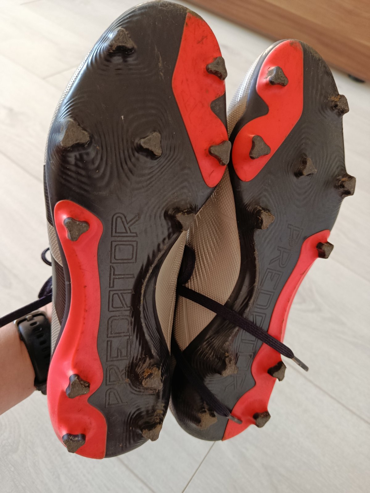 Používané väčšinou na umelej tráve,preto tie čierne šmuhy a používané málo, nakoľko kvôli úrazu minulú sezónu nehral Veľkosť je písaná 40,5 Syn nemá rád šnúrky, preto tam nie sú (stratili sa)