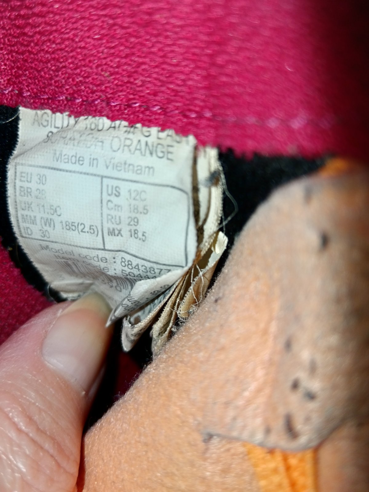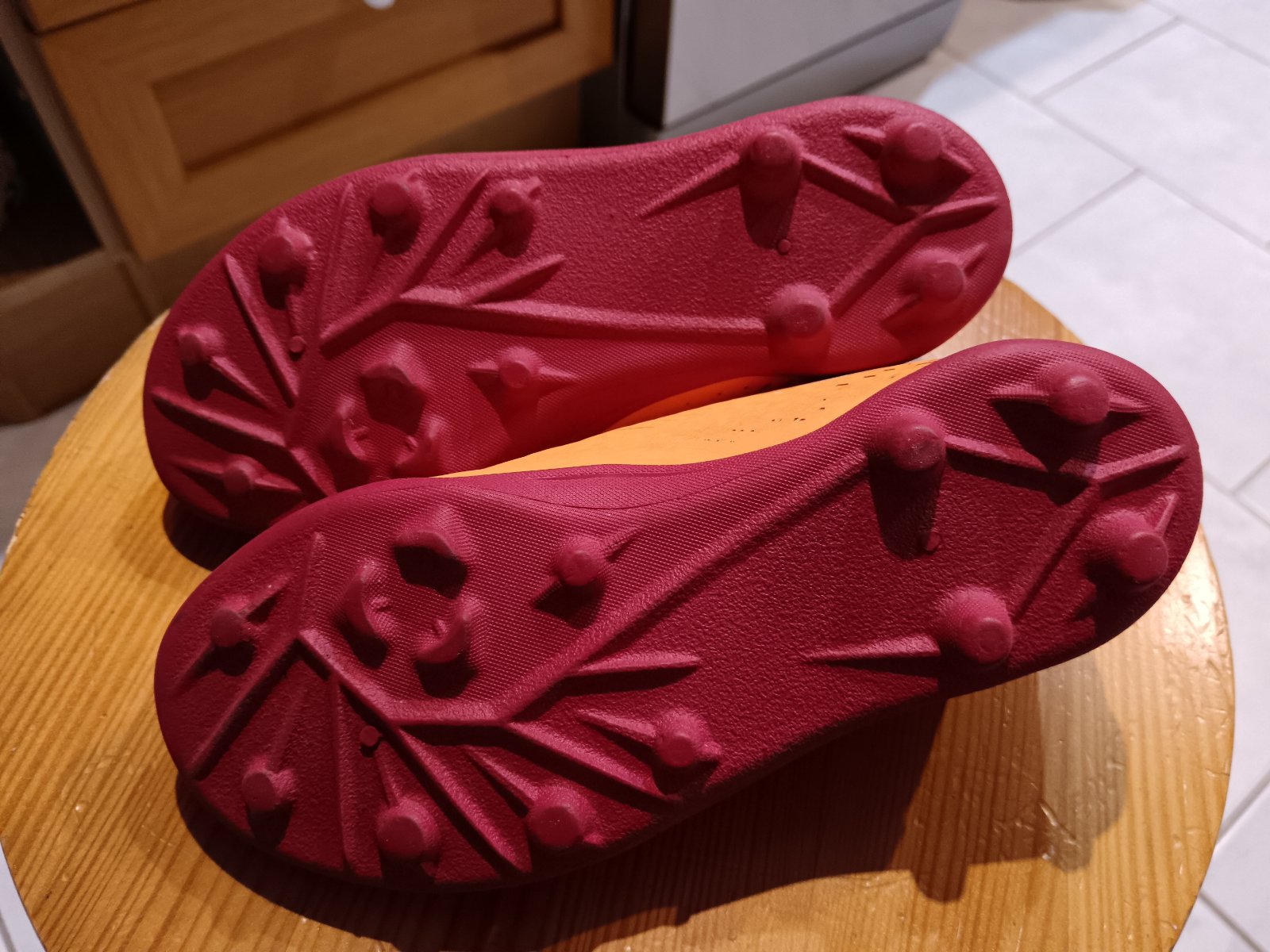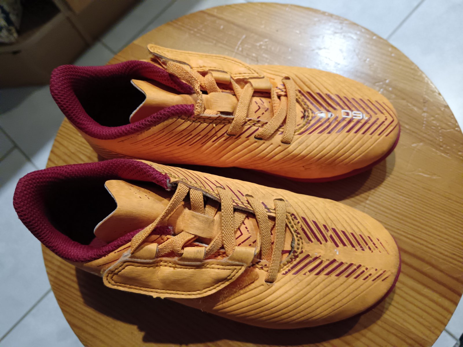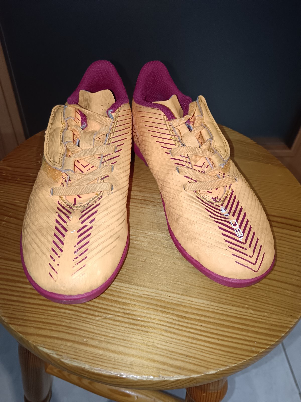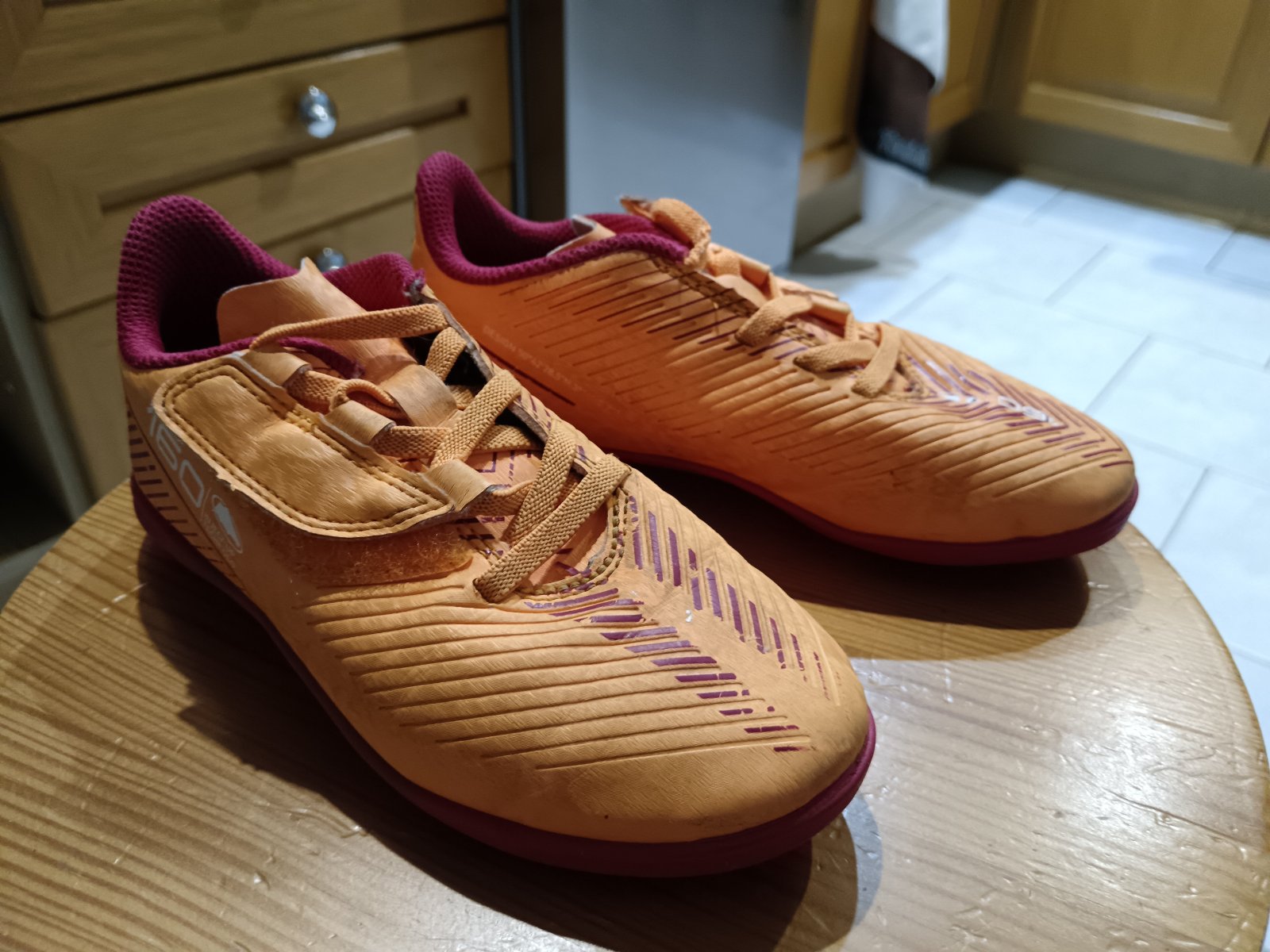 Posúvam detské kopačky zn Kipsta. Nosené len na tréning a zápasy 1 sezónu. Su na suchý zips, perfektné obuvanie. Vnut. dlzka max 18.5cm. Oranzova farba, vnutro a podrazka cerveno-bordove. Biele písmenká sa kde-tu odlepili, ale to nebrani funkcnosti...