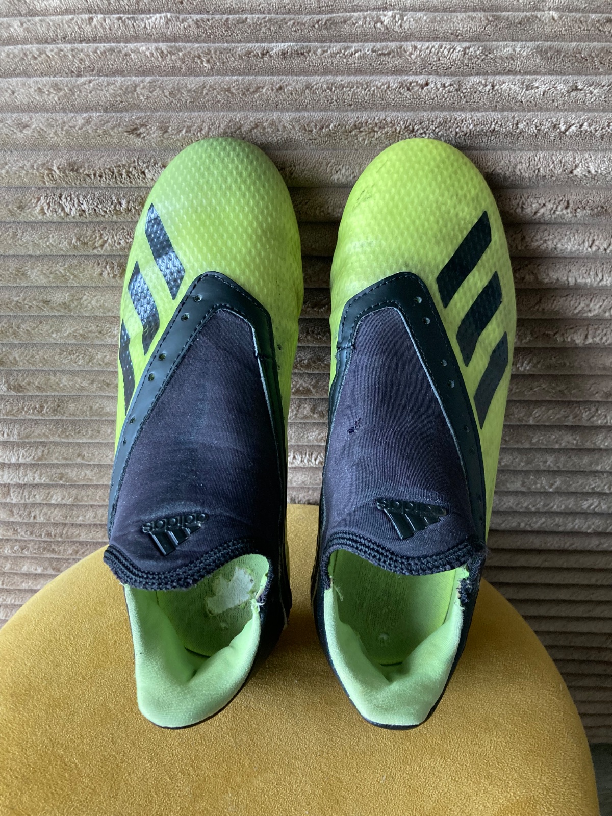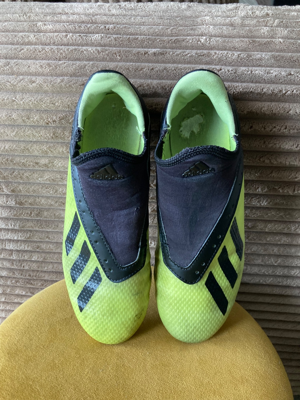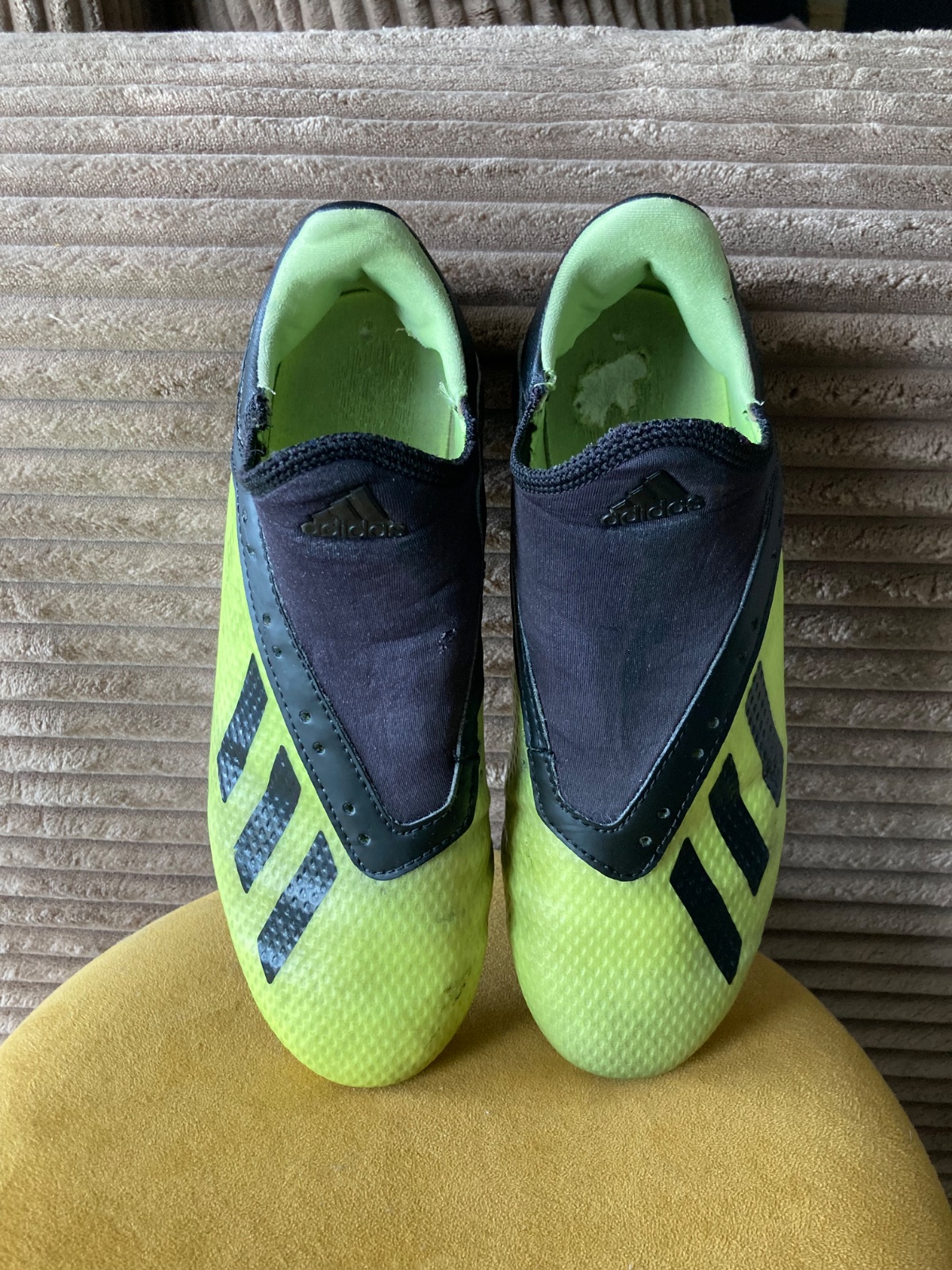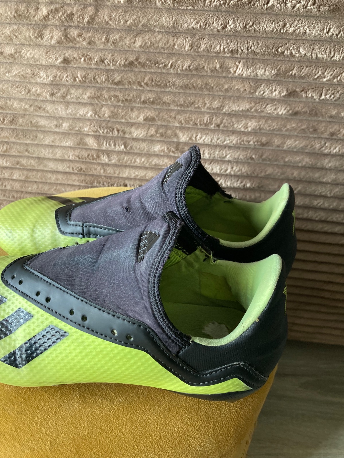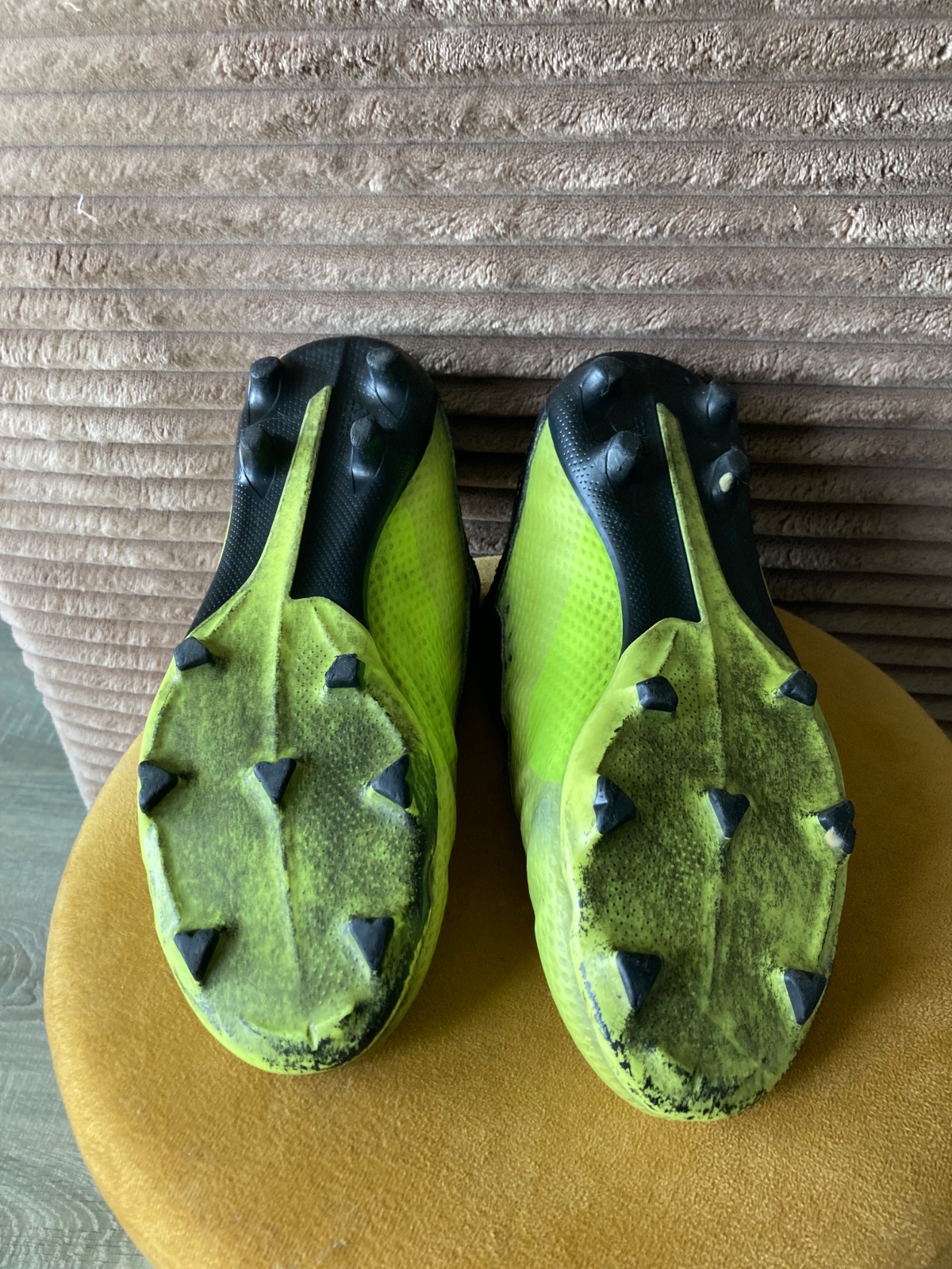 pekný stav, kožené, viac nosené, podrážka nepoškodená ale štuple sú už zošúchané, jedna dierka na látkovej časti, ošuchy som nenašla, farba krikľavá ale ušpinená, sú už vyčistené, bez šnúrok