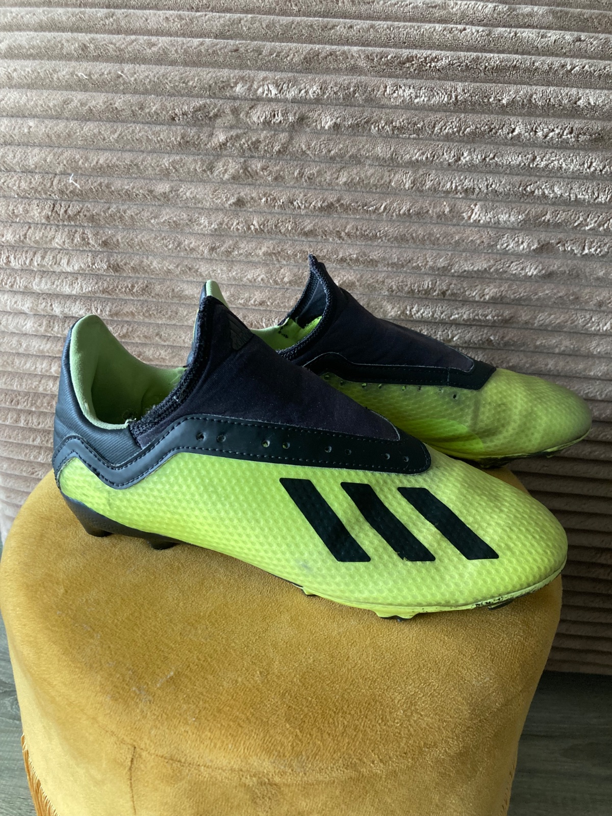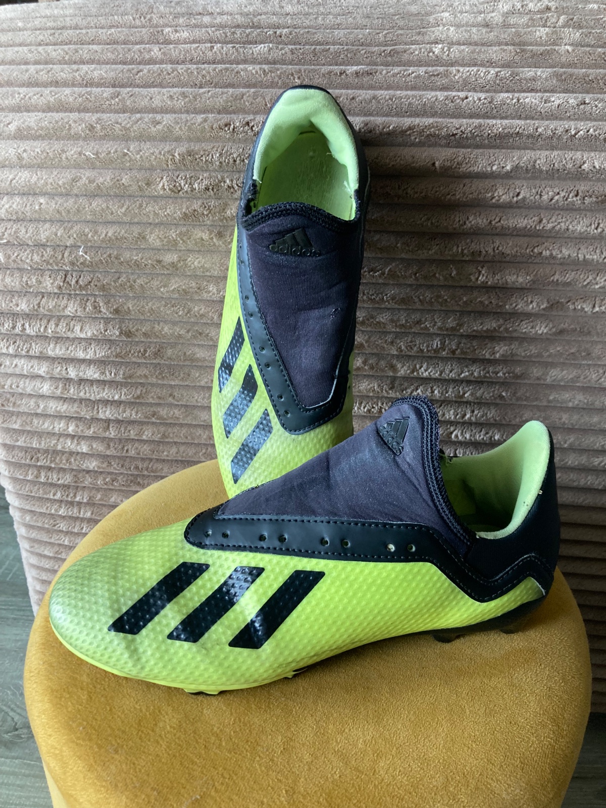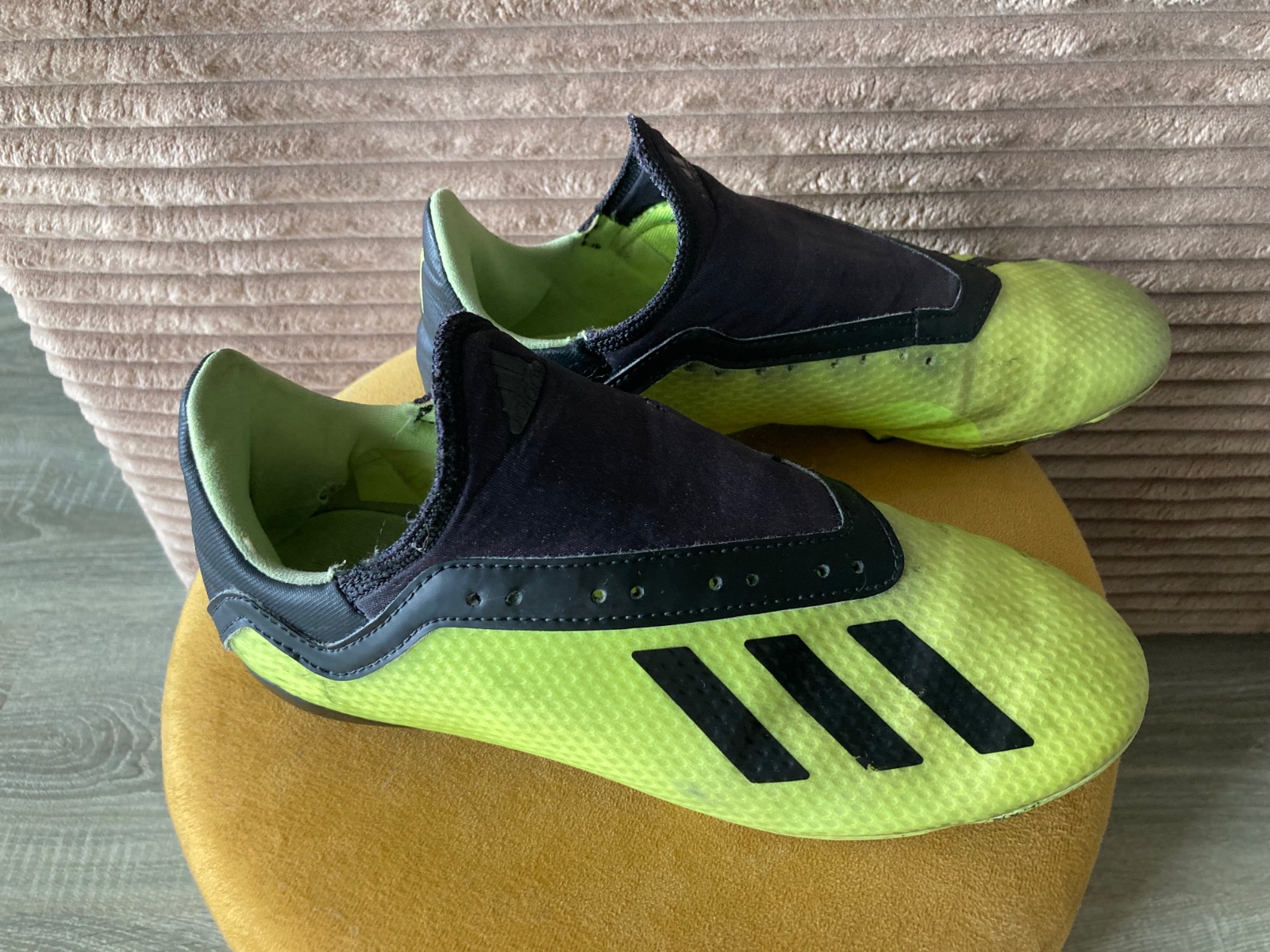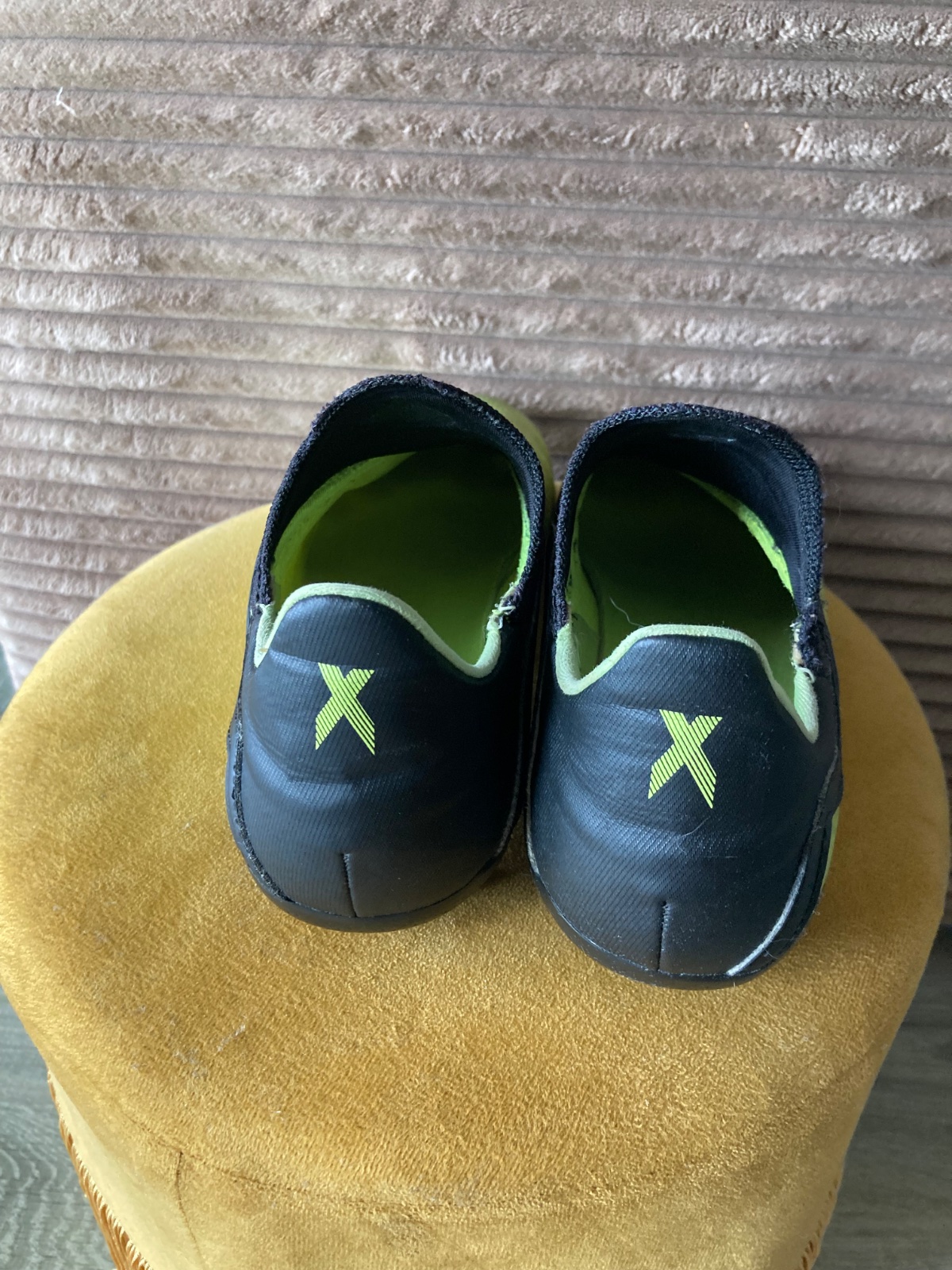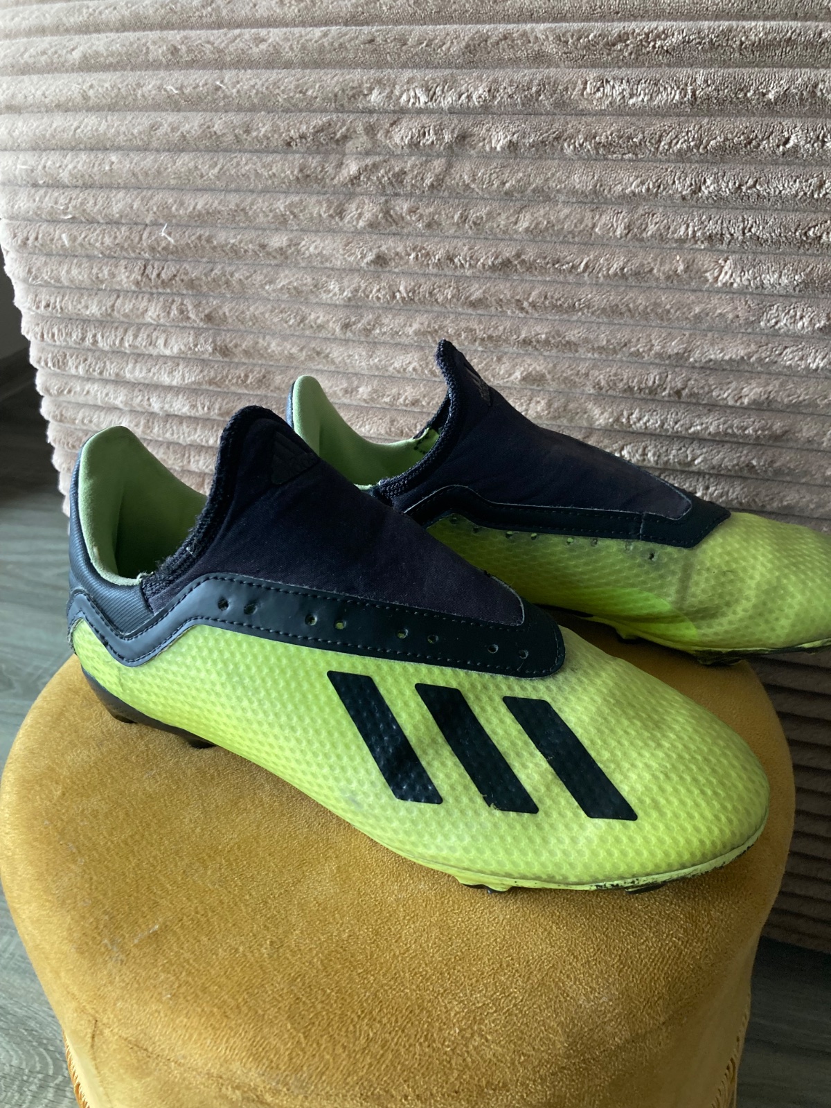 pekný stav, kožené, viac nosené, podrážka nepoškodená ale štuple sú už zošúchané, jedna dierka na látkovej časti, ošuchy som nenašla, farba krikľavá ale ušpinená, sú už vyčistené, bez šnúrok