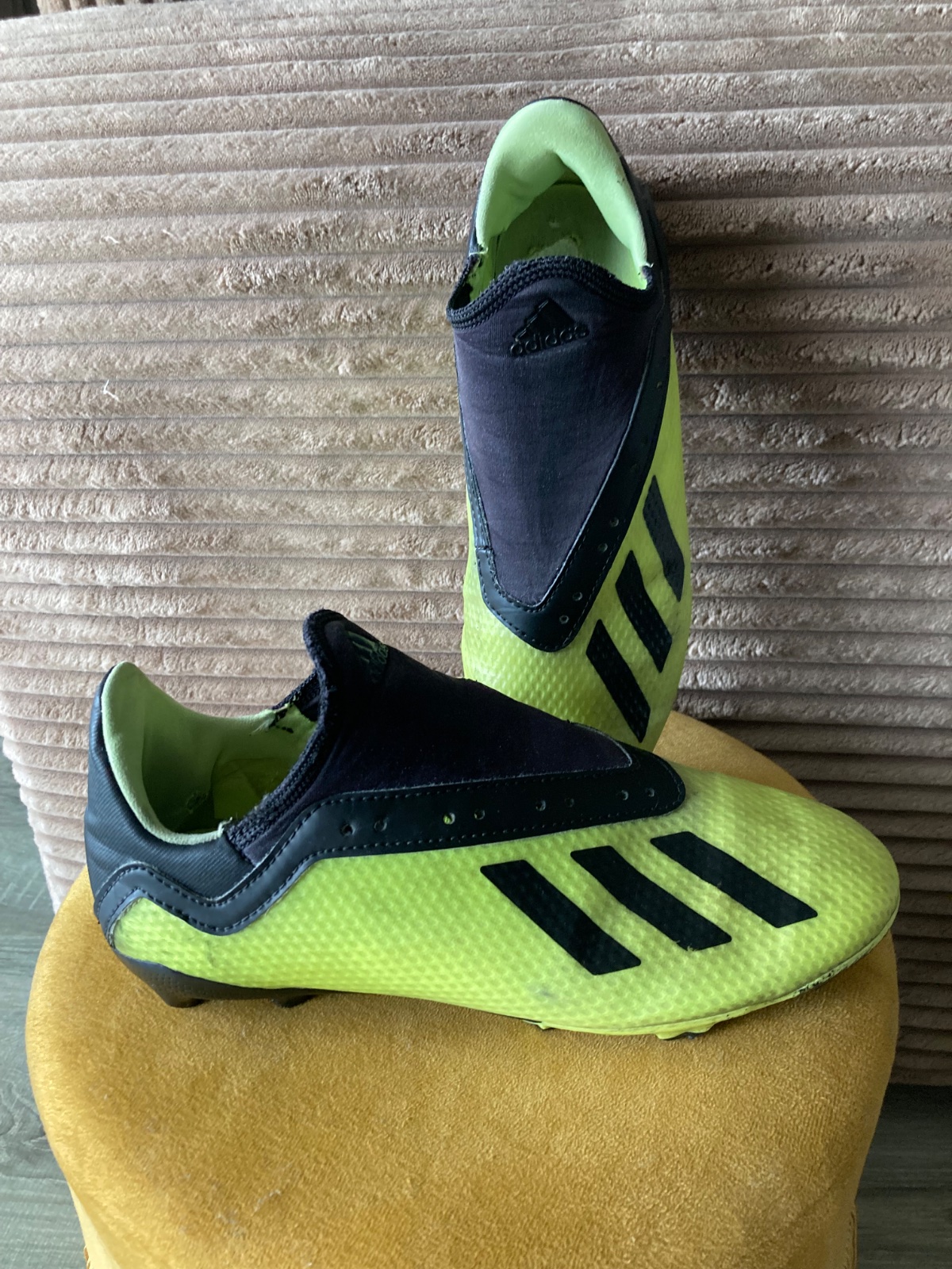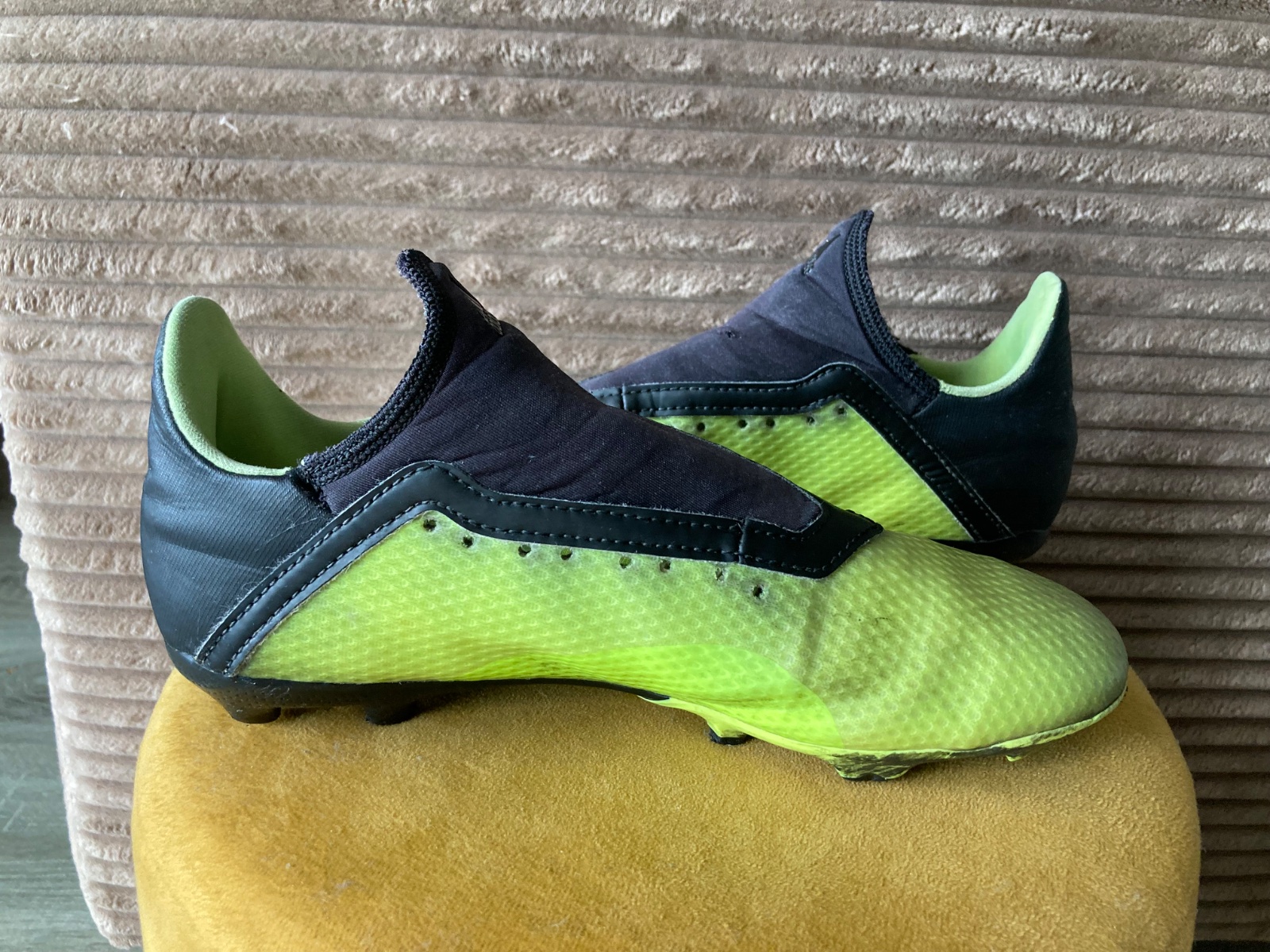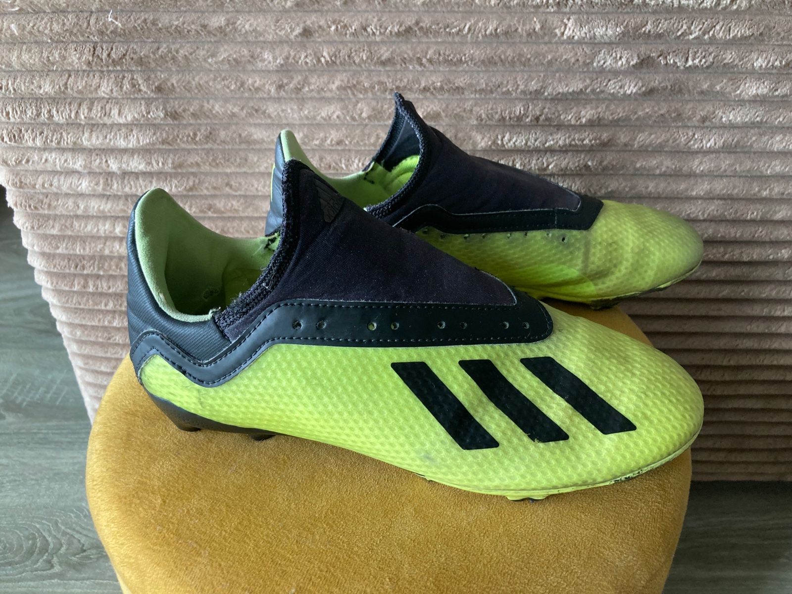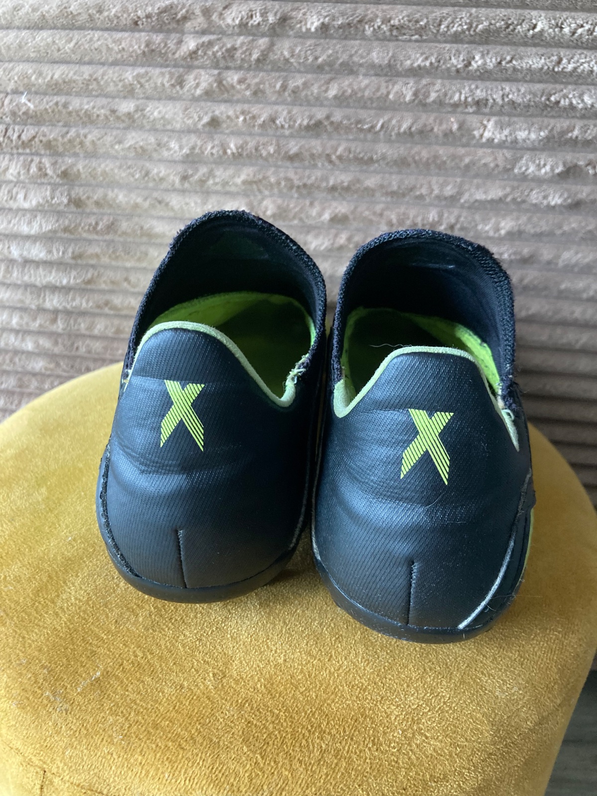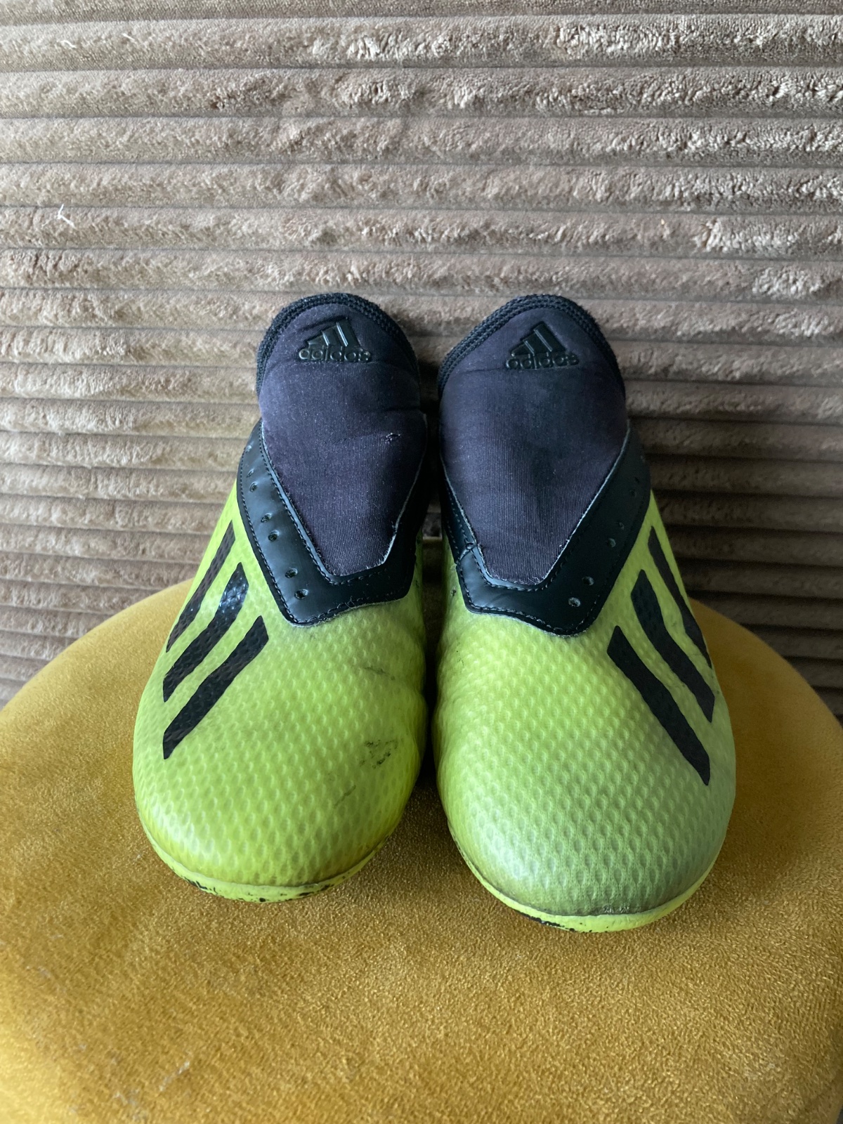 pekný stav, kožené, viac nosené, podrážka nepoškodená ale štuple sú už zošúchané, jedna dierka na látkovej časti, ošuchy som nenašla, farba krikľavá ale ušpinená, sú už vyčistené, bez šnúrok