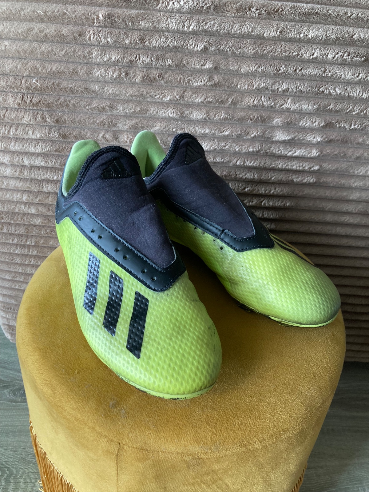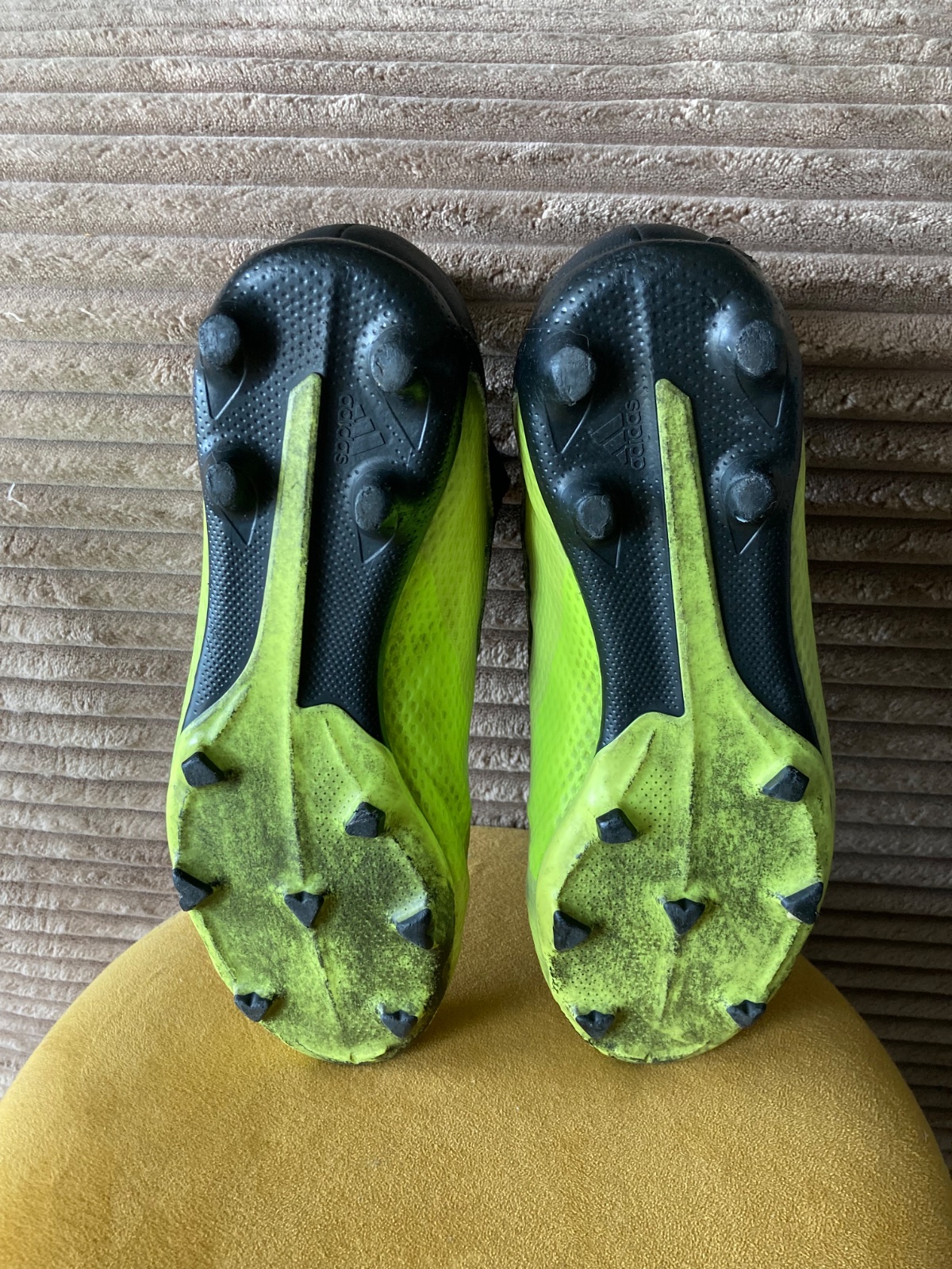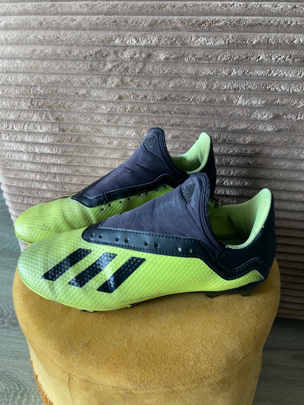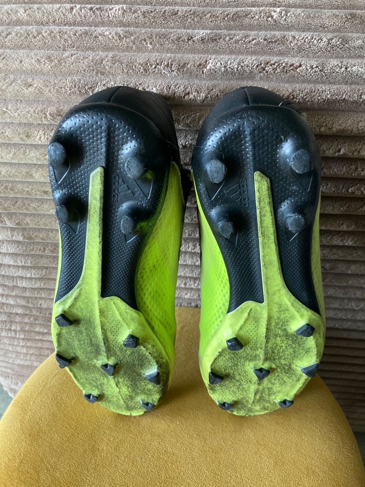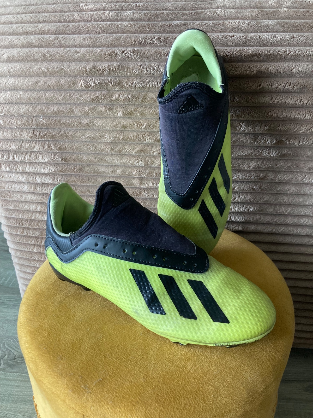 pekný stav, kožené, viac nosené, podrážka nepoškodená ale štuple sú už zošúchané, jedna dierka na látkovej časti, ošuchy som nenašla, farba krikľavá ale ušpinená, sú už vyčistené, bez šnúrok