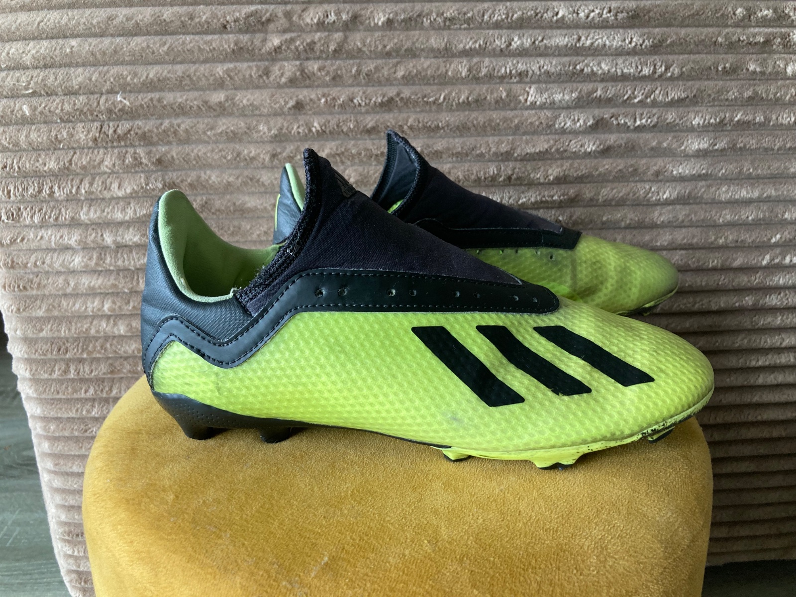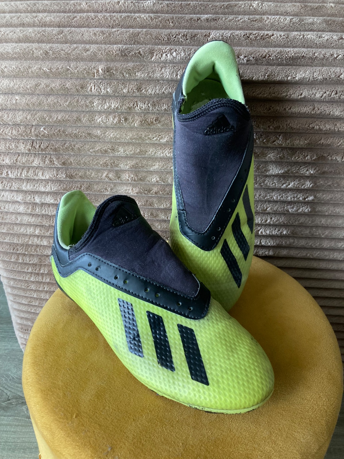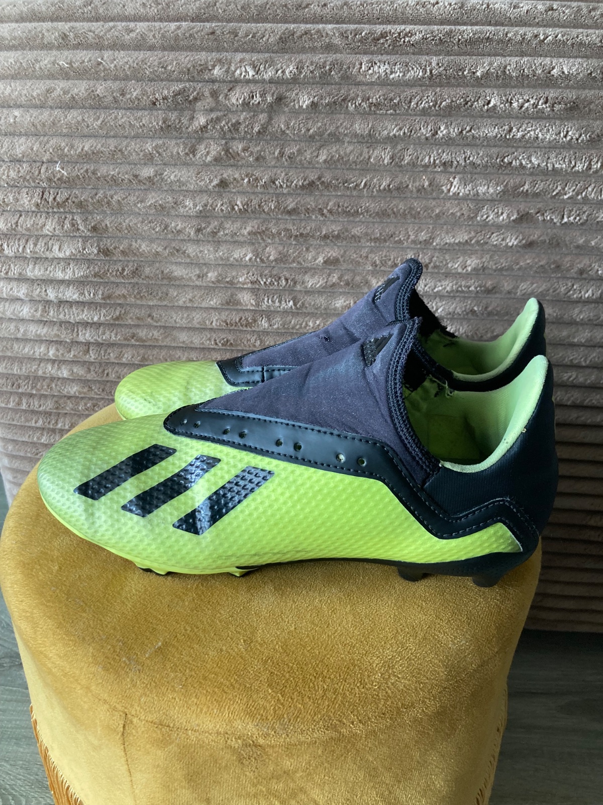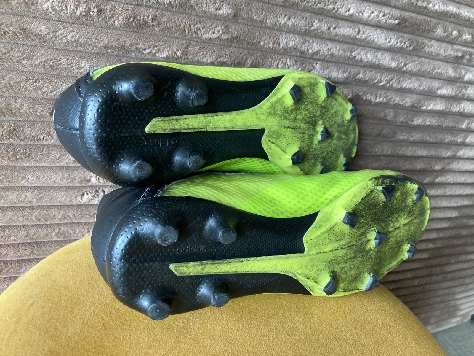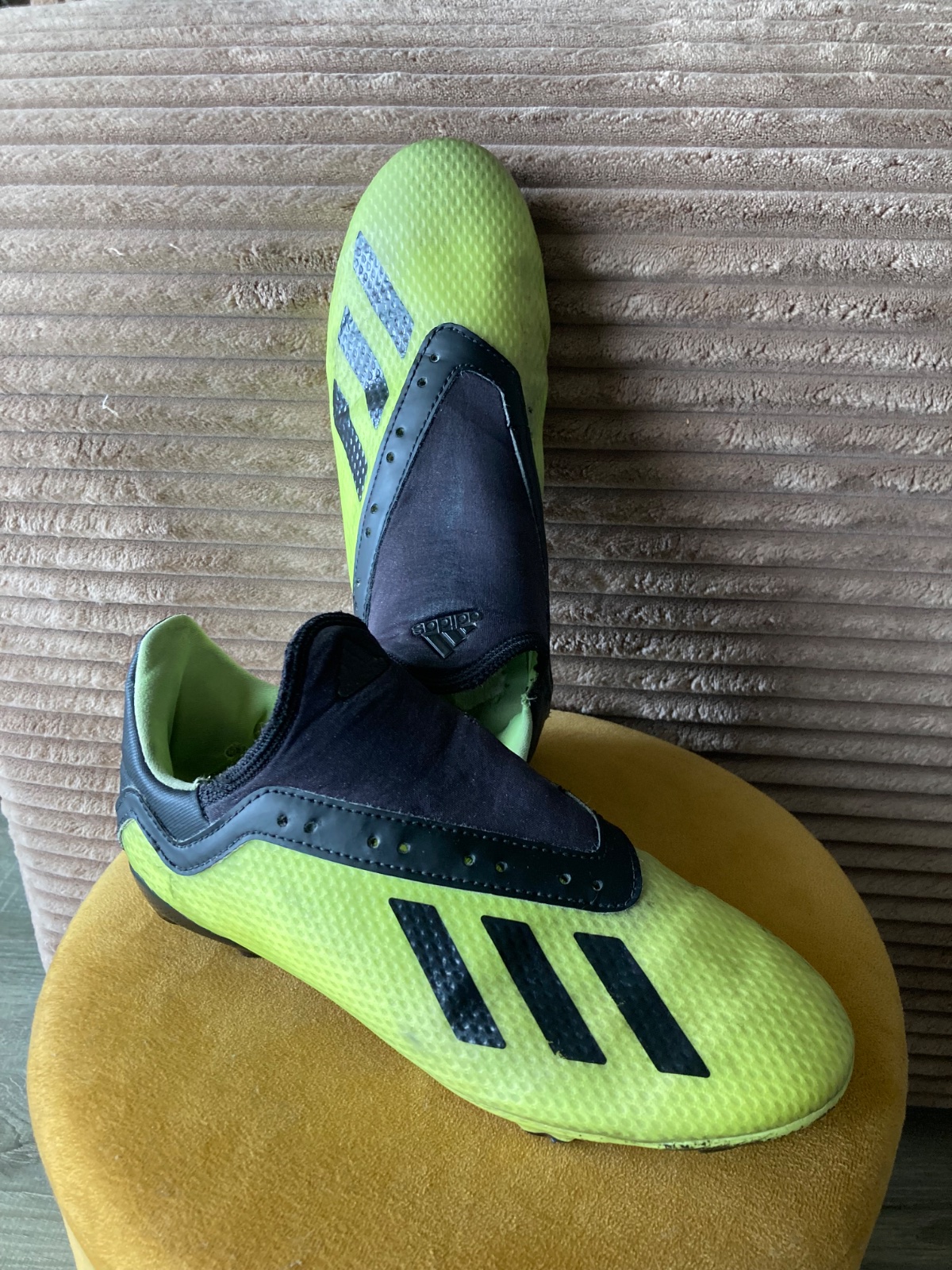 pekný stav, kožené, viac nosené, podrážka nepoškodená ale štuple sú už zošúchané, jedna dierka na látkovej časti, ošuchy som nenašla, farba krikľavá ale ušpinená, sú už vyčistené, bez šnúrok