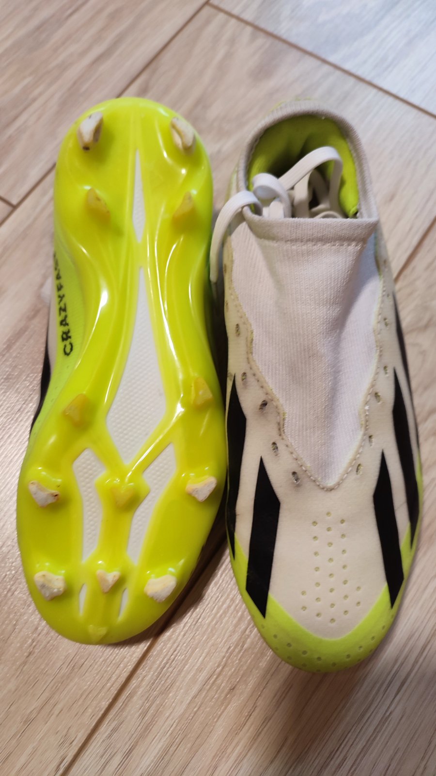 Posúvame kopačky. Veľ 35,5 asi je to zosuchane slabo vidieť. Jedna kopačka má na päte zvnútra dierku. Viď. Foto. Treba vyčistiť. .