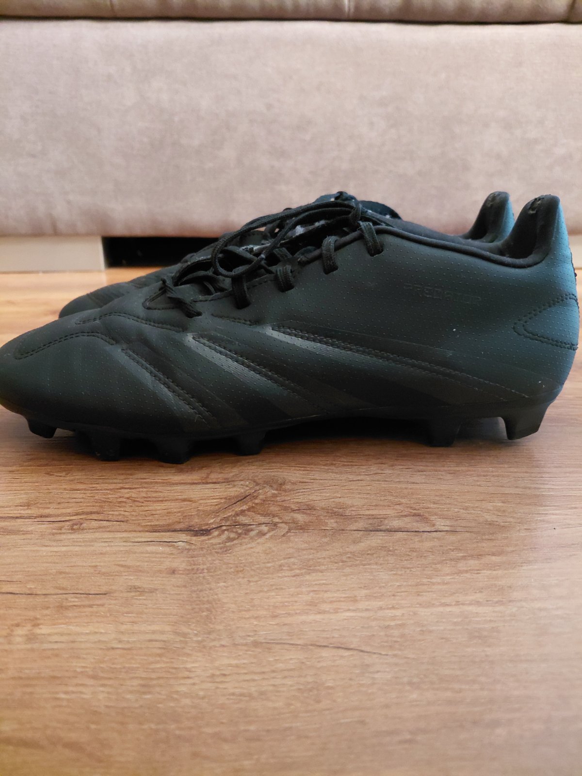 Futbalové kopačky Adidas Predator - veľ. 43.5 v klasickej čiernej farbe. Sú už viac nosené a majú viditeľné známky opotrebovania. Technicky sú v poriadku - nič sa neodliepa, štuple nie sú zodraté na doraz. Ideálne na tréningy alebo ako náhradné kopačky.