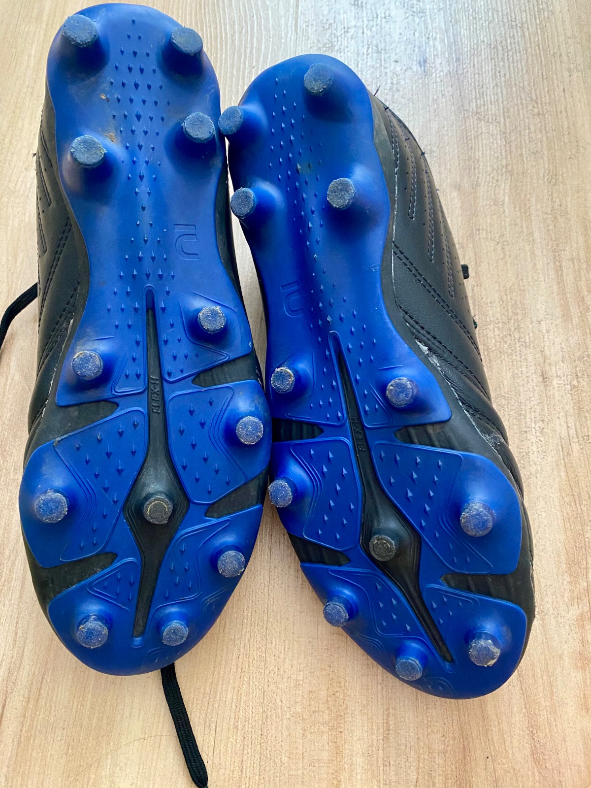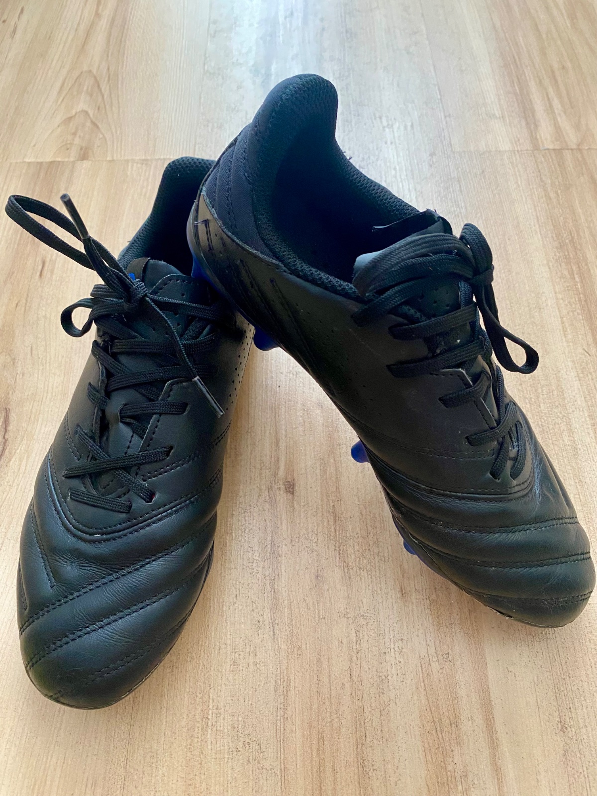 Detské futbalové kopačky VIRALTO II MG/AG kožené šnurovacie čierne. Obuté pár krár. Značka Decathlon.