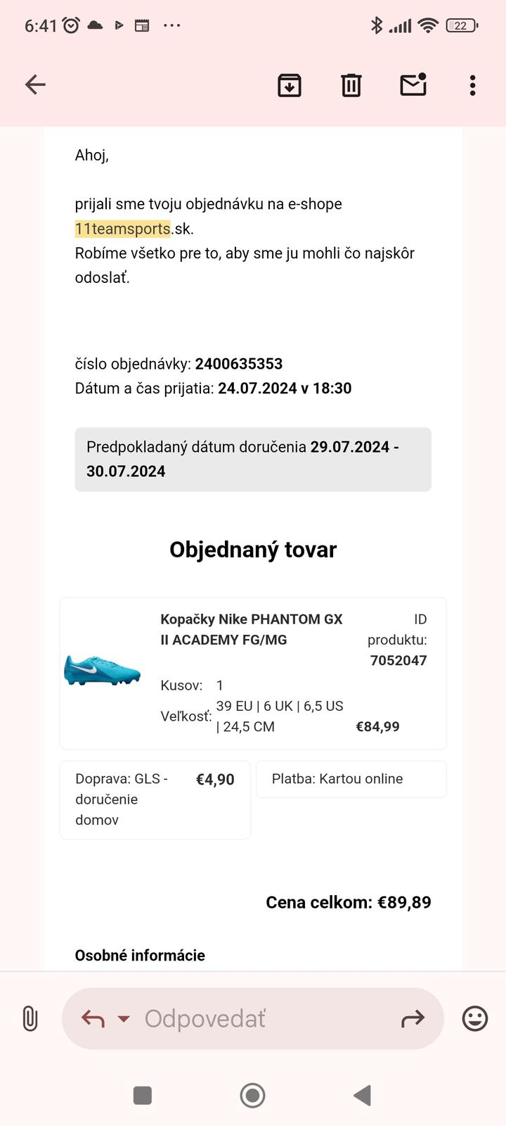 Kopačky Nike PhantomGX kupované v jún 2024, zachovalé, bez poškodenia, dôvod predaja- už sú malé. Vnútorná dĺžka 24,5 cm