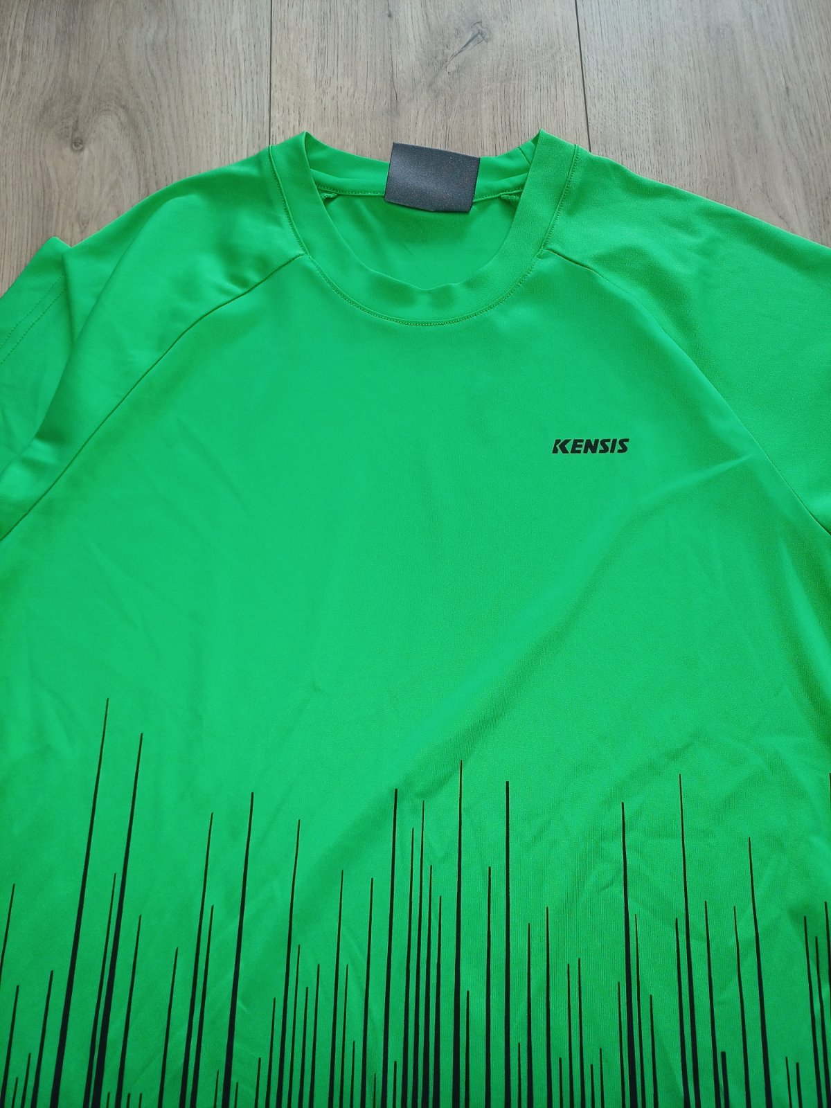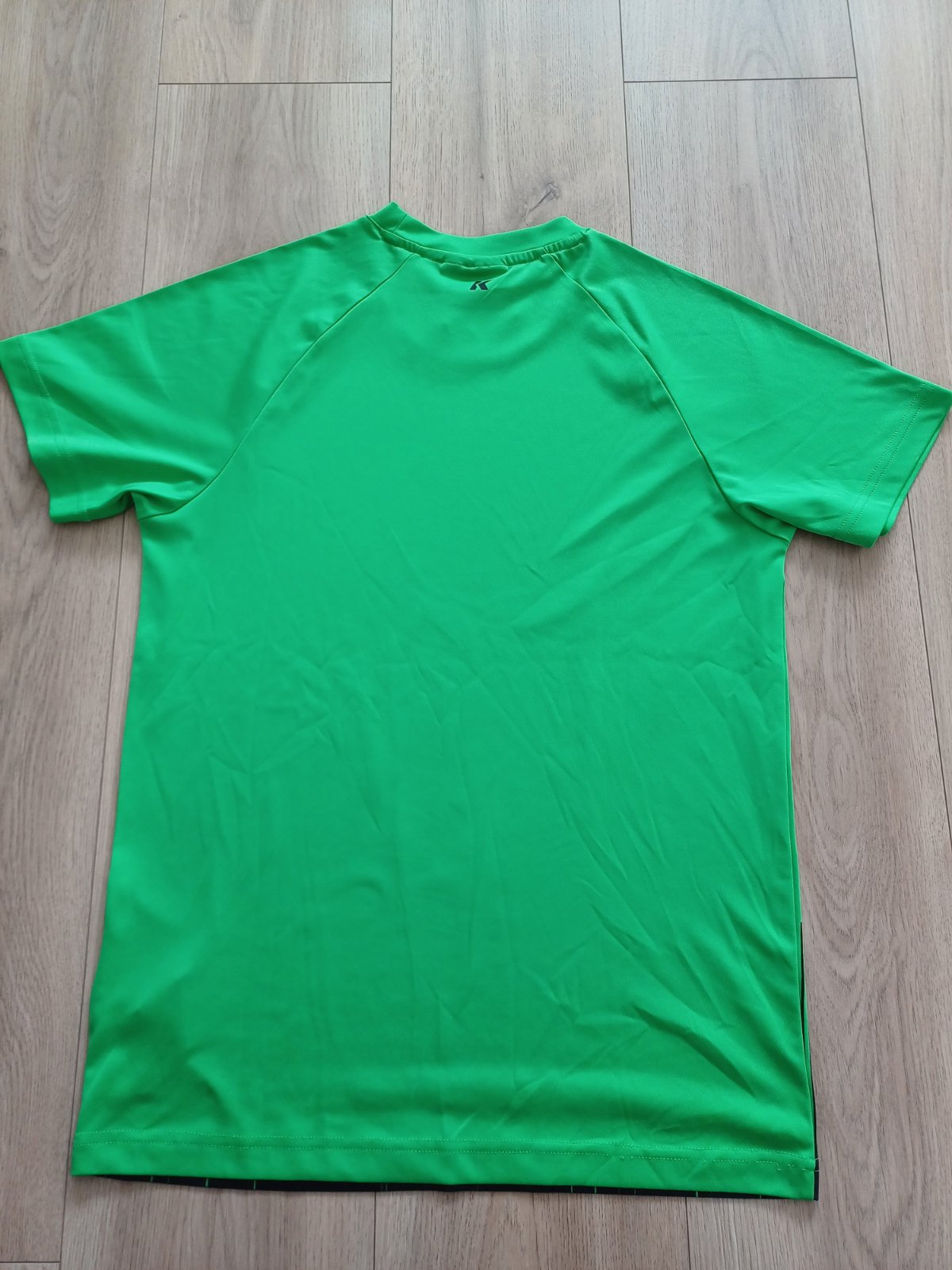Tričko je zelenej a čiernej farby, s krátkym rukávom, z rýchloschnucého materiálu.