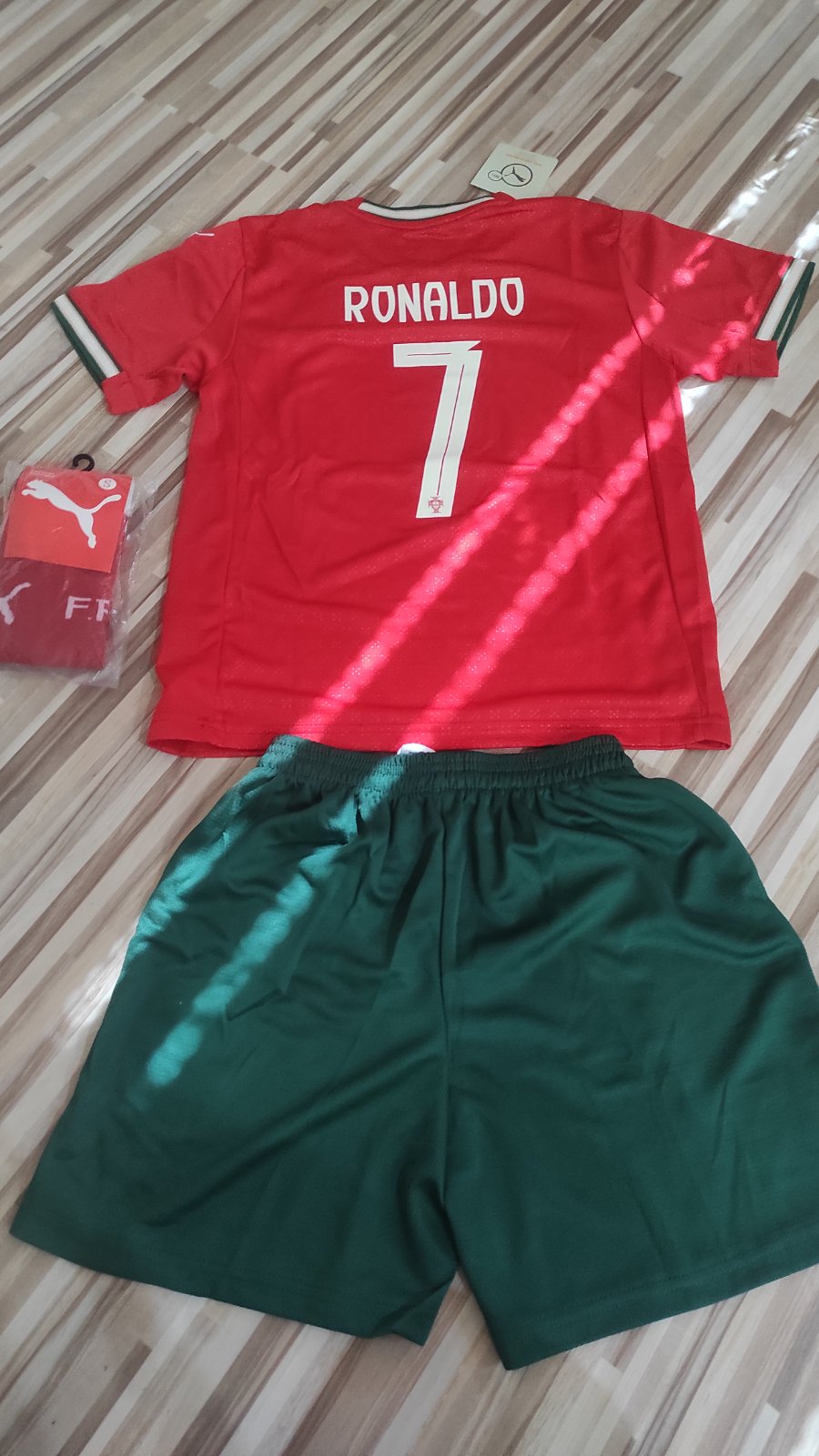 Predám nový detský dres reprezentácie Portugalska s menom Ronaldo. Veľkosť vhodná na vek 10-11 rokov. Je to komplet sada dres,trenky a štucne. V prípade záujmu o inú veľkosť ma kontaktujte v správe.