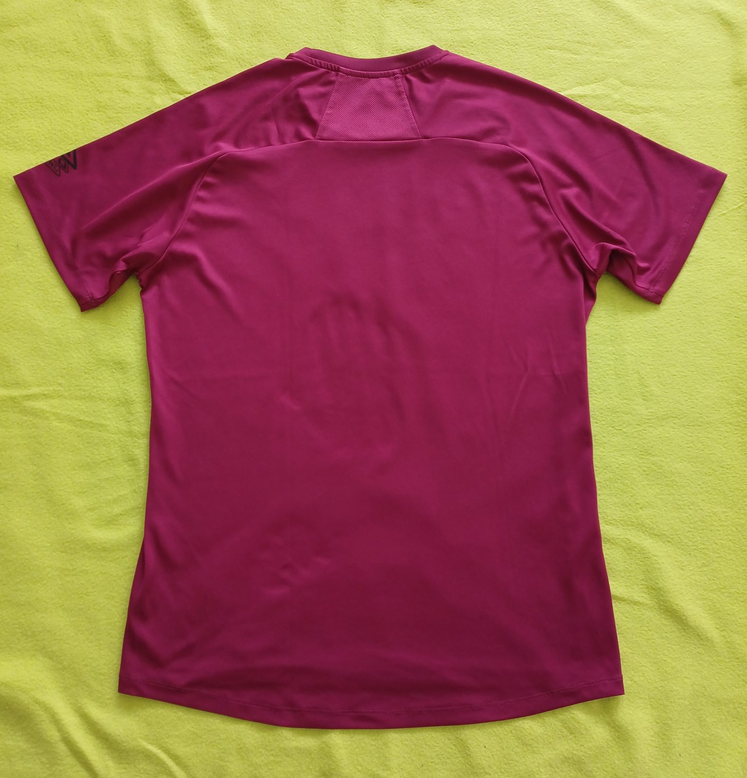 Tričko je bordovo-čiernej farby, s krátkym rukávom, z rýchloschnucého materiálu.