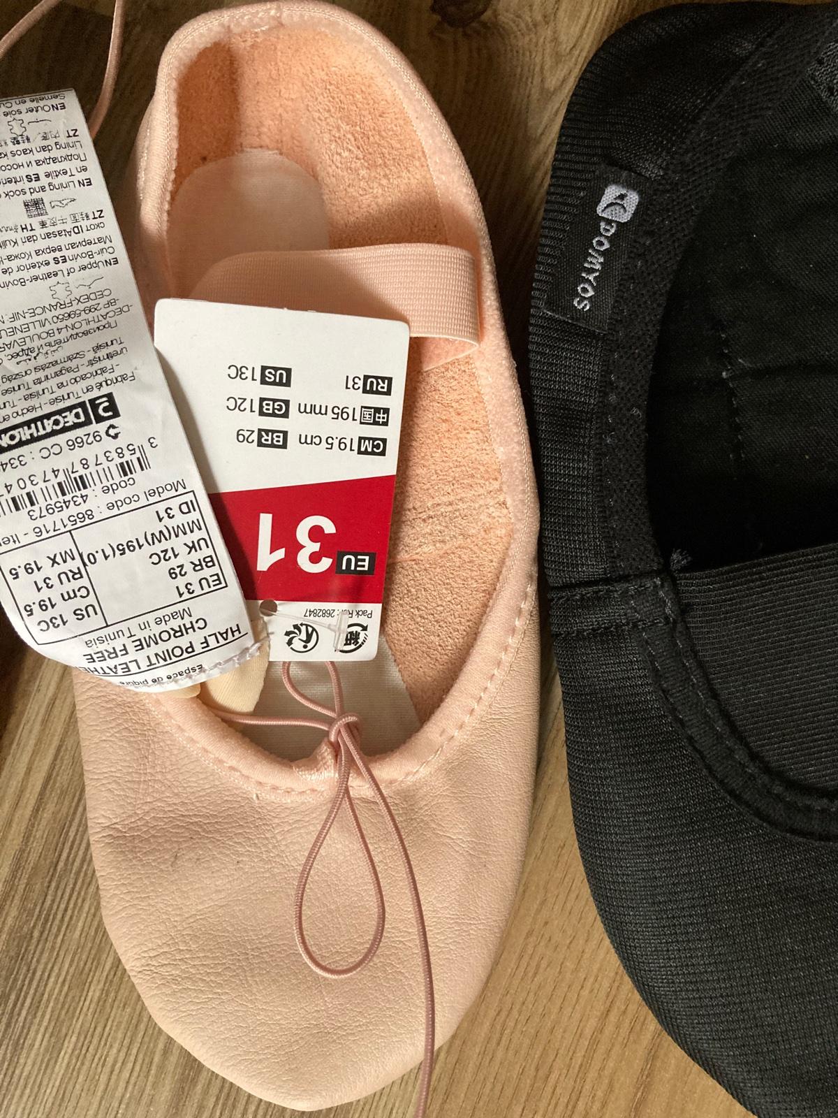Predam nove kozene cvicky vhodne na balet alebo gymnastiku, este s vysackami. Kupovane v decathlone. Darujem k nim cierne gymnasticke cvicky, malo nosene, znacka domyos.
