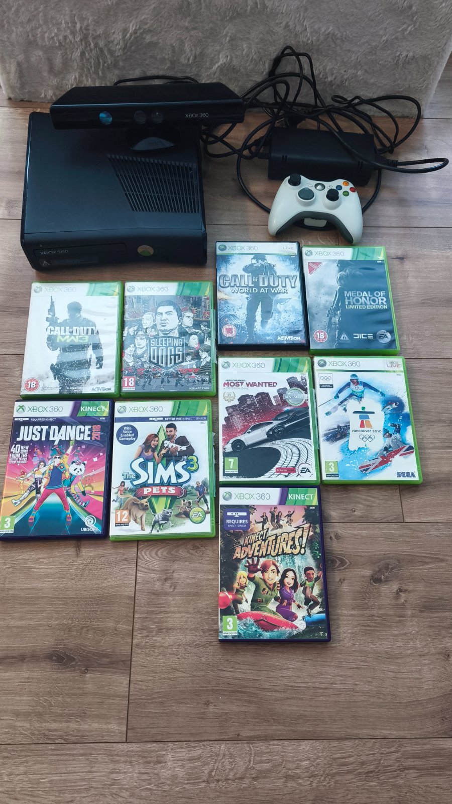 Xbox je plne funkčný bez poškodenia , kinect je tiez bez poškodenia funguje na 100% , ovládač je na baterky , 9 hier v originálnom obale bez škrabancov
