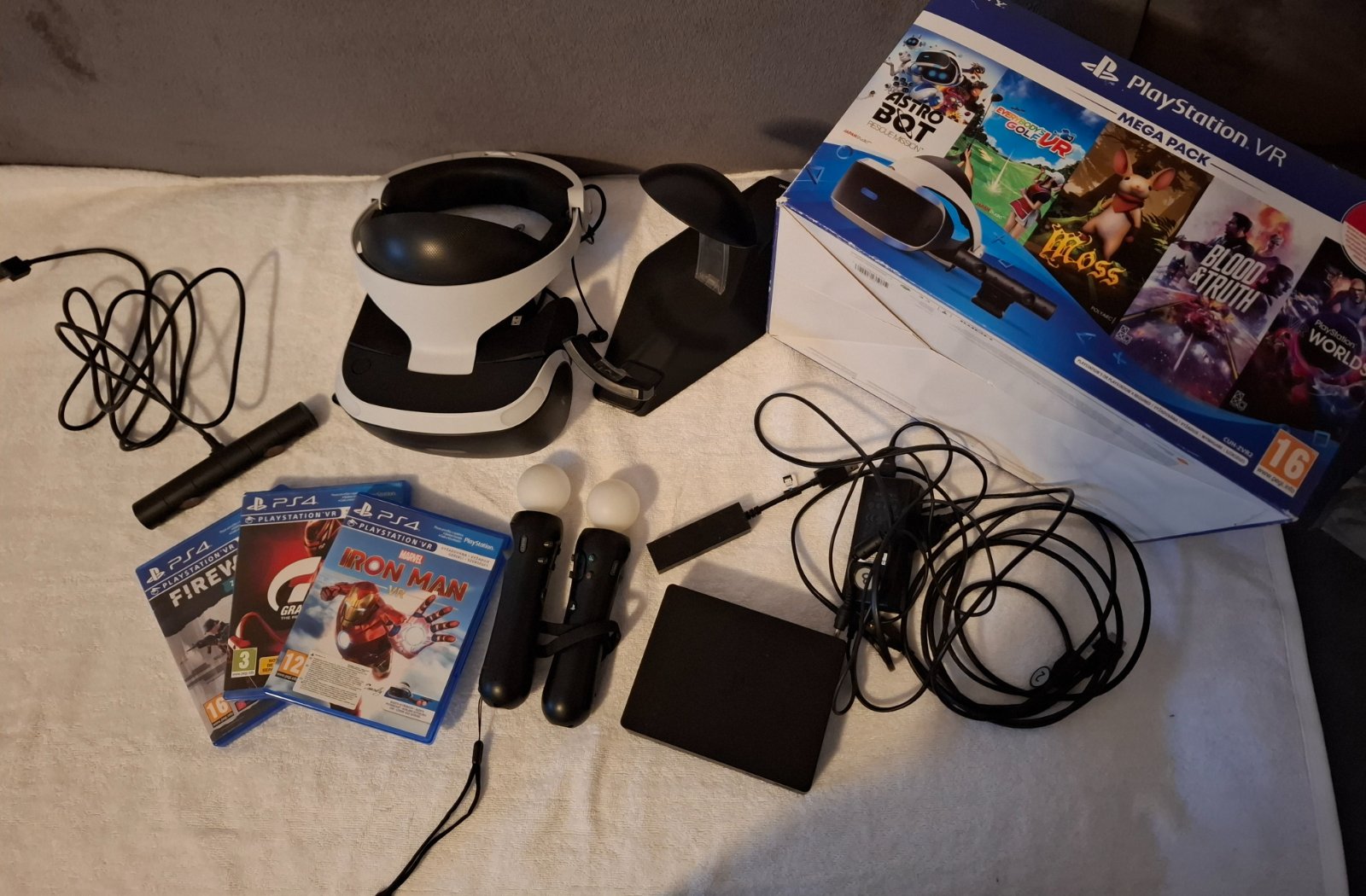 Predám Sony Playstion VR2 V2 + camera na PS4/PS5 + držiak na VR headset, 2 movie ovládače a 3 hry na VR Grand Turisimi Sport a Marvel Iron Man a Firewall.