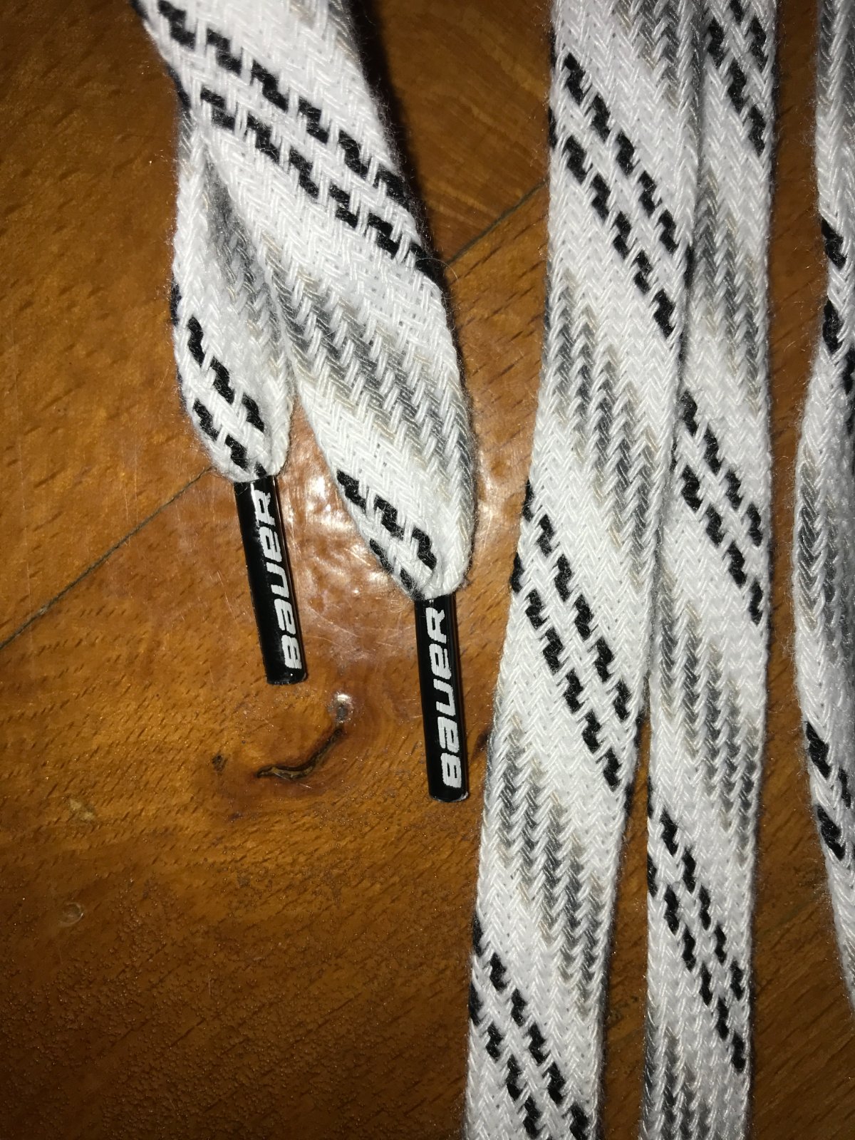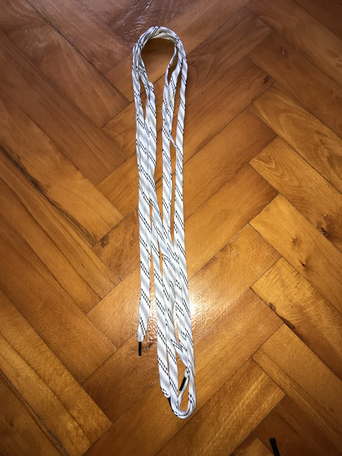 biele športové šnúrky so šedými a čiernymi prúžkami