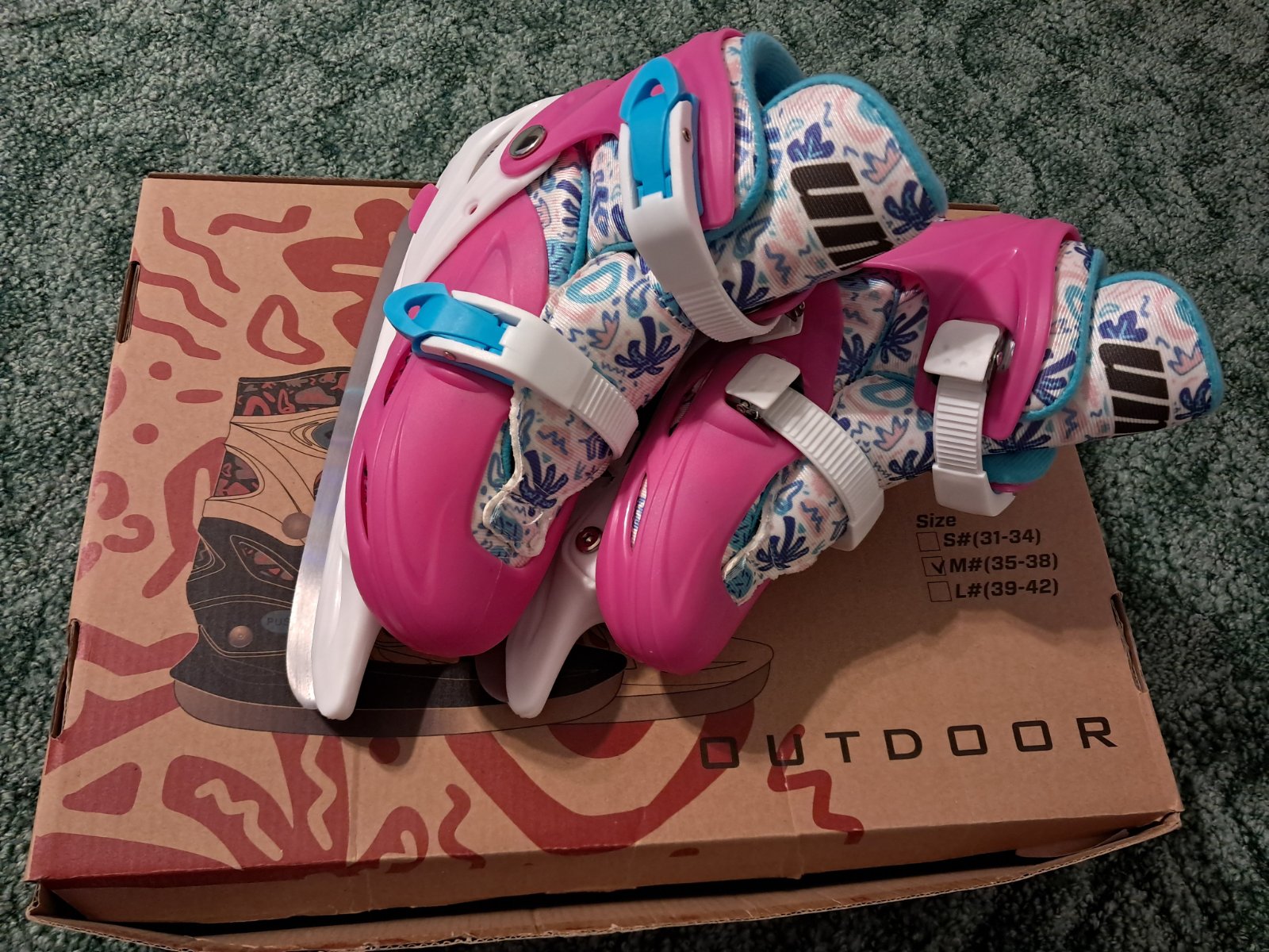 Nastaviteľné korčule veľkosť S od 31 po 34 s vymeniteľnými podvozkom na zimné alebo letné korčuľovanie. Zimné : nerezový nôž dievčenský model s krasokorčuliarskym nožom so zubkami. Letné : kolies...