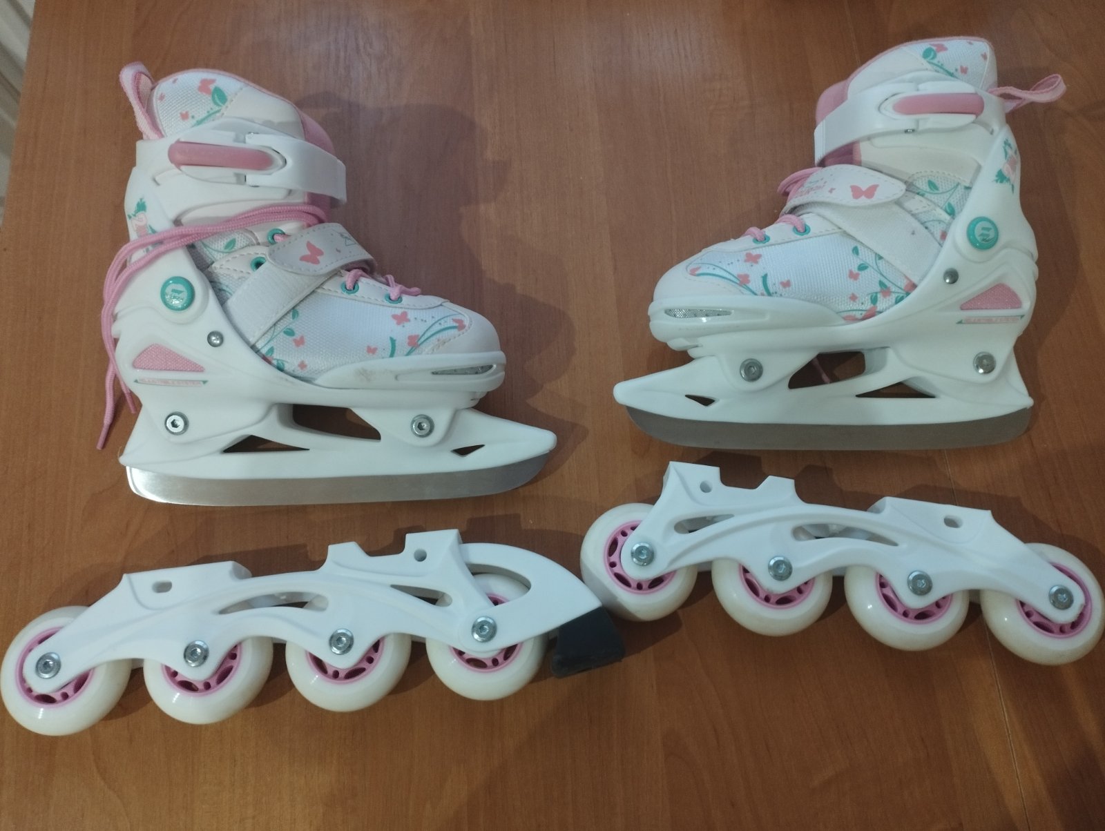 Dievčenské korčule na ľad i na cestu. Ľahko sa prehadzujú, sú rastúce od veľkosti 29 do 32. Sú síce používané a sem tam oškreté, na funkčnosti to však nič nemení :)