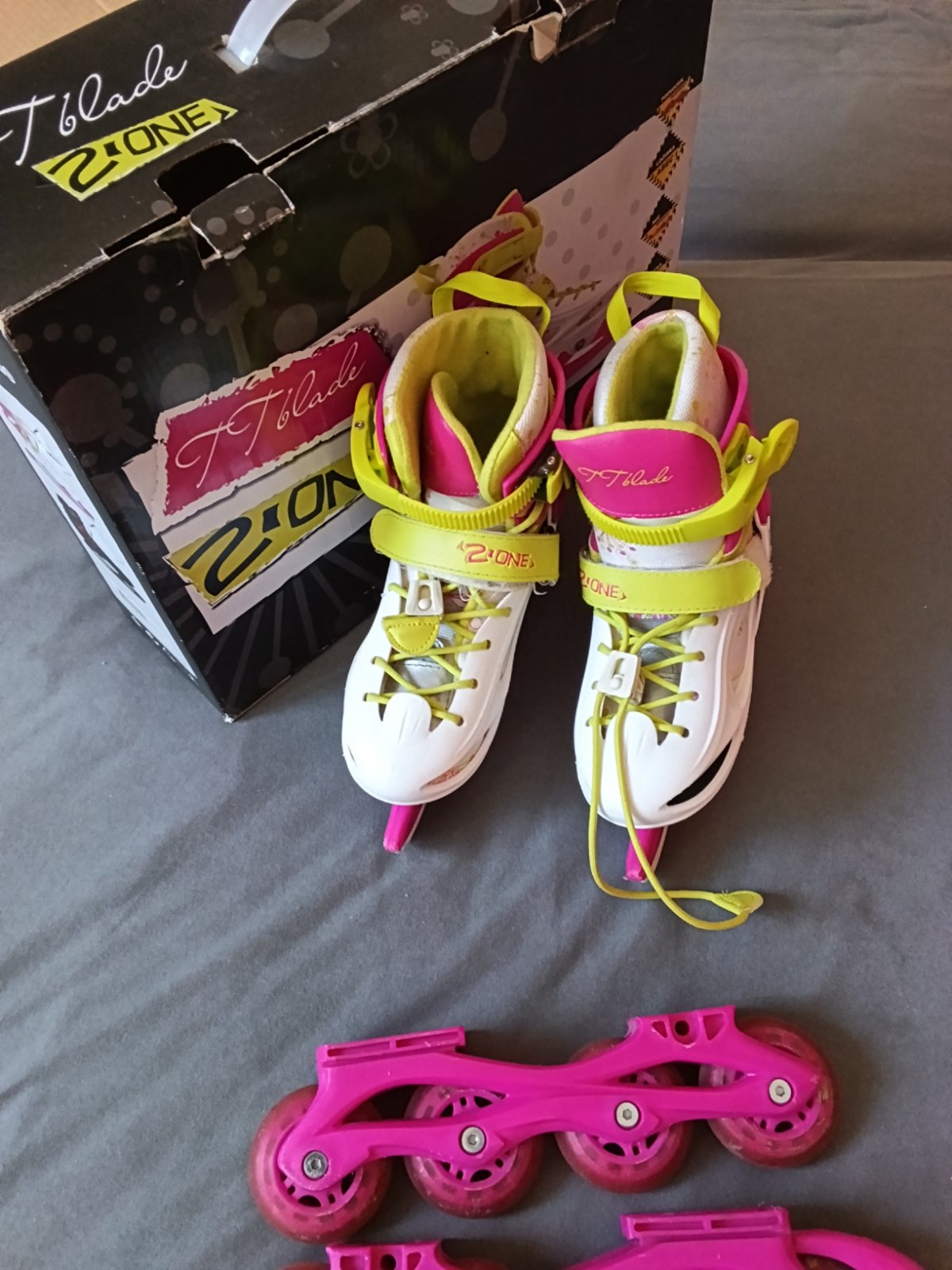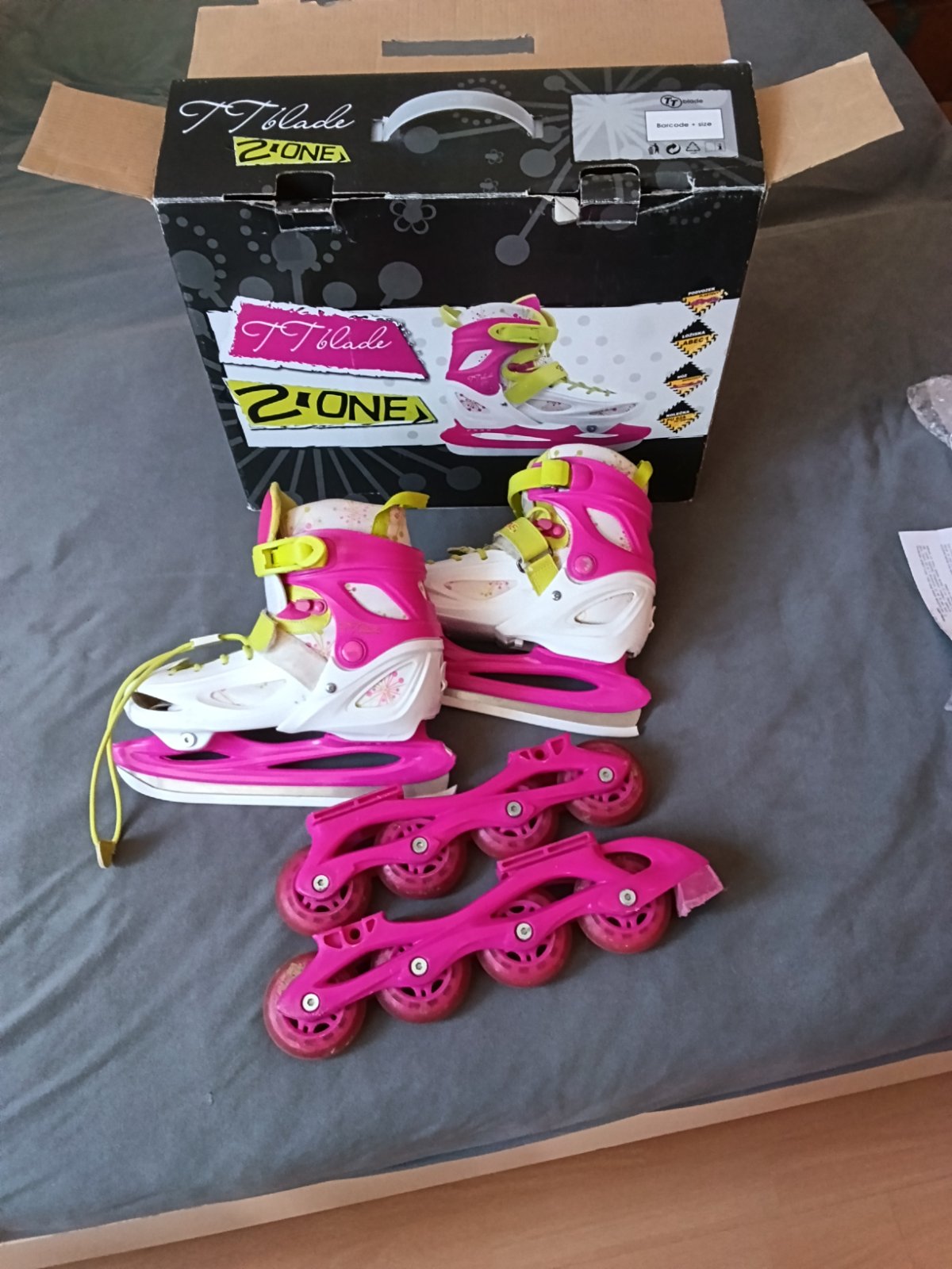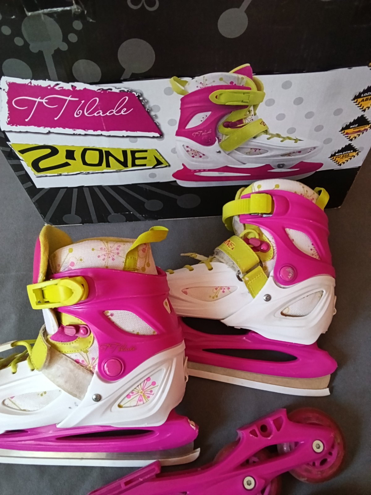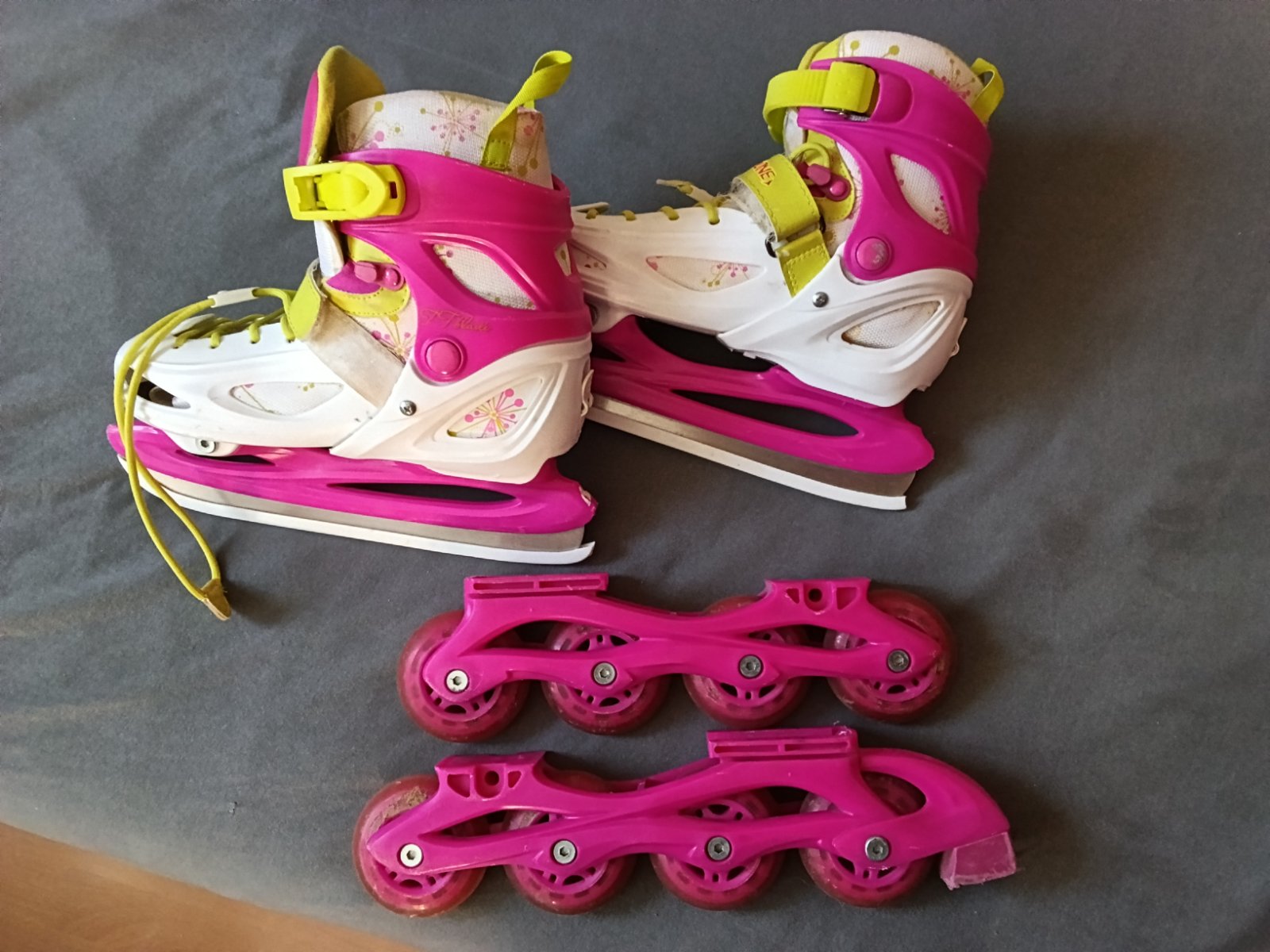 Ponúkam korčule 2v1 ( na ľad a kolieskové), nastaviteľné 34-37. Pekný stav, škrabančeky sa nájdu.