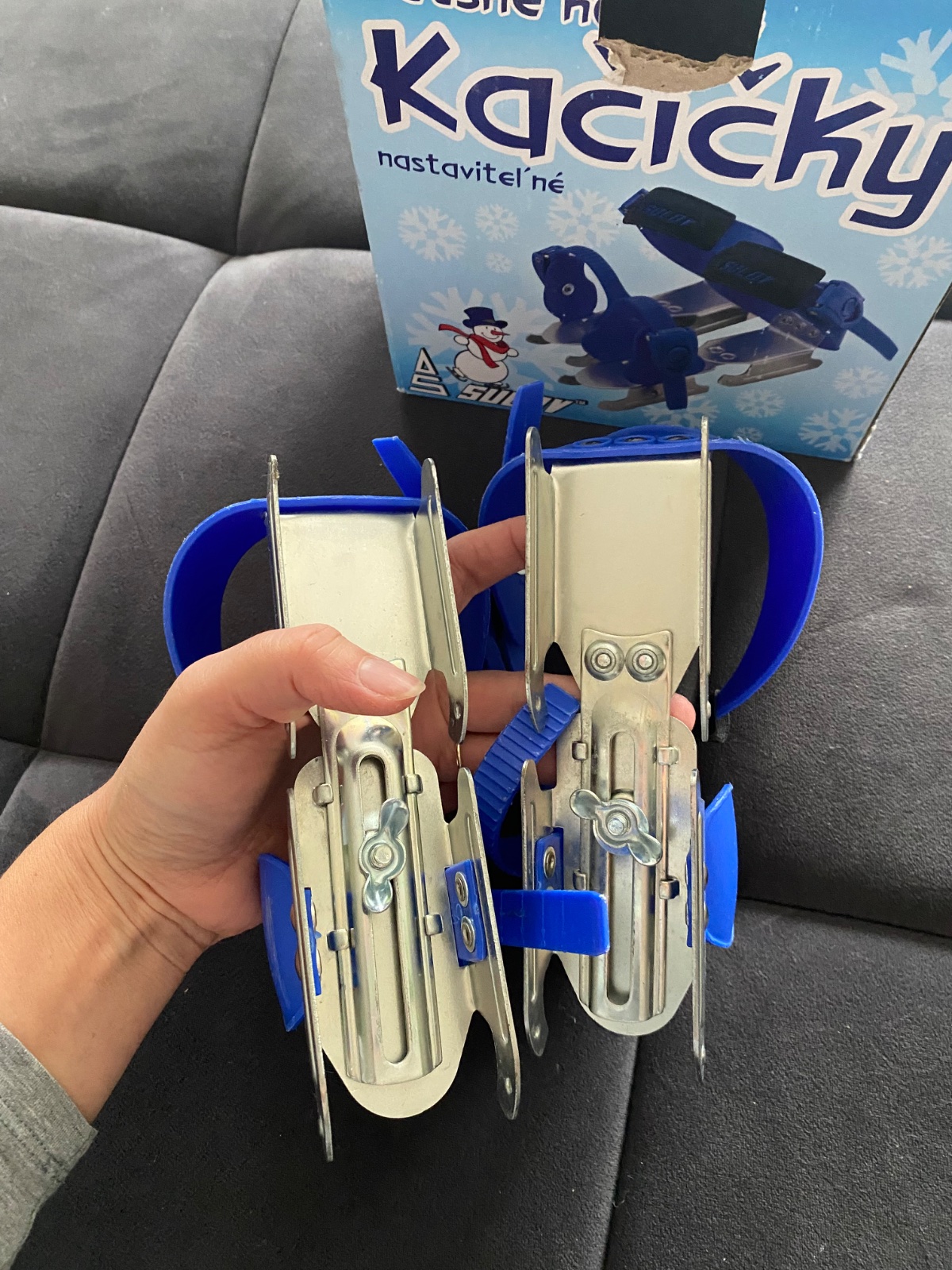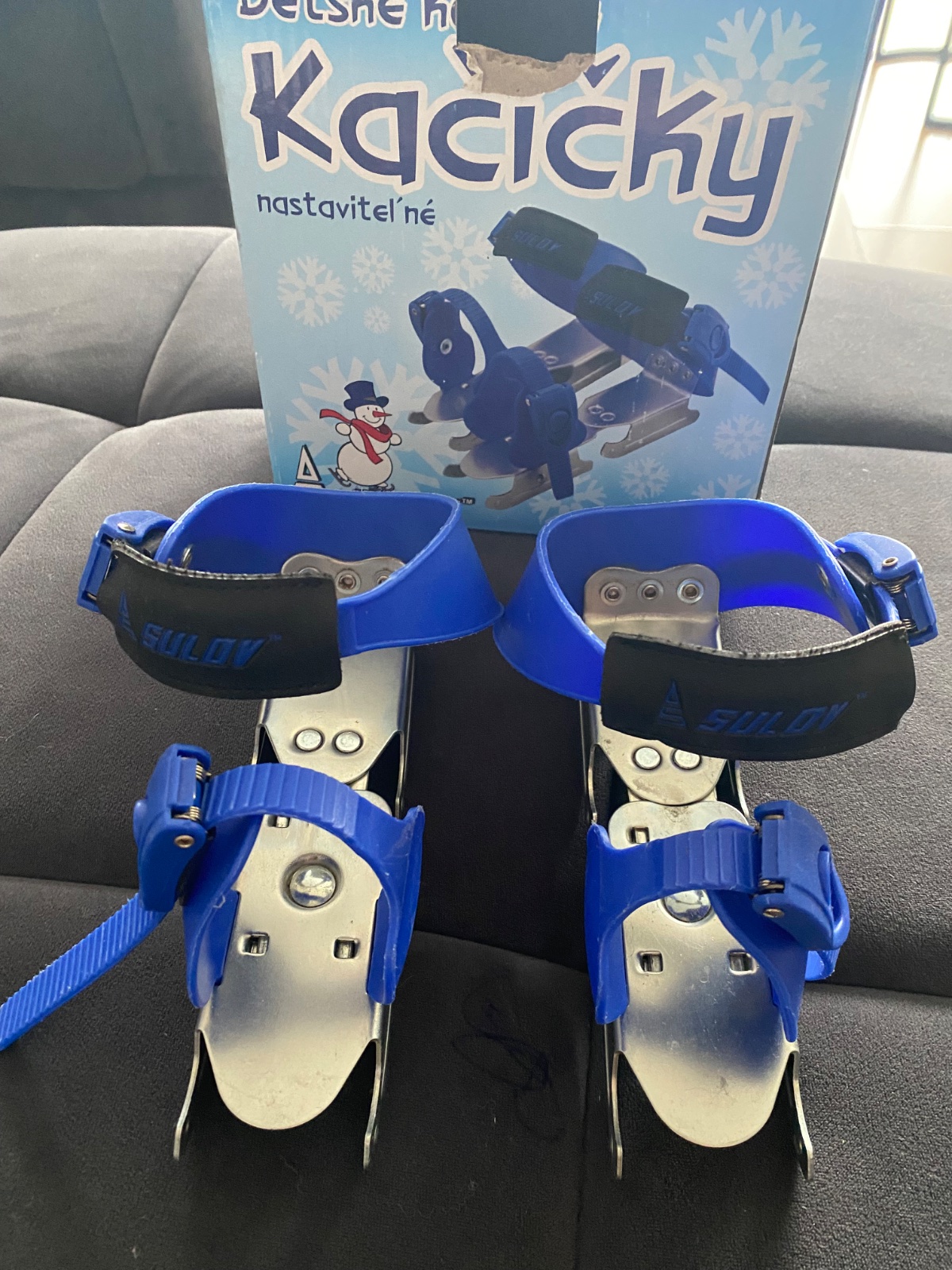 Kačičky na prvé kroky na ľade, na detské topánočky …. Posuvná veľkosť, takže dajú sa prispôsobiť na rôznu obuv… Bez poškodení, použité pár krát… Cena 10€