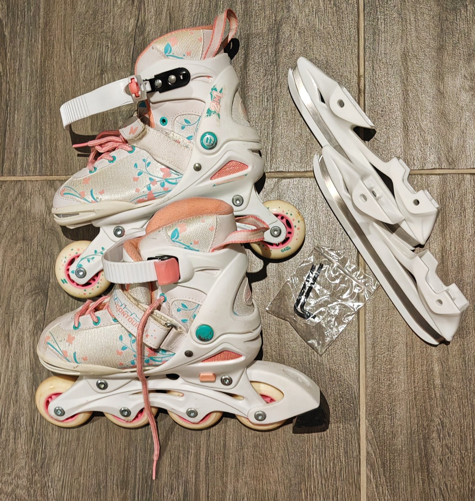 Je to kombinácia ľadové korčule - in-line kolieskové korčule. Ostrie nepoužité. V balení sú kľúče na výmenu spodnej časti. Mám ich v originálnej krabici. Sú ťažšie na prepravu. Ideálne osobný odber.