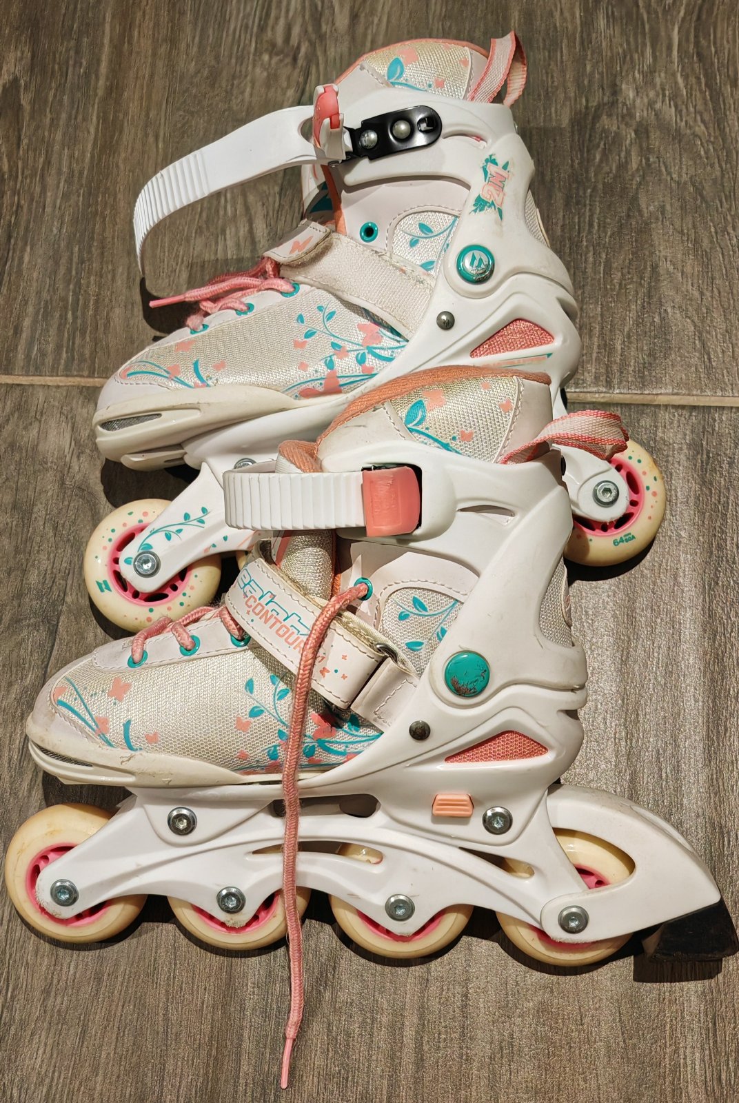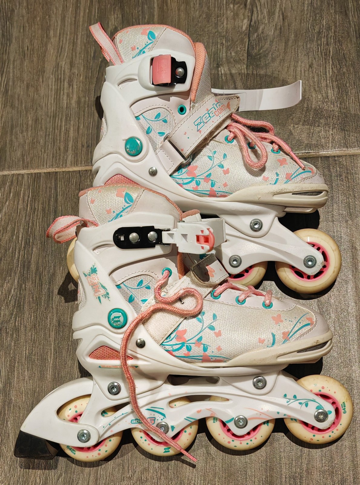 Dievčenské korčule v super stave. Na niektorých miestach trochu oškreté(po pár pádoch), ale nič strašné. Plast akoby jemne zožltol.