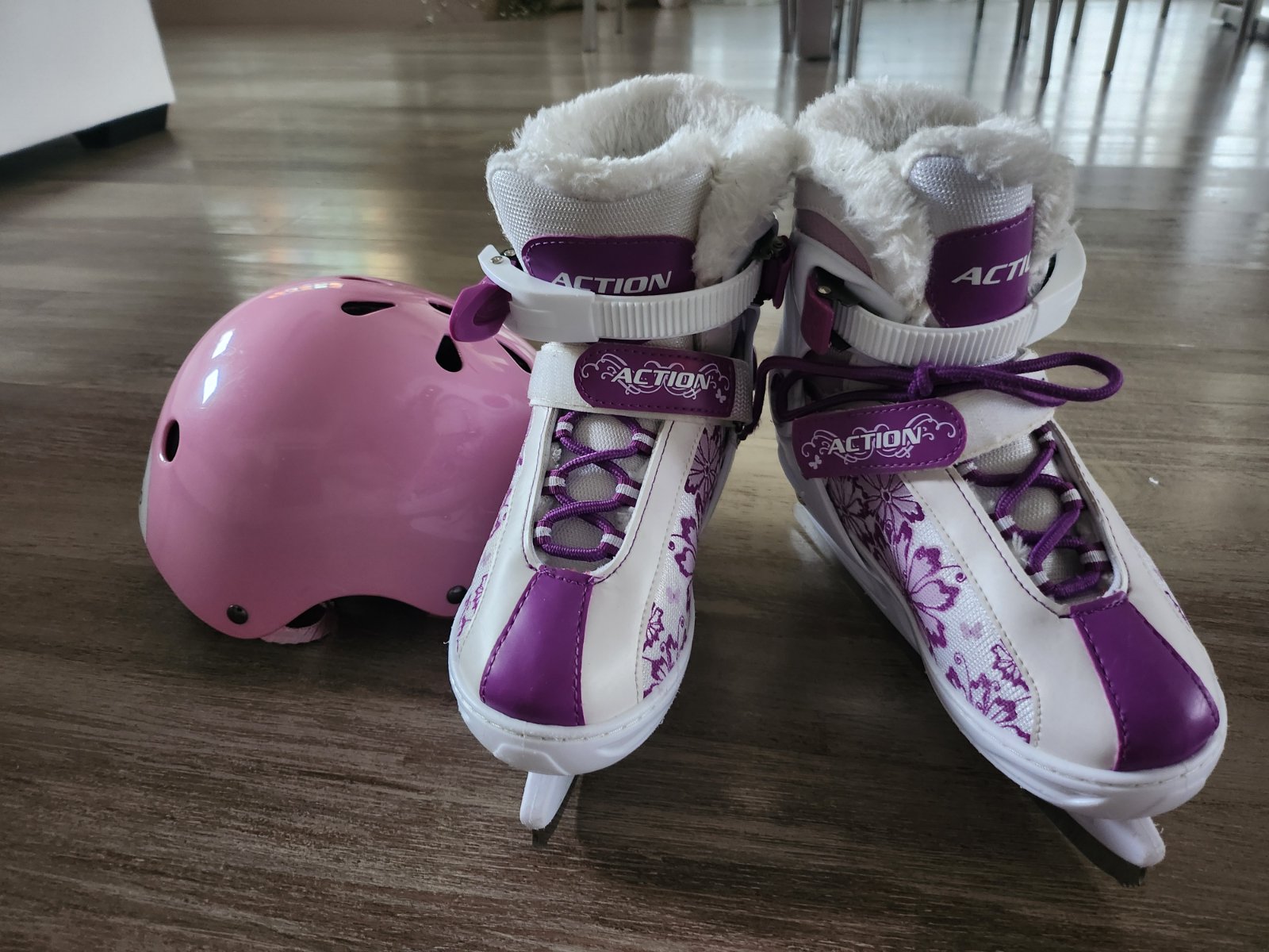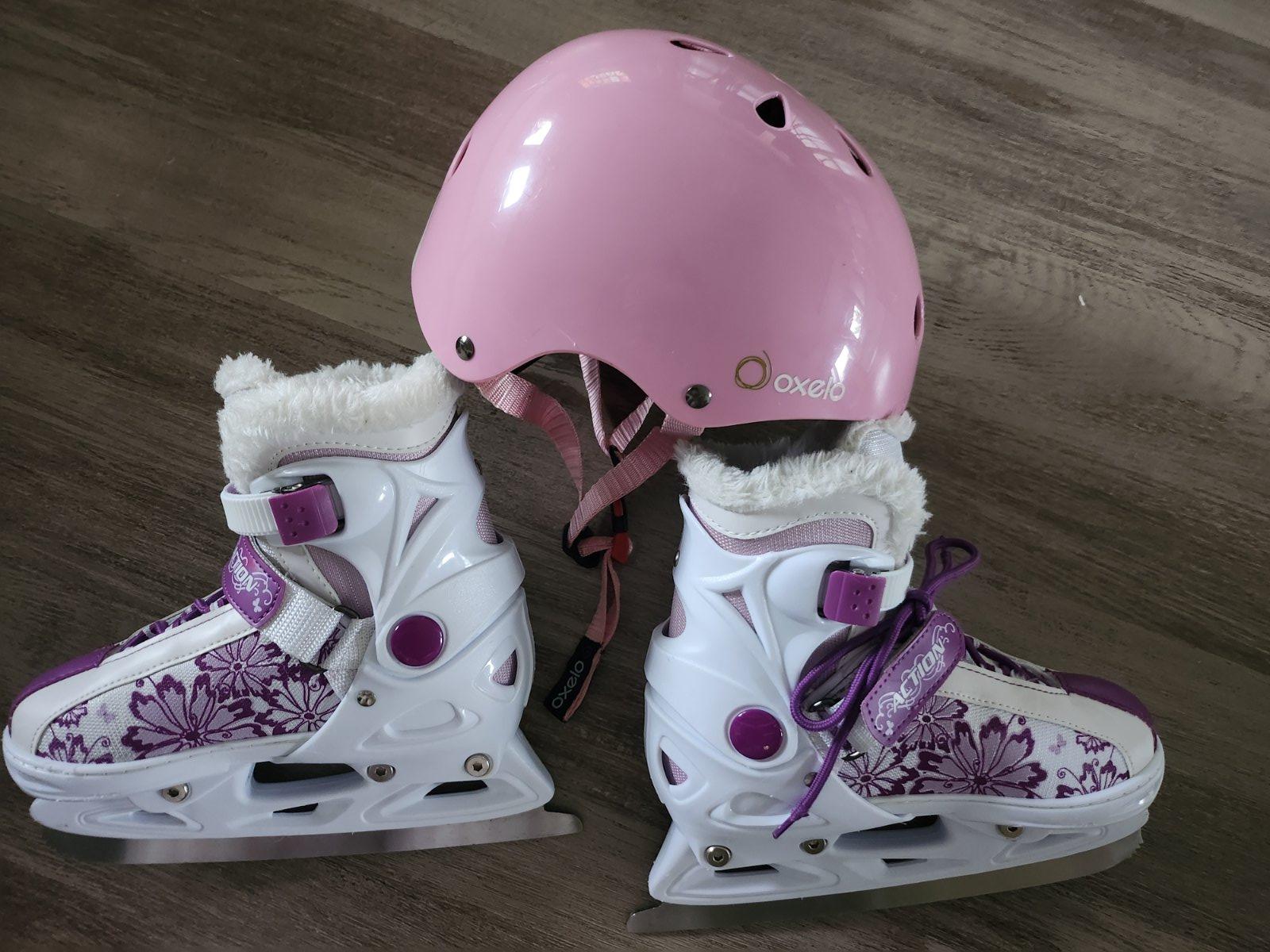 Krásne málo používané detské korčule značky Maripo s fialovymi kvietkami.Korcule sú bielej farby. Velkosť je nastaviteľná 33-36.Pozri posledné foto. Predávam k tomu aj prilbu nastaviteľnu značky Oxelo. Cena spolu 30 eur
