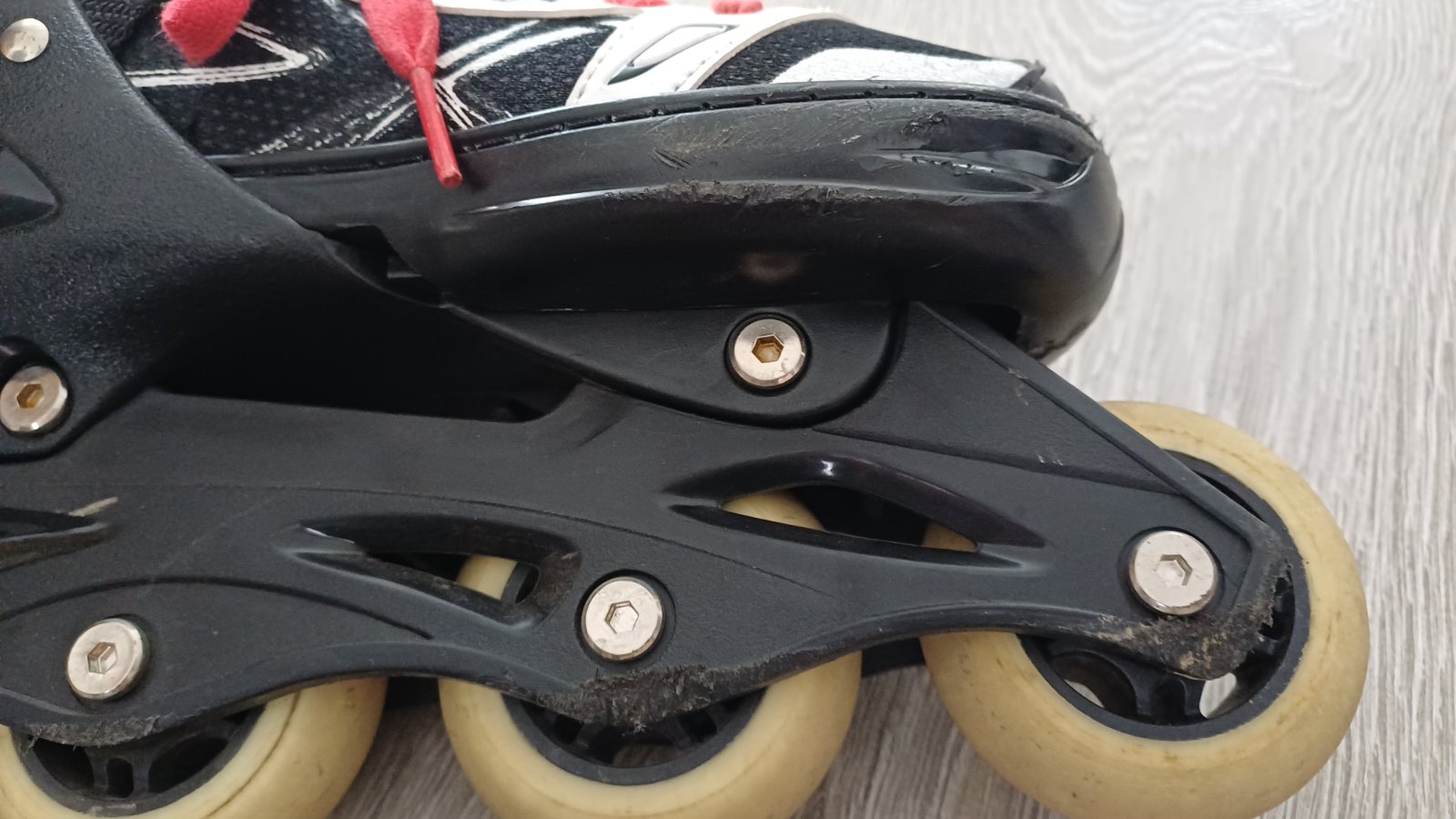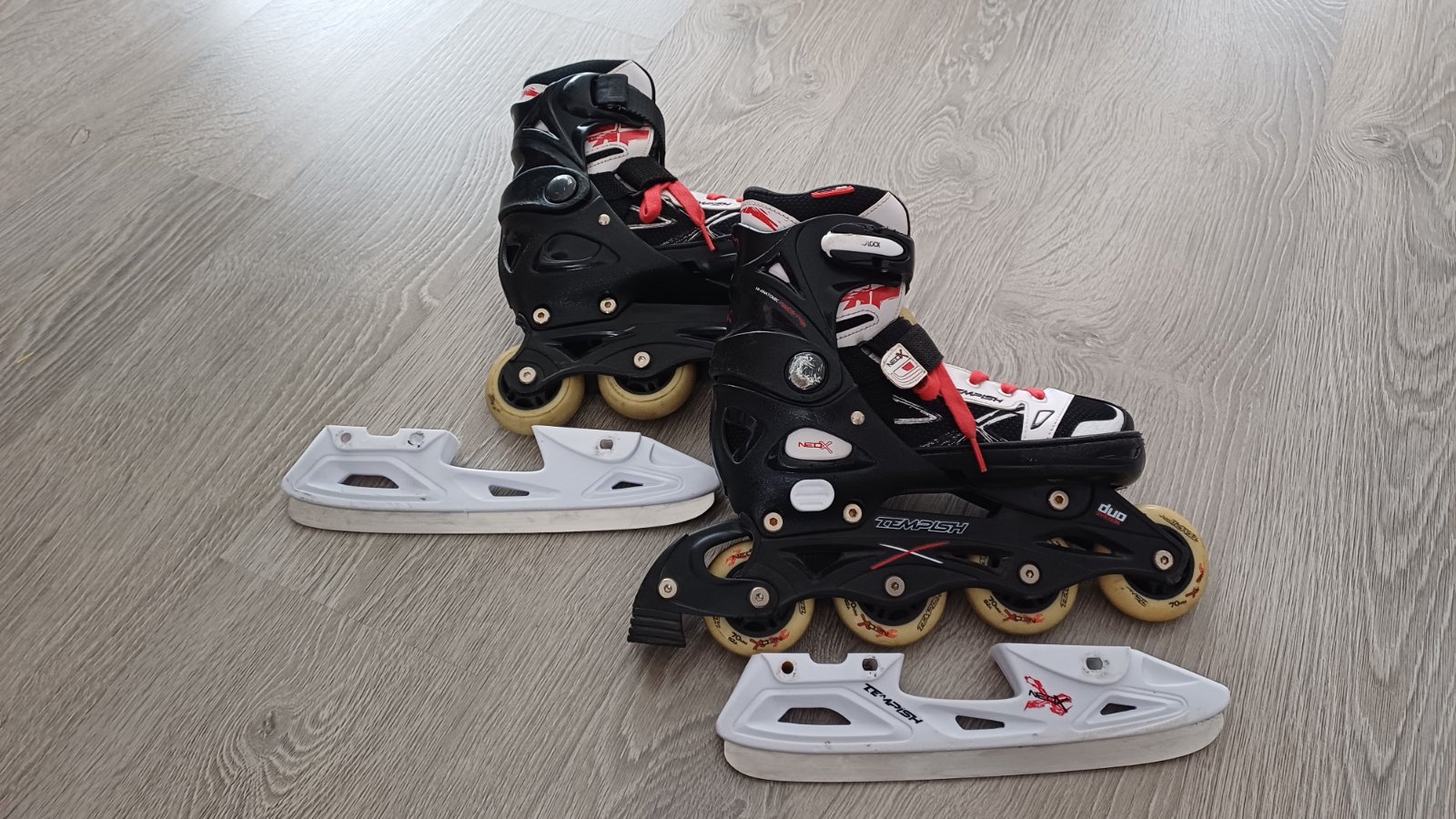 Posuvné korčule veľkosť 37-40. Vymeniteľné nože, takže využiteľné v lete aj v zime 🙂. Osuchane, ale plne funkčné