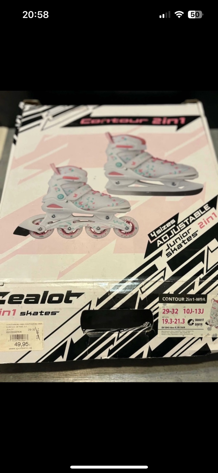 Posuvne korčule na ľad 31-34 velkost. Stav nafoteny. Maju malu vadu /nafotene/ plastové upinanie prasklo. Zatiaľ to drží, šikovný tatinom vie opraviť ak by povolili. Inak stačí ak bude držať lepi...