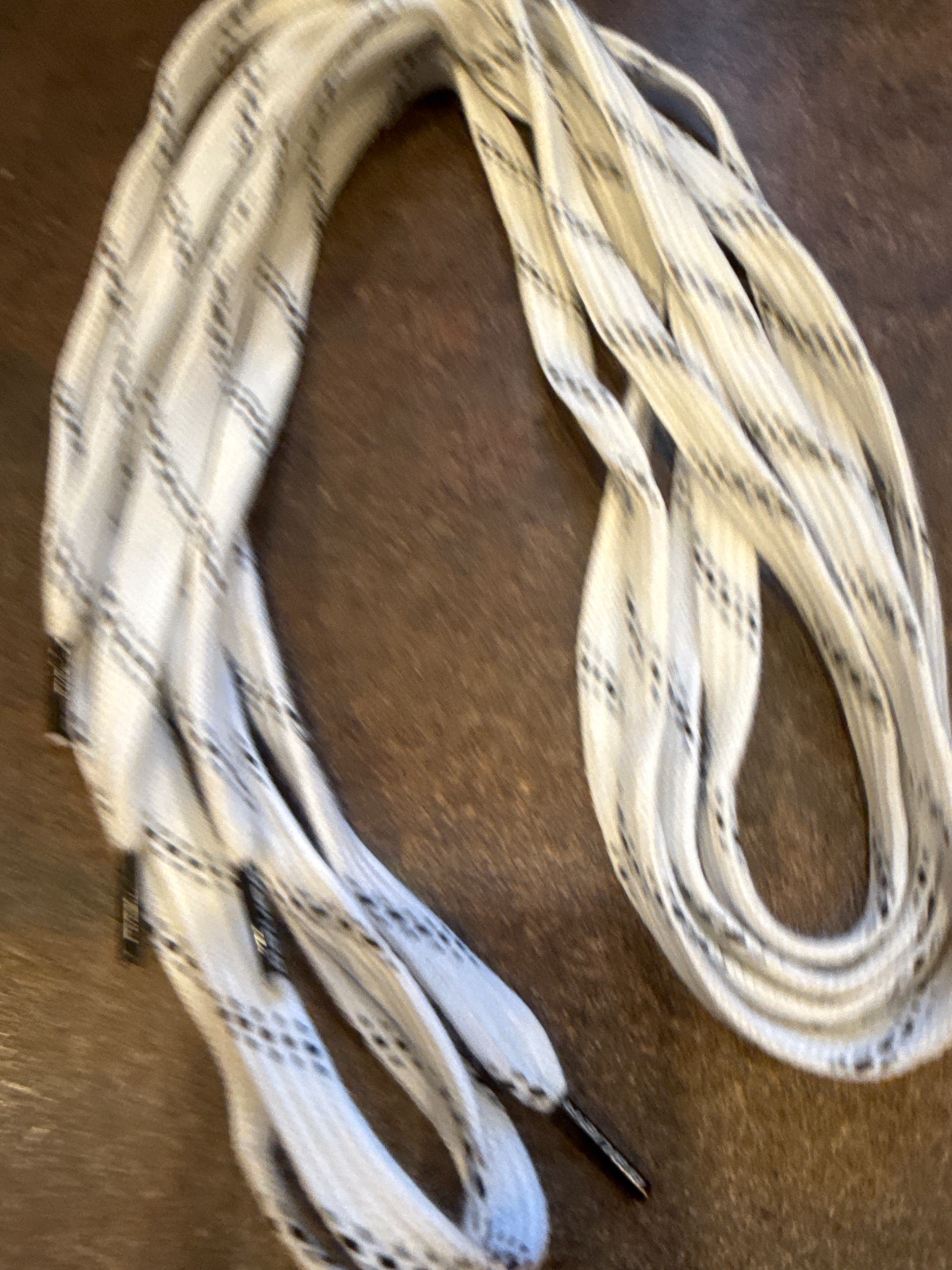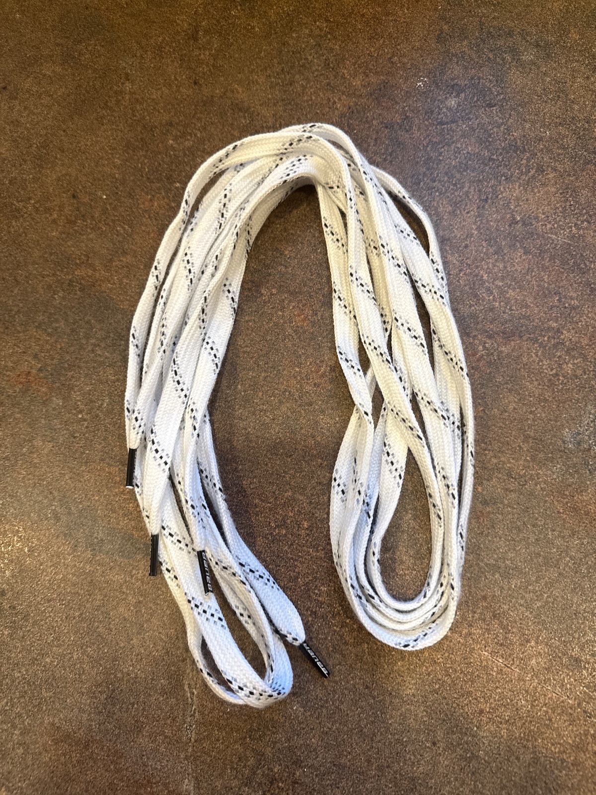 Predám originálne BAUER hokejové šnúrky v bielej farbe s čiernym vzorom. Kvalitný pevný bavlnený materiál so zosilnenými plastovými koncovkami. Vhodné do hokejových korčúľ alebo aj ako štýlové šnúrky do obuvi.