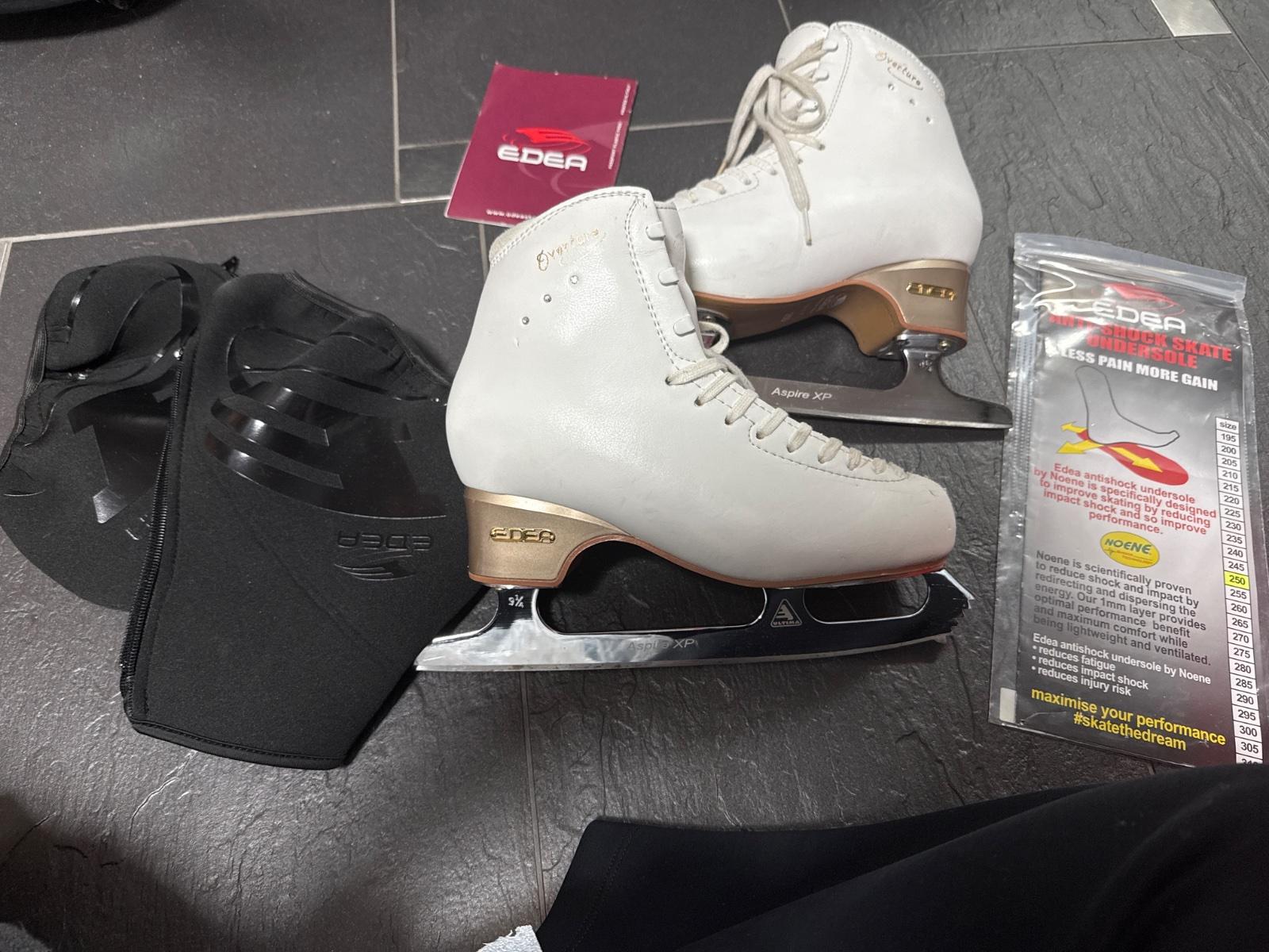Profesionálne krasokorčuliarske korcule Edea Overture s nožmi aspire xp 9 1/4, antišokovymi vložkami a neoprénovými navlekmi Edea, top stav, číslovanie 37,5.