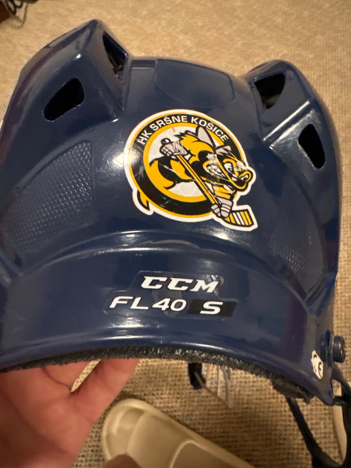 Helma CCM Fitlite 40. Je to veľkosť S/M. Táto helma využíva technológiu FIT CLIPS. Systém voľného nastavenie veľkosti prilby. Vložka je vyyrobená z pohodlenej penovej vystélky. Helma má aerodynamický tvar s ventilačnými prieduchmi. Prilba je dodávaná spolu s mriežkou CCM Fitlite 40, ktorá má komfortnú penovú ochranu na bradu. Je nastaviteľná na obvod hlavy. Nie je prasknutá ani inak poškodená.