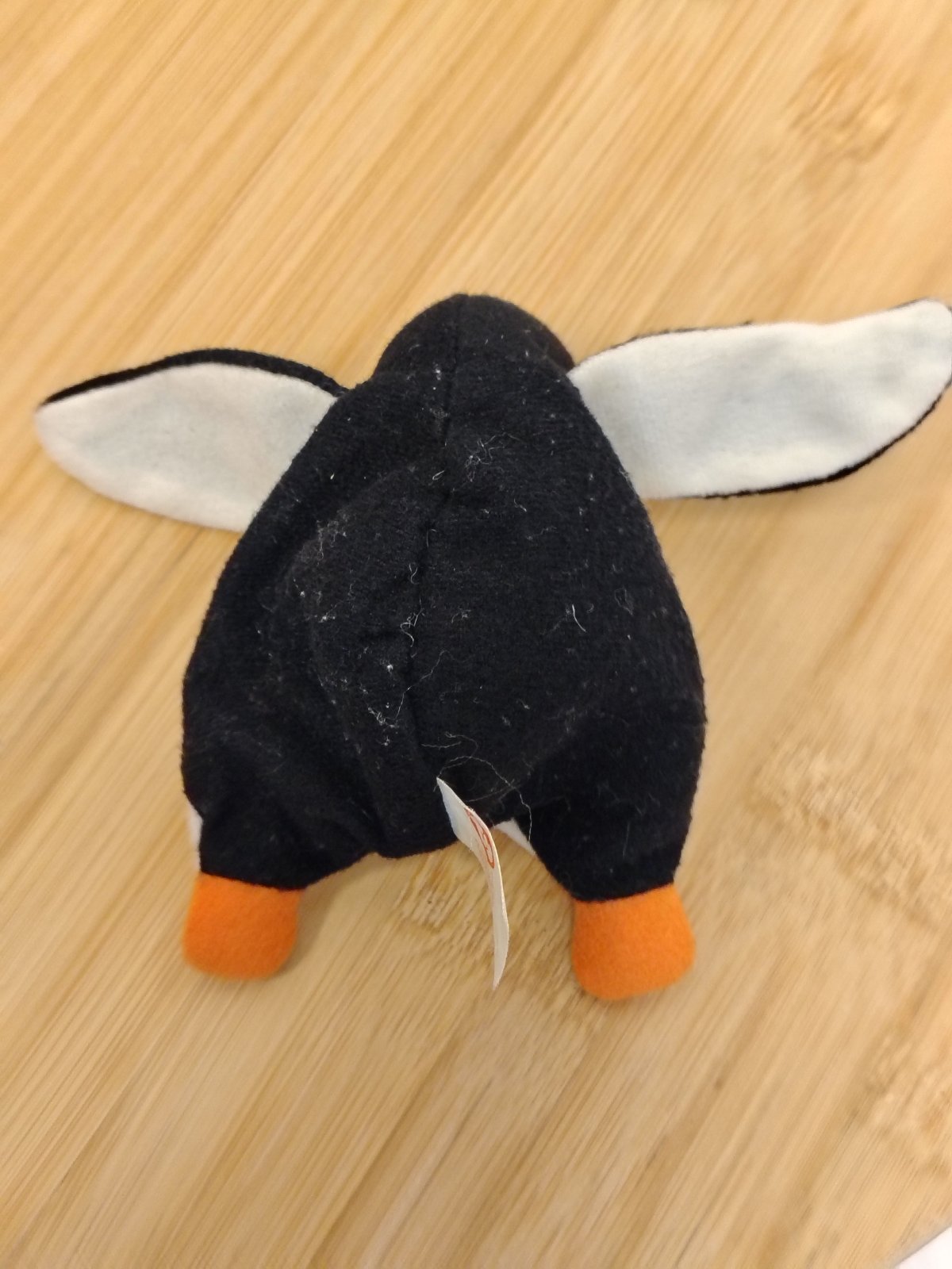 Retro plyšový Tučniak Waddle, ide o originálnu mini verziu obľúbeného Beanie Baby tučniaka s menom Waddle. Ide o limitovanú edíciu vyrobenú exkluzívne pre McDonald's v roku 1998, je to zmenšená verzia určená výhradne pre McDonald's Happy Meal. má čierne telo s bielym bruškom, žltým „golierom“ okolo krku a oranžovým zobákom a nohami, výplň tvoria polyesterové vlákna a plastové pelety, čo je typické pre túto ikonickú značku 90. rokov, vhodné pre zberateľov retro hračiek, fanúšikov značky Ty alebo ako milá drobnosť pre deti.
