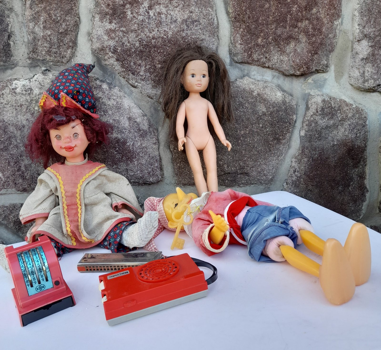 1.Pinocchio s kľúčikom, šaty má poškodené, vyšedivené, trup je v poriadku, 7€+pošt