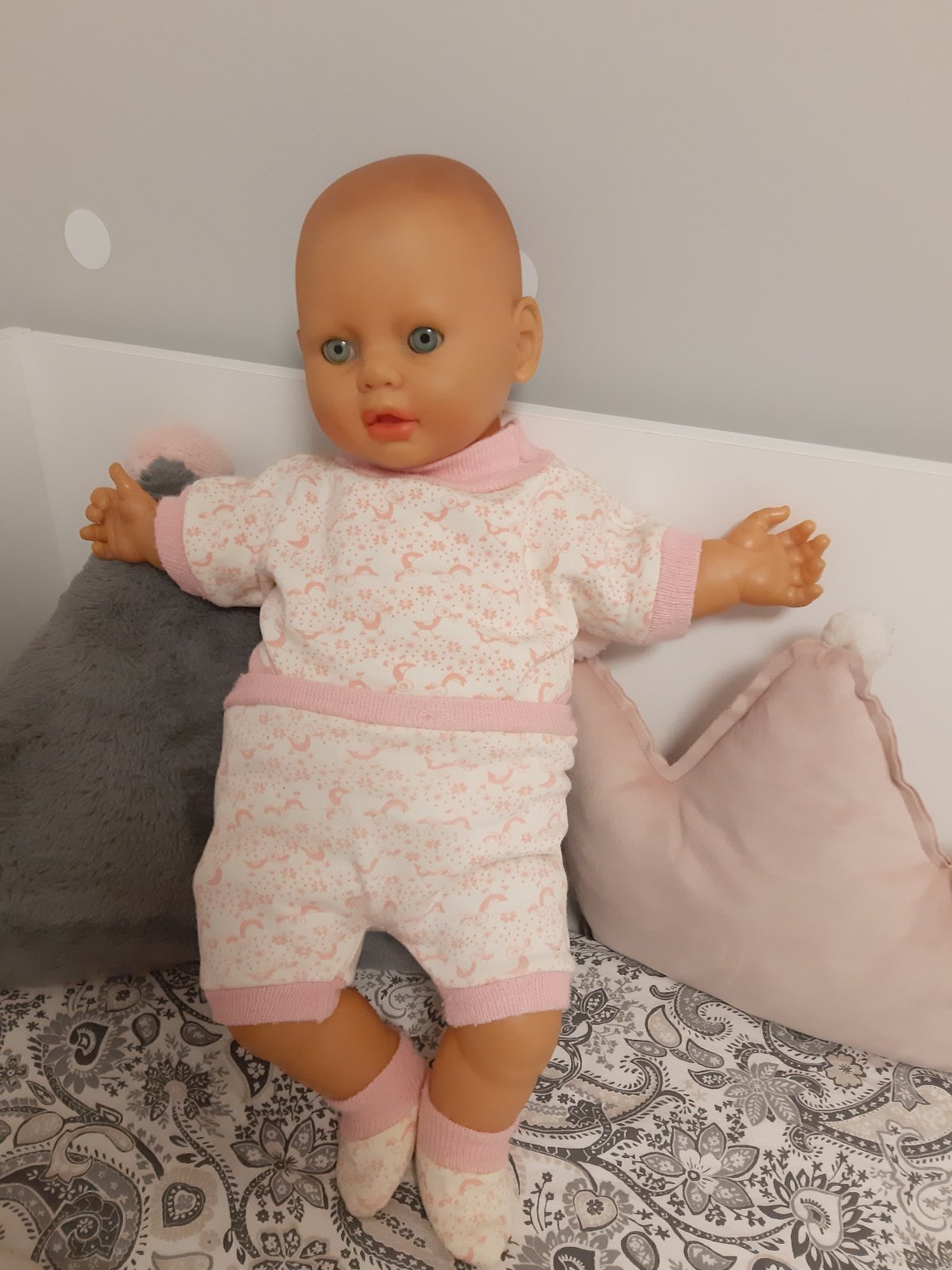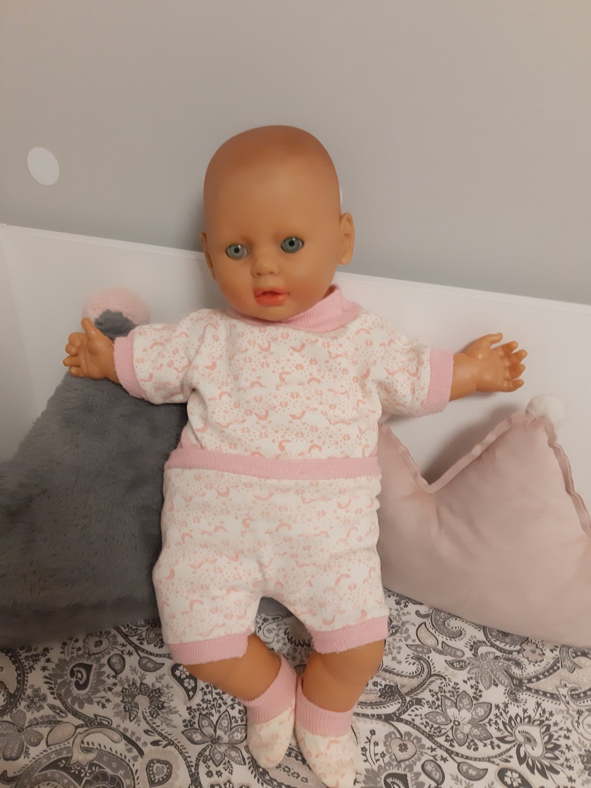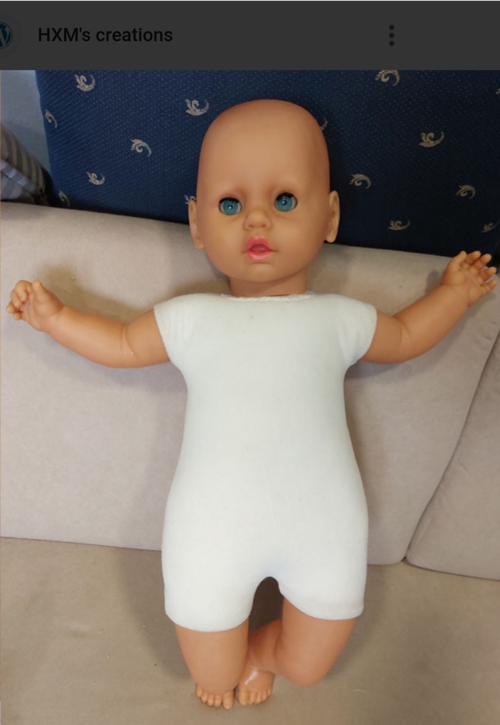 Veľká plešatá bábika s modrými očami, látka a plast.