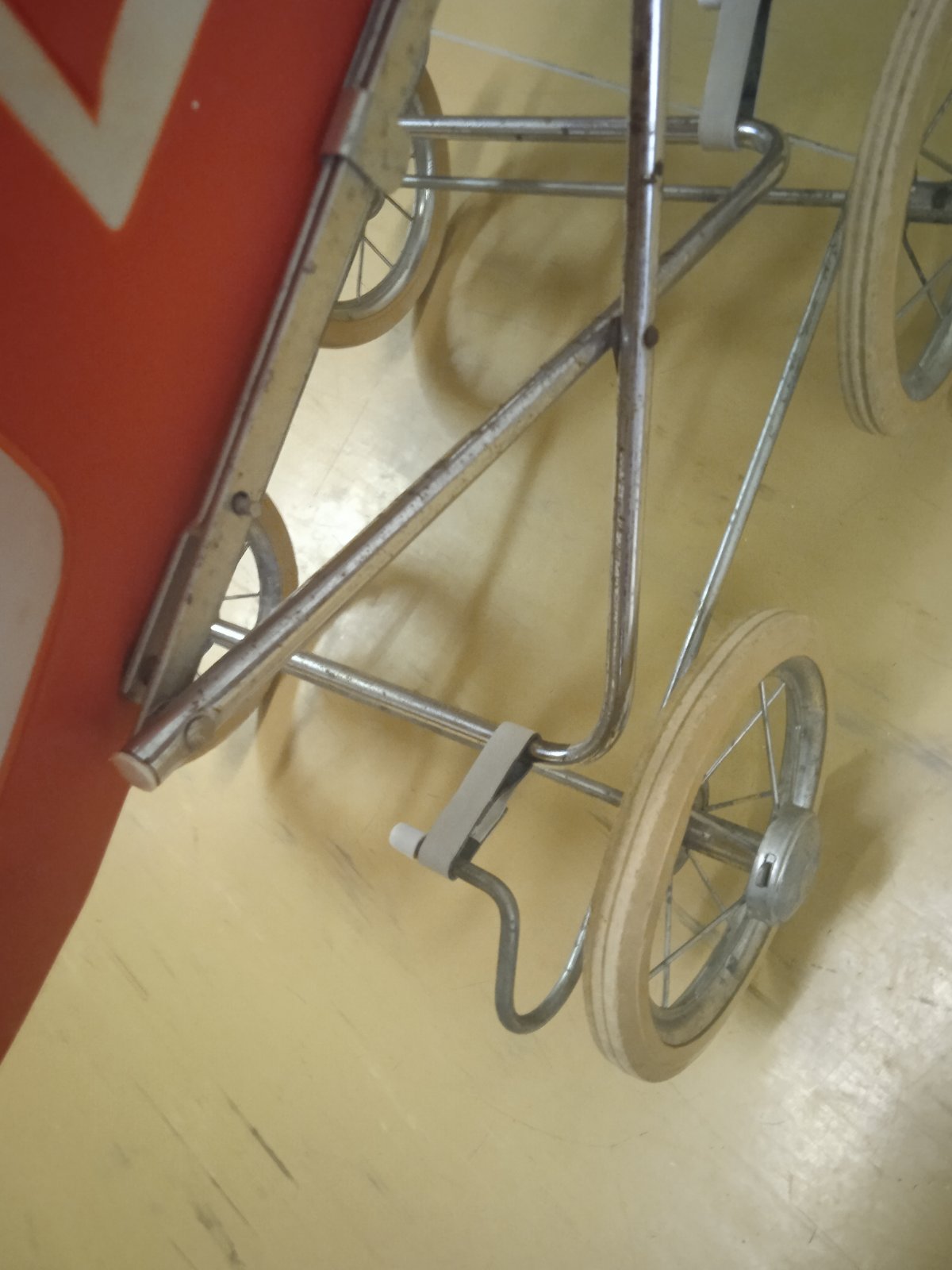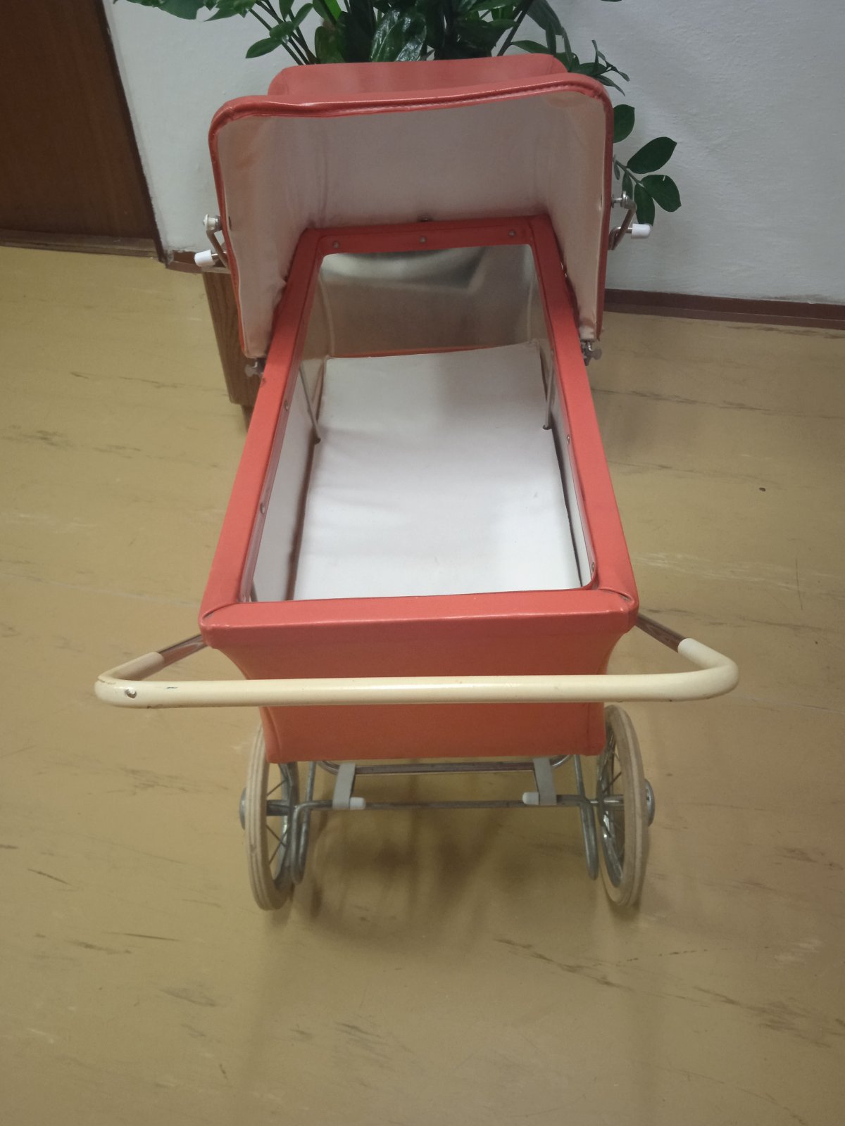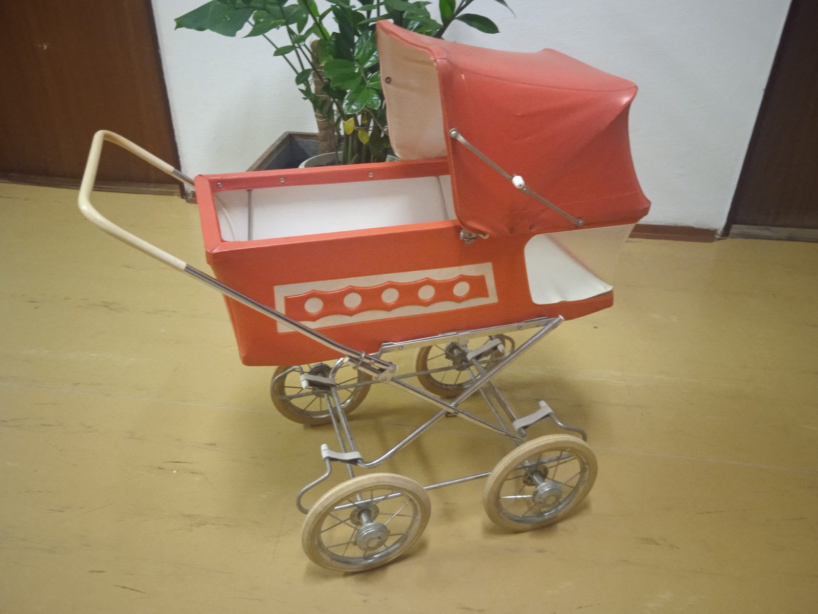 Tento predmet je starožitný kočík pre bábiky, ktorý sa vyznačuje retro dizajnom typickým pre 60. až 70. roky 20. storočia.