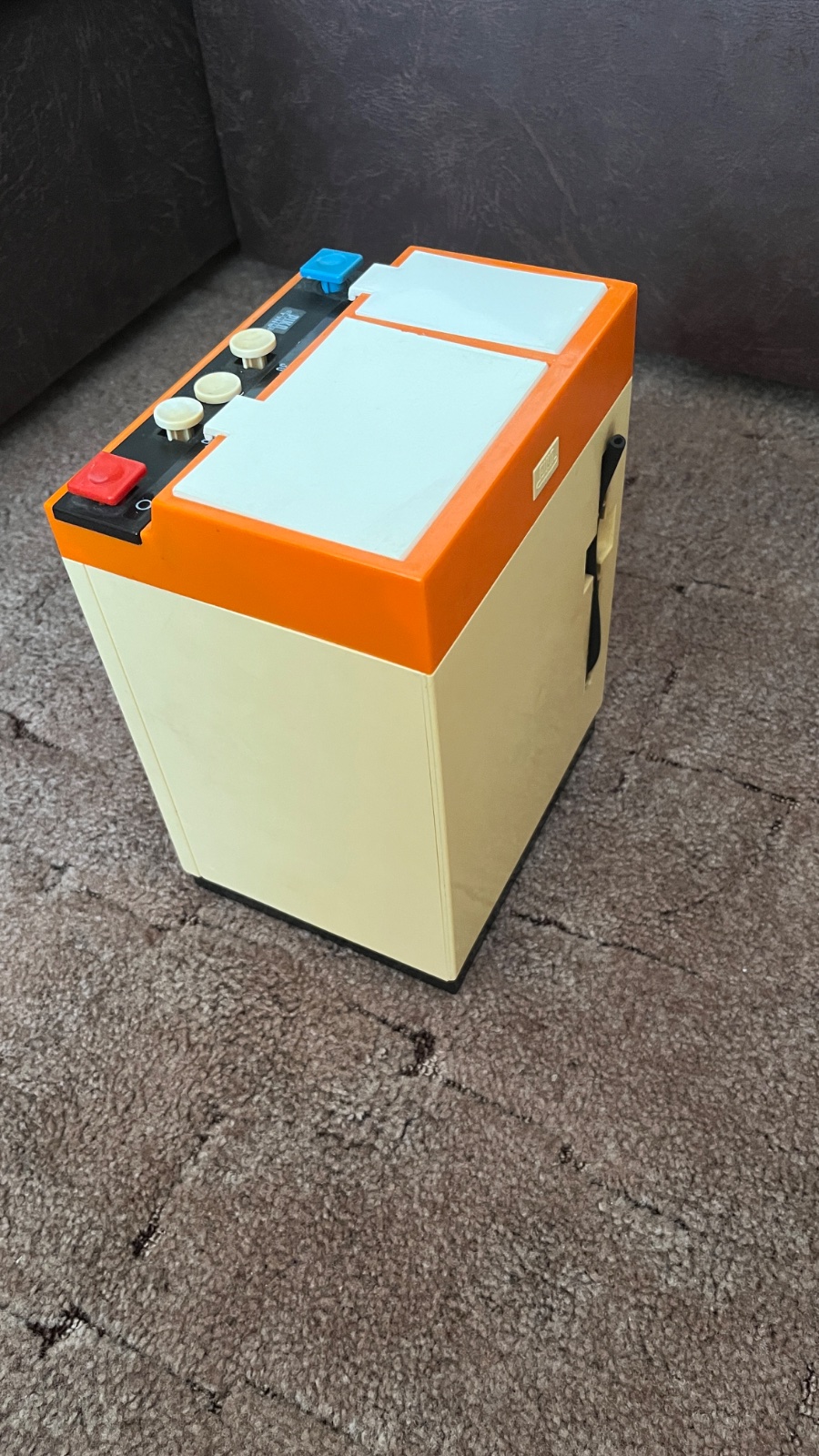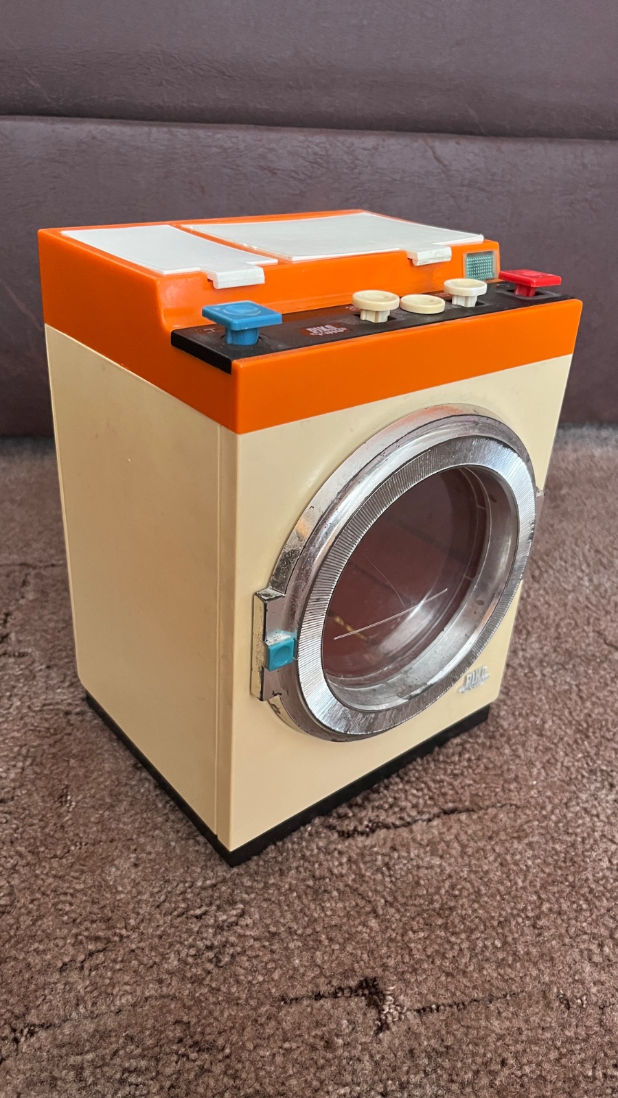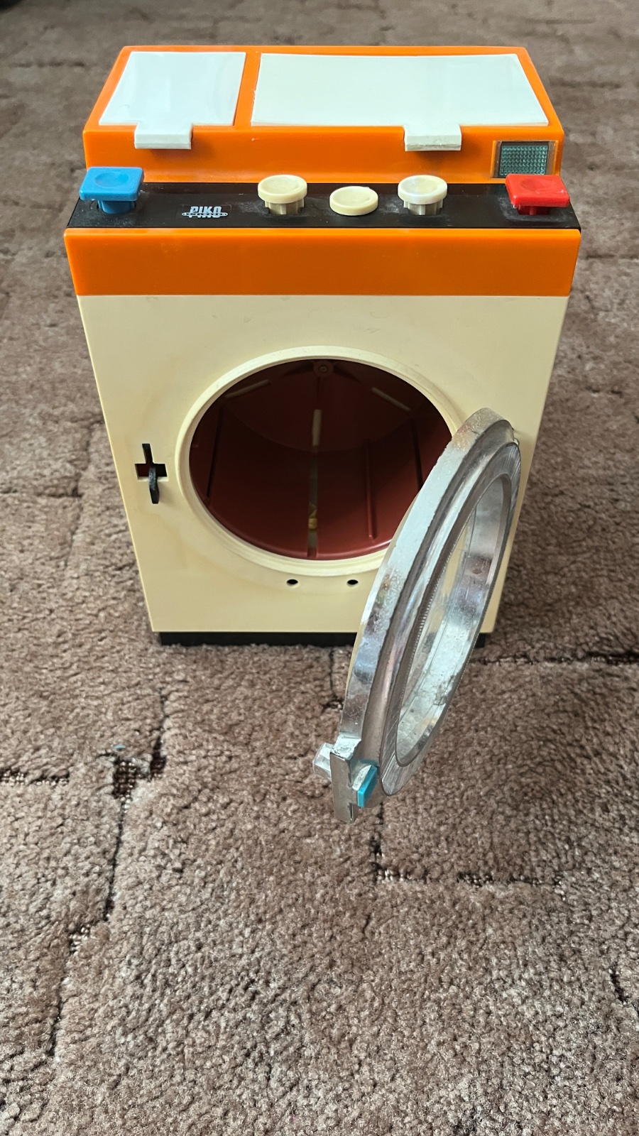 Detská práčka,ktorá kedysi “prala” s vodou a tú následne vypúšťala. Možno by to dokázala aj teraz,no nemáme vhodnú baterku (retro štvorcová). Domáci kutil by to prípadne snáď vedel aj opraviť.